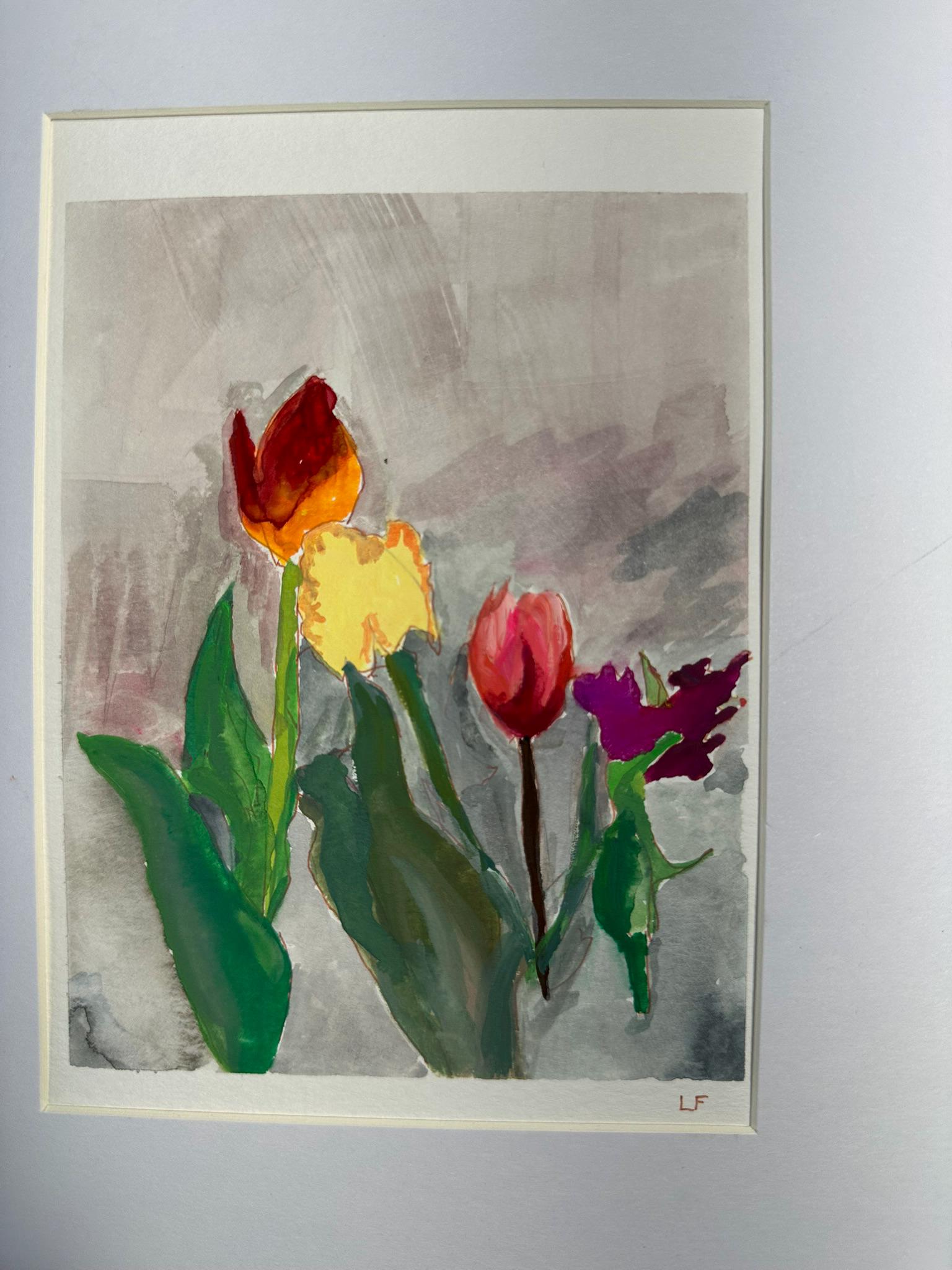 Original painting of 4 tulips, from an original photo. Gouache and ink on watercolor paper. Black wood frame can be included. Size including the frame is 11 x 9 inches. Image size is 6 x 4.5 inches.