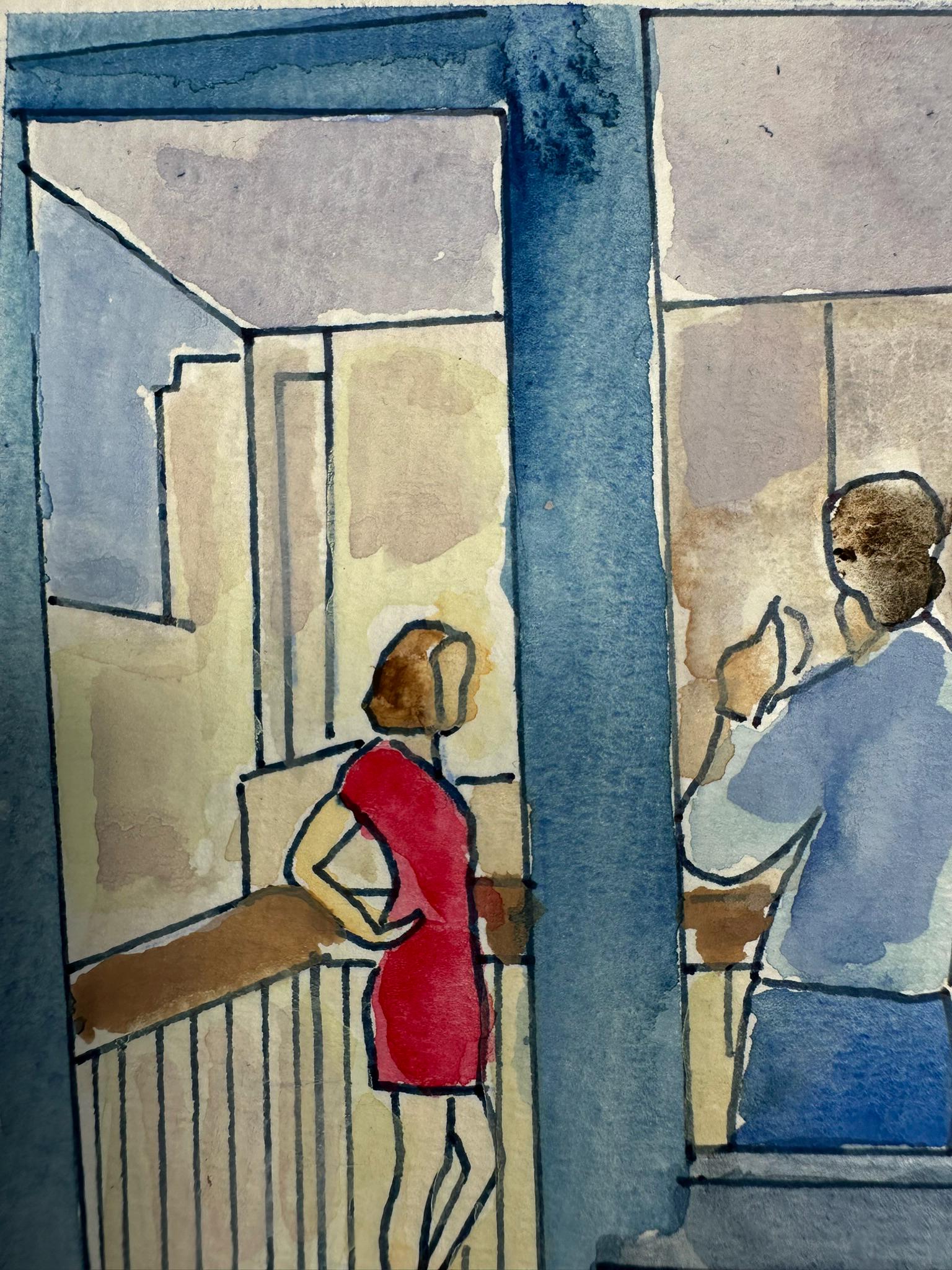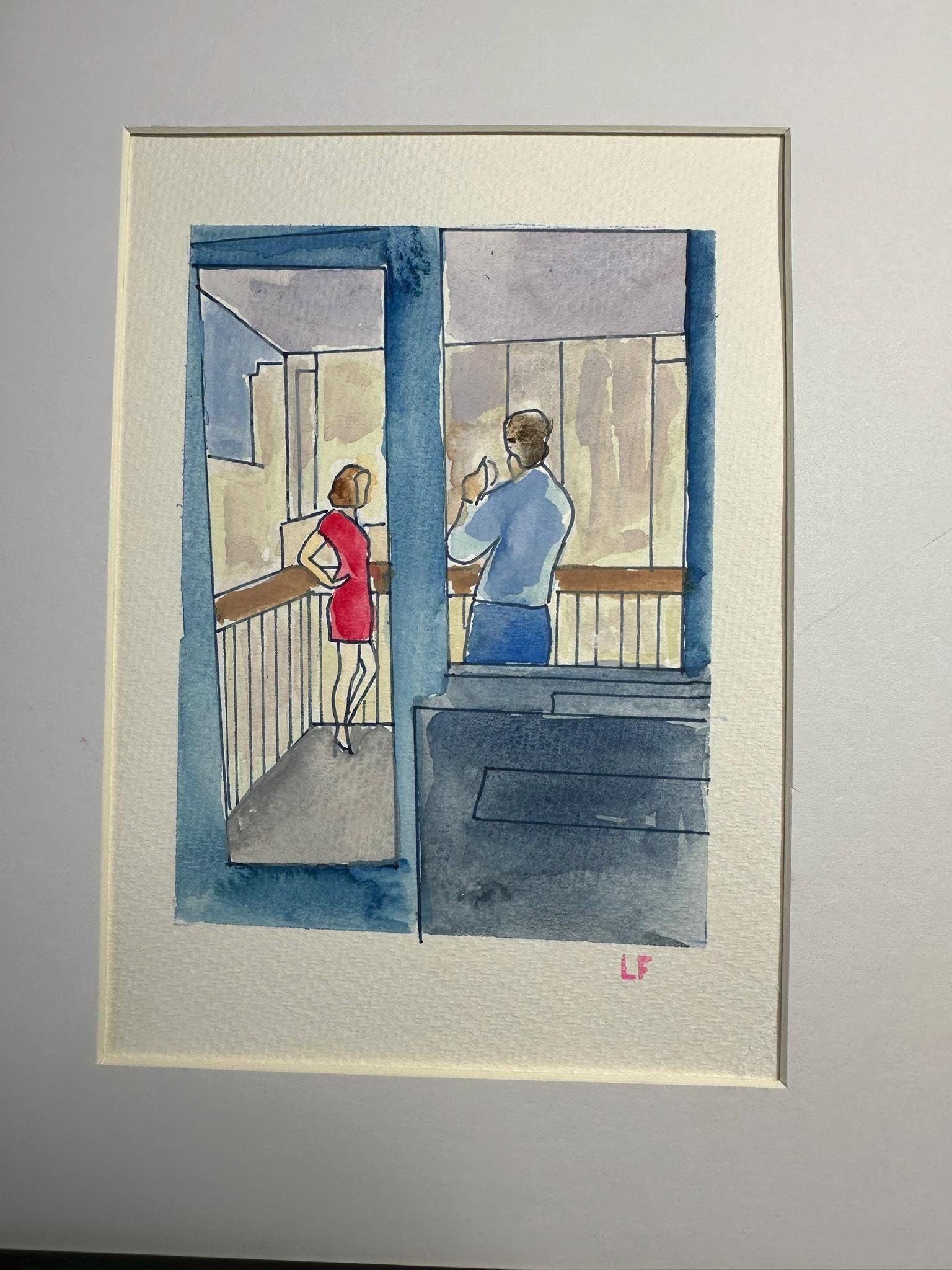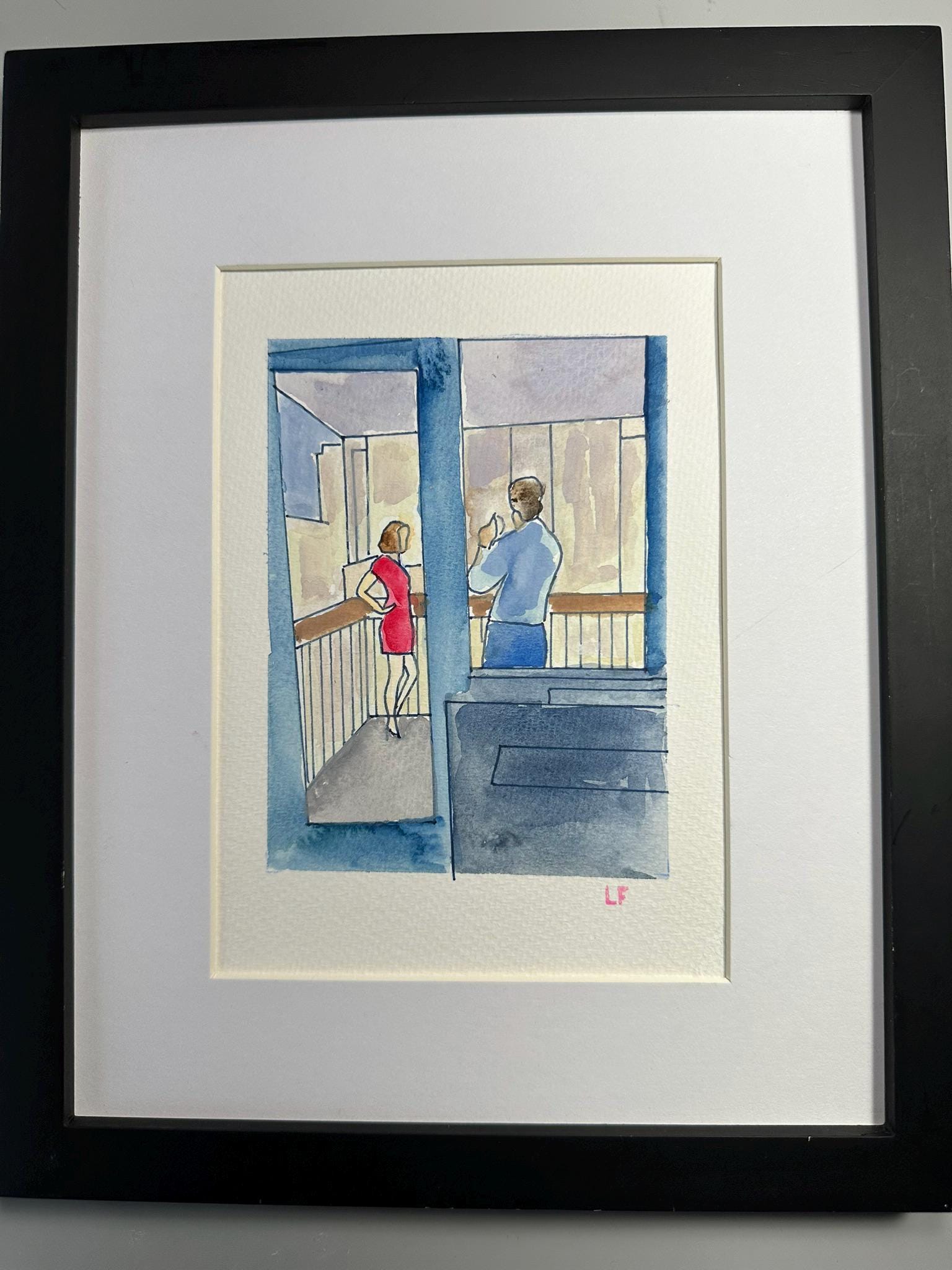 Original painting of photo session on a balcony, from an original photo. Gouache and ink on watercolor paper. Black wood frame can be included. Size including the frame is 11 x 9 inches. Image size is 5.0 x 3.75 inches.