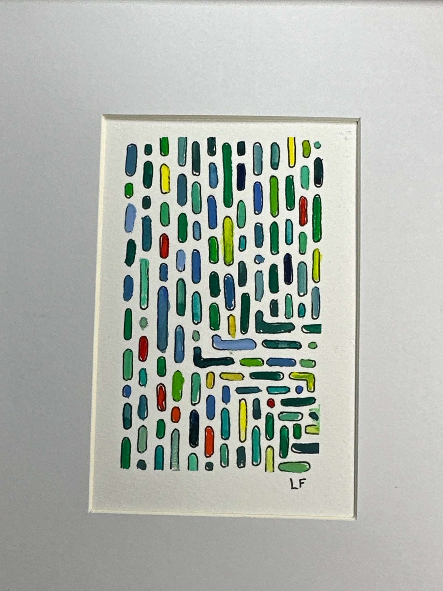 Original abstract painting of blob shapes with white background. Gouache and ink on watercolor paper. Black wood frame can be included. Size including the frame is 11 x 9 inches. Image size is 6 x 4 inches.