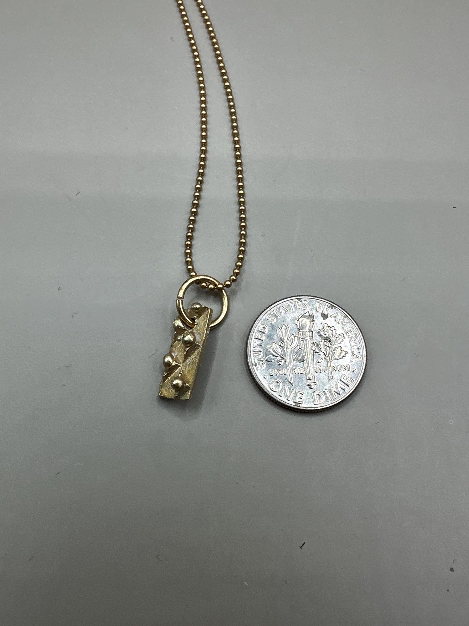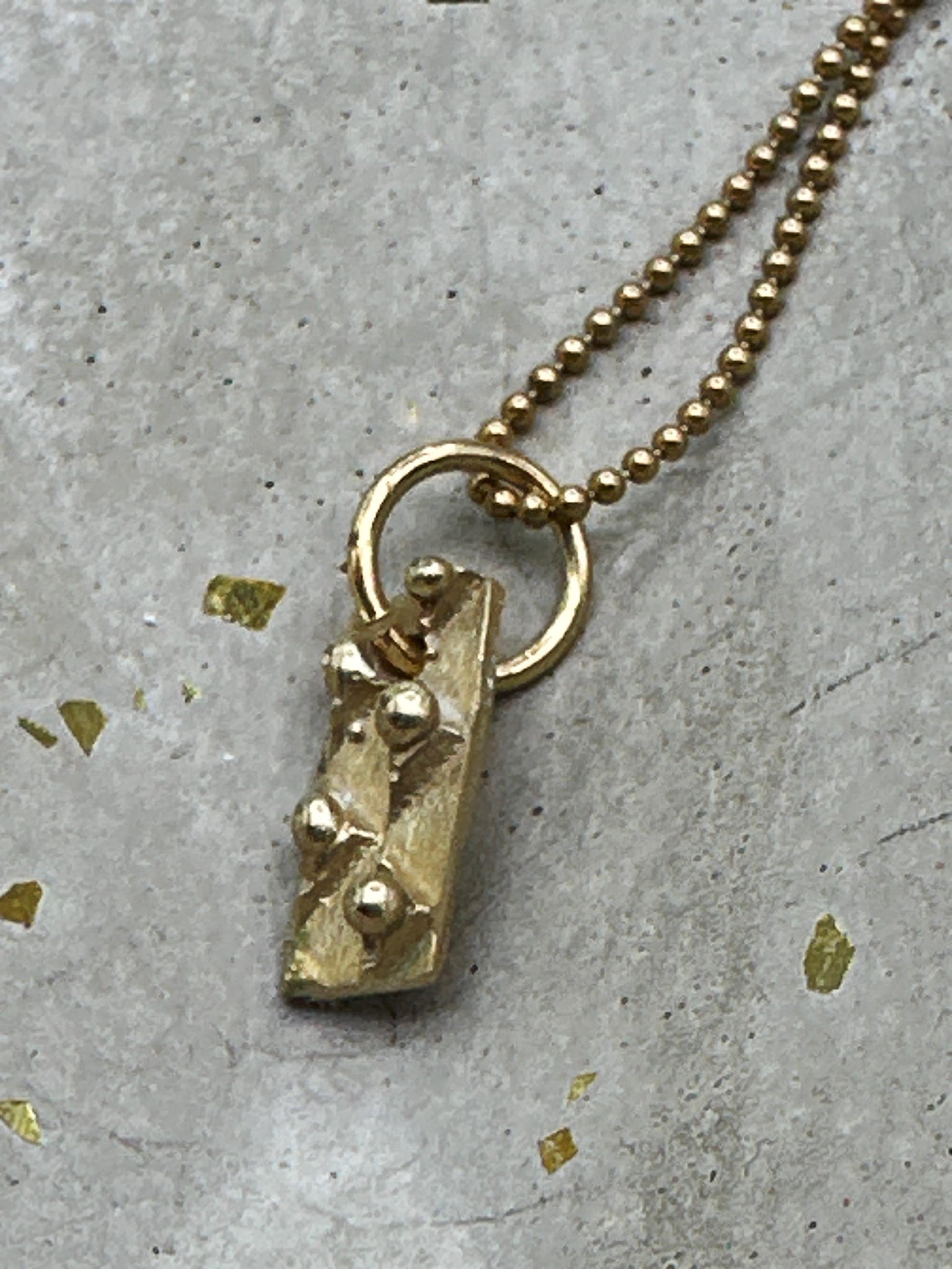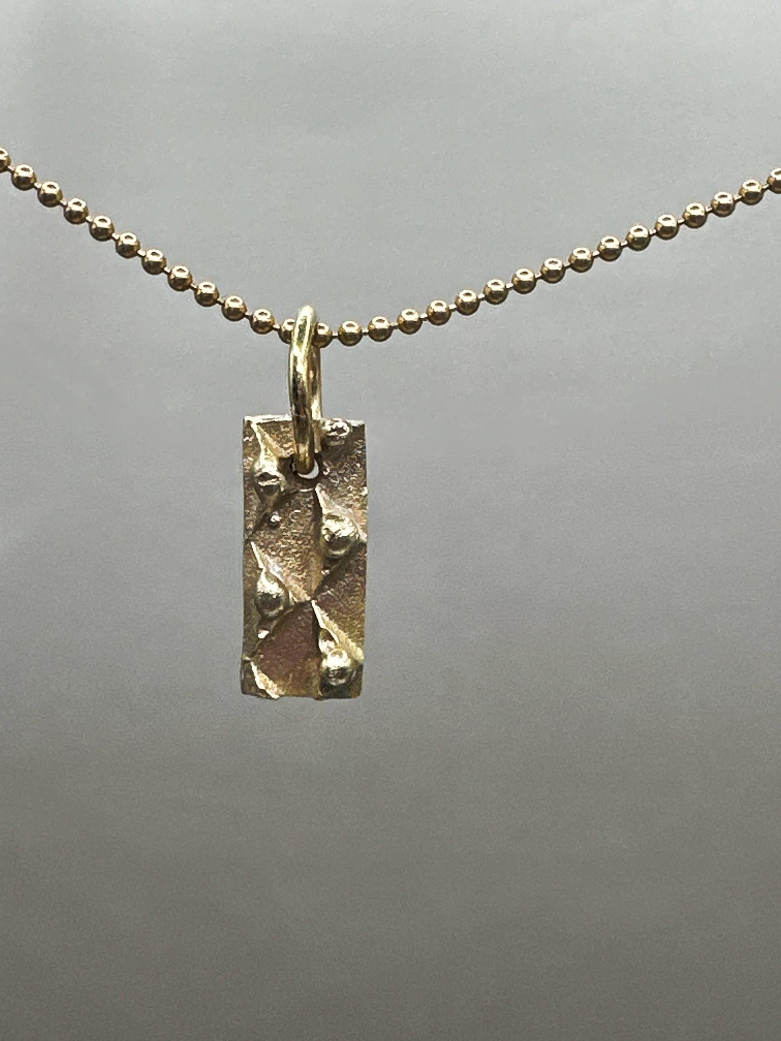 Brass charm pendant with abstract design on a silver ball chain. Charm is made by lost-wax casting.