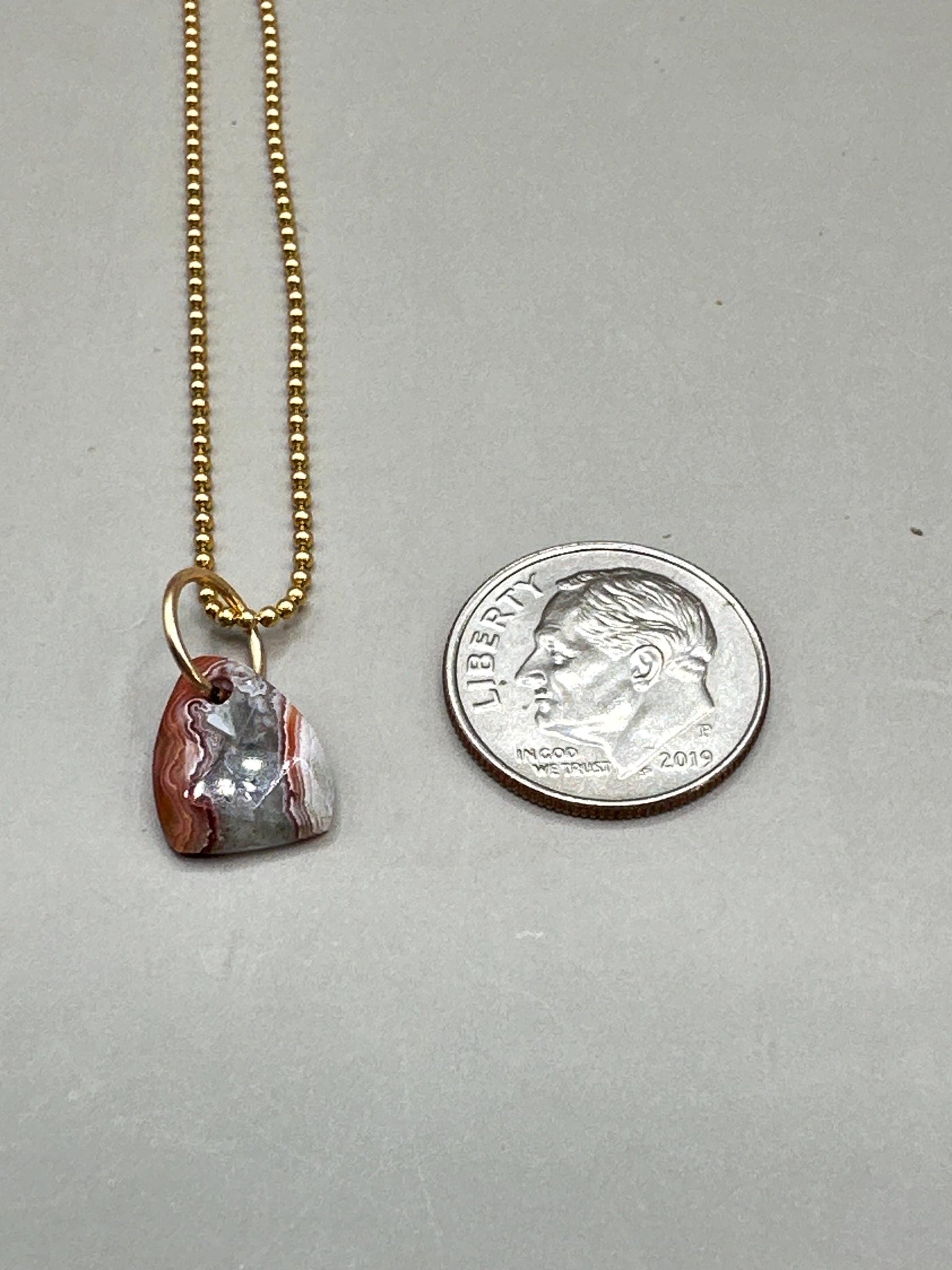 Crazy lace agate pendant. Beautiful stripes of color. Drilled stone on gold-filled ball chain.