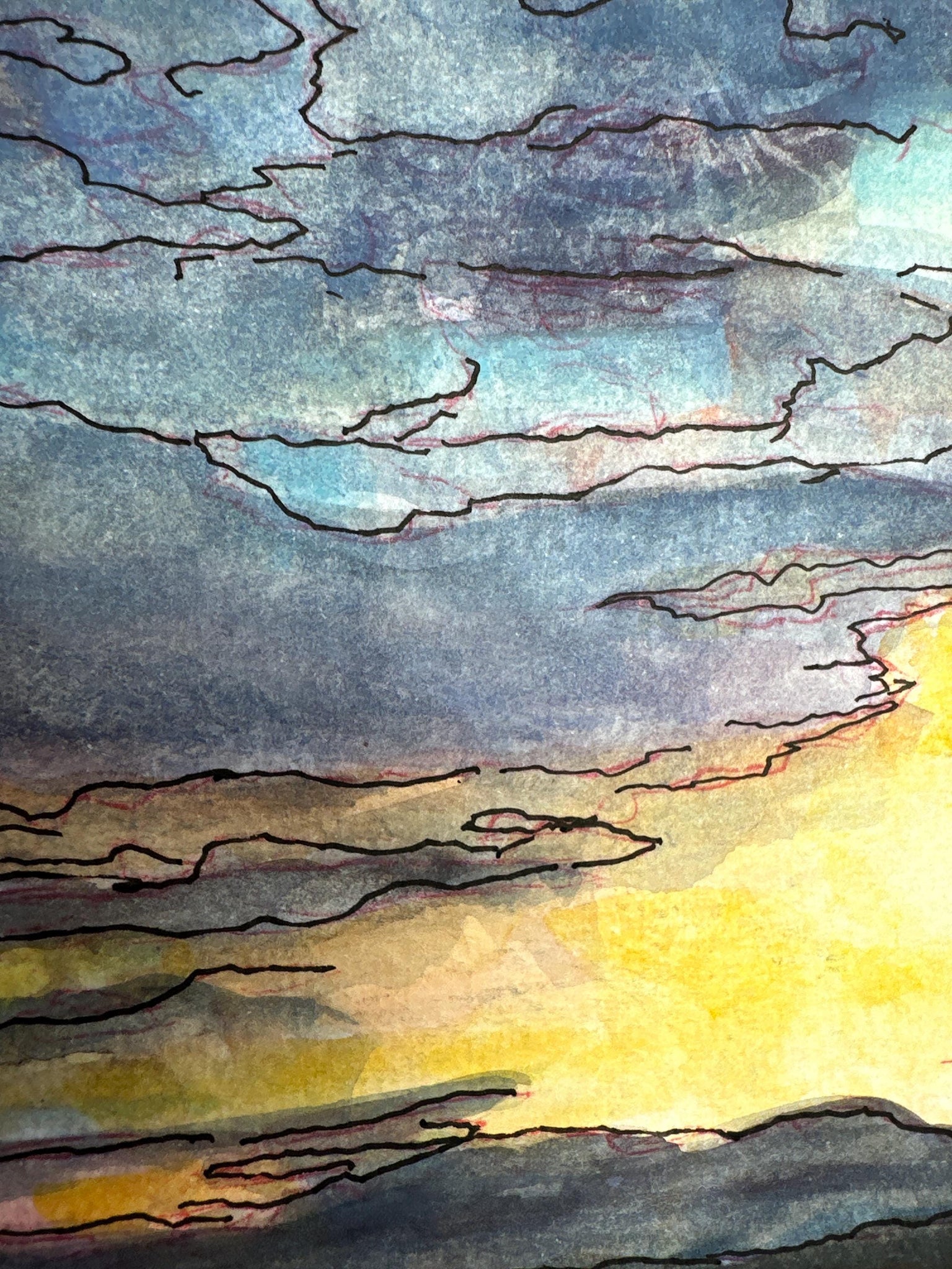 Original painting of a sunset on the New Jersey shore. From an original photo. Gouache and ink on watercolor paper.