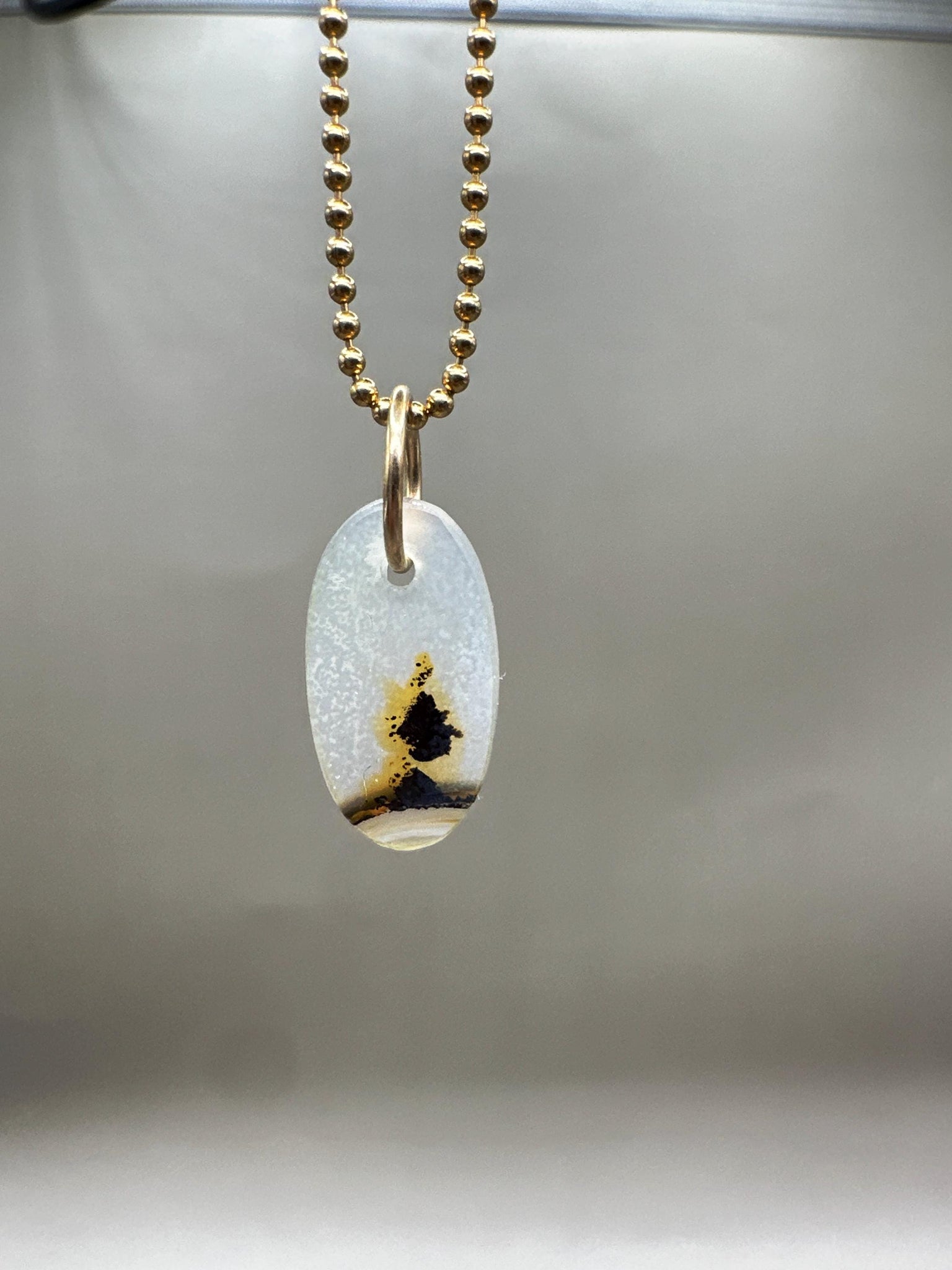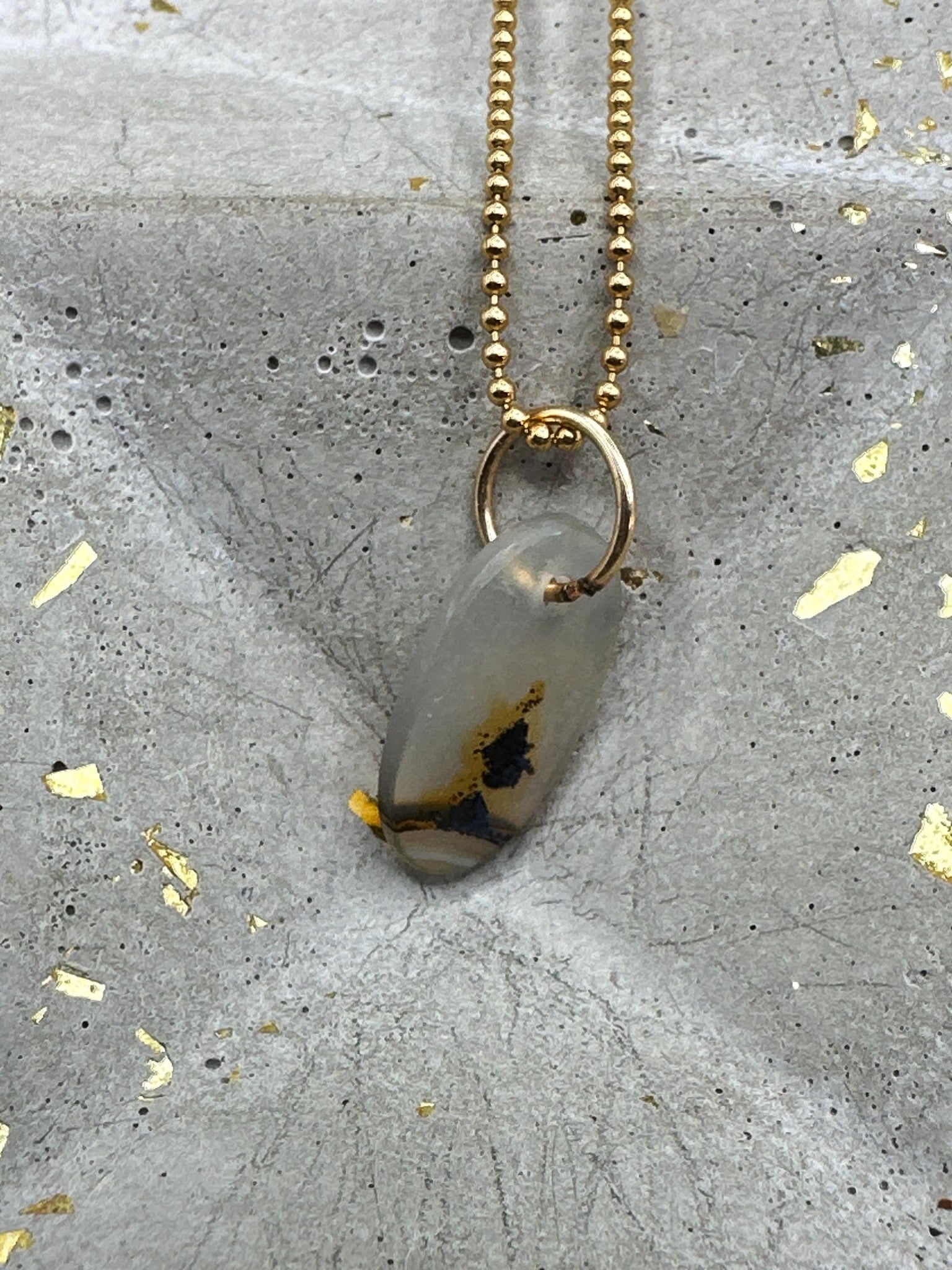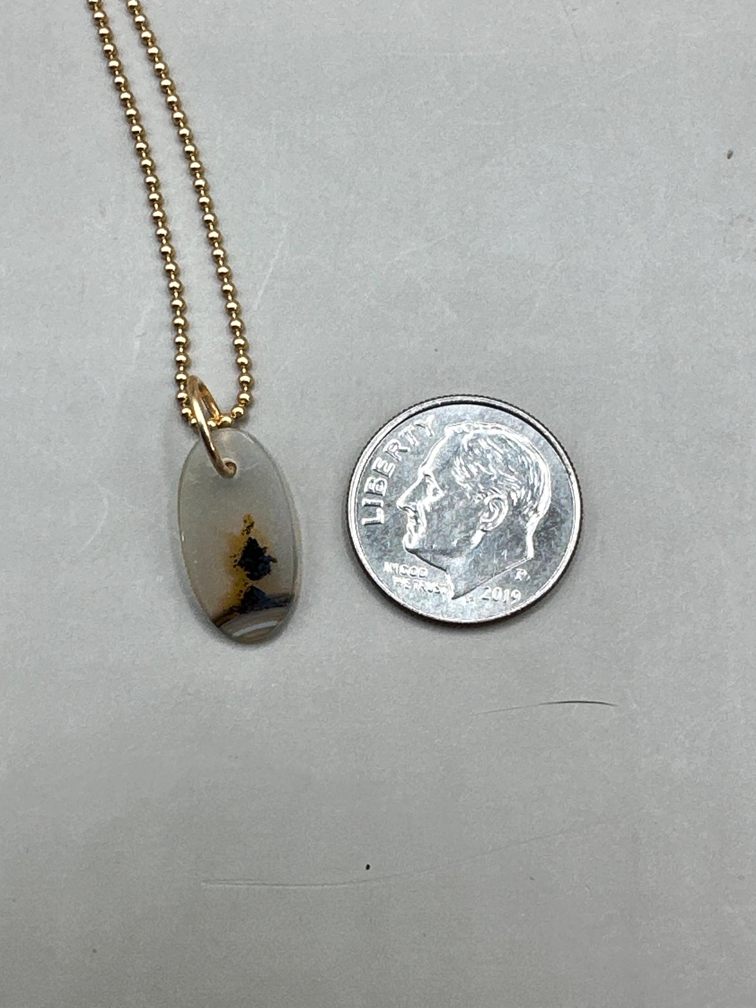 Dendritic agate pendant. Drilled natural stone on gold-filled ball chain.