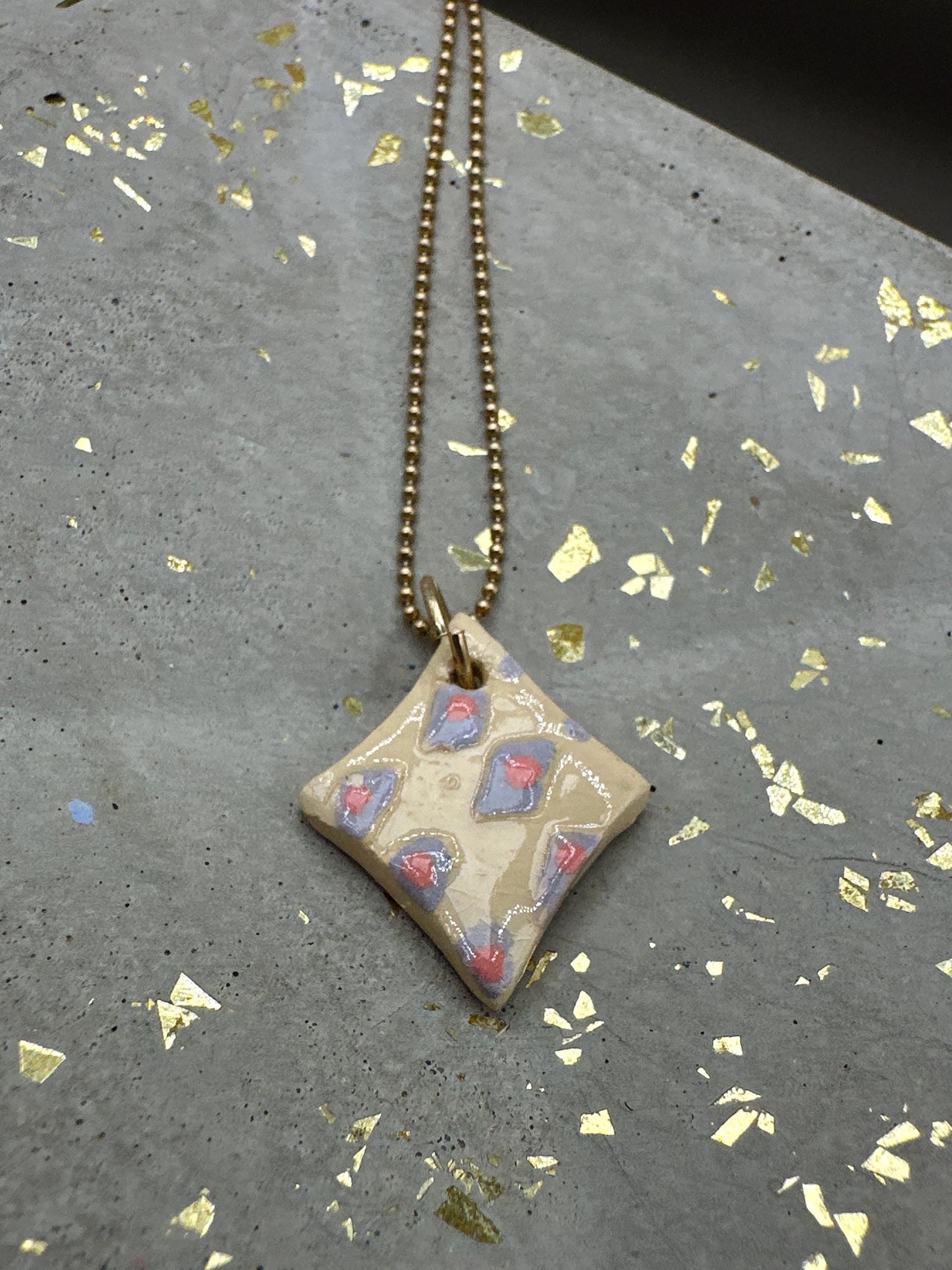 Ceramic pendant on gold-filled ball chain. Lavender and pink underglaze on white clay. Raised diamond texture. Handmade and unique. Each pendant is different.