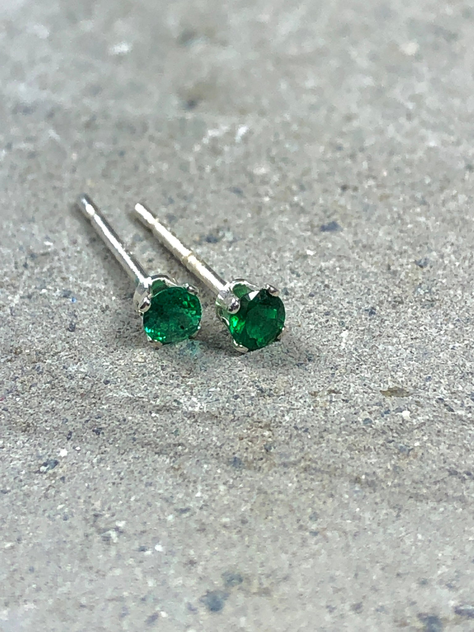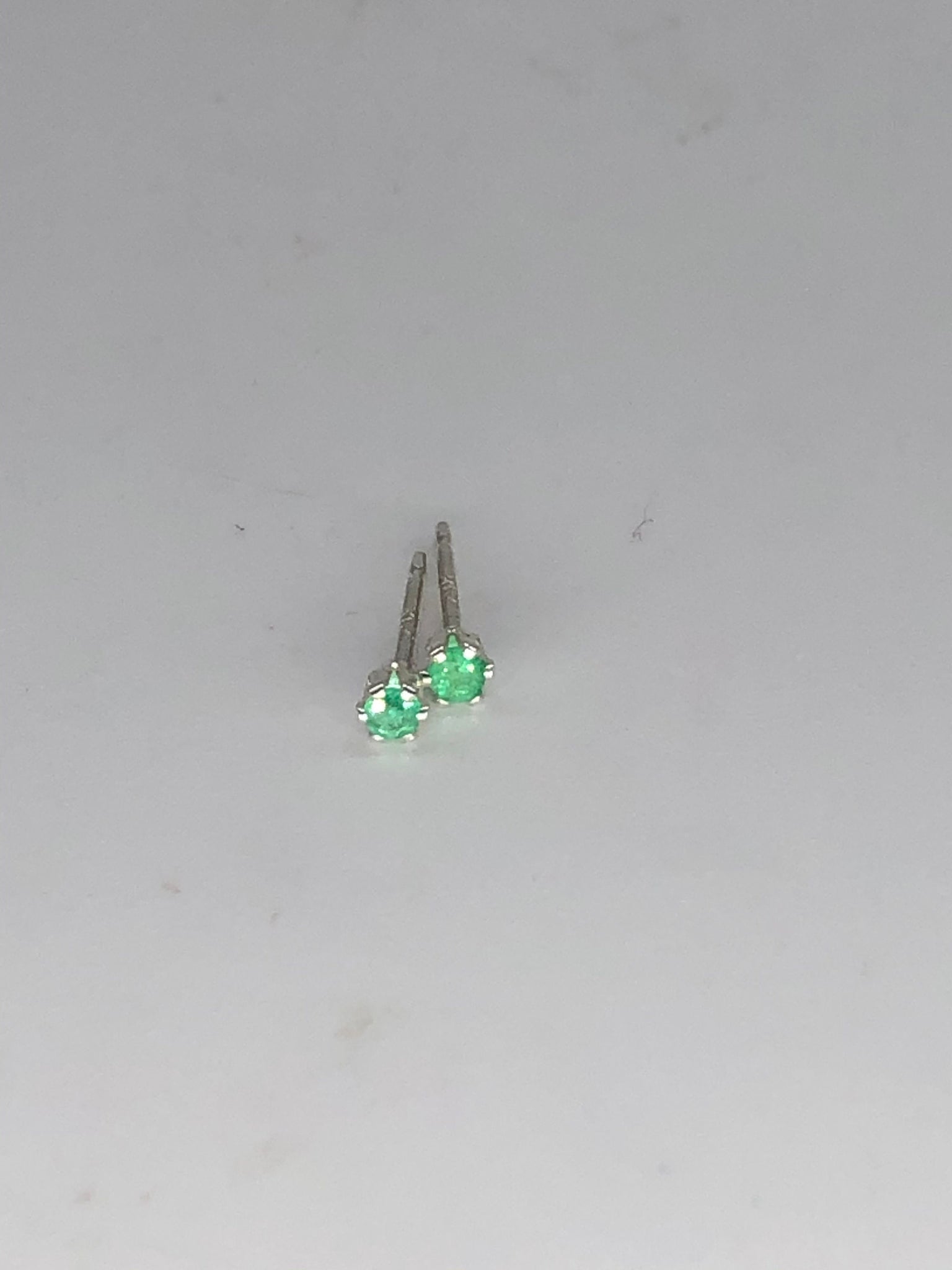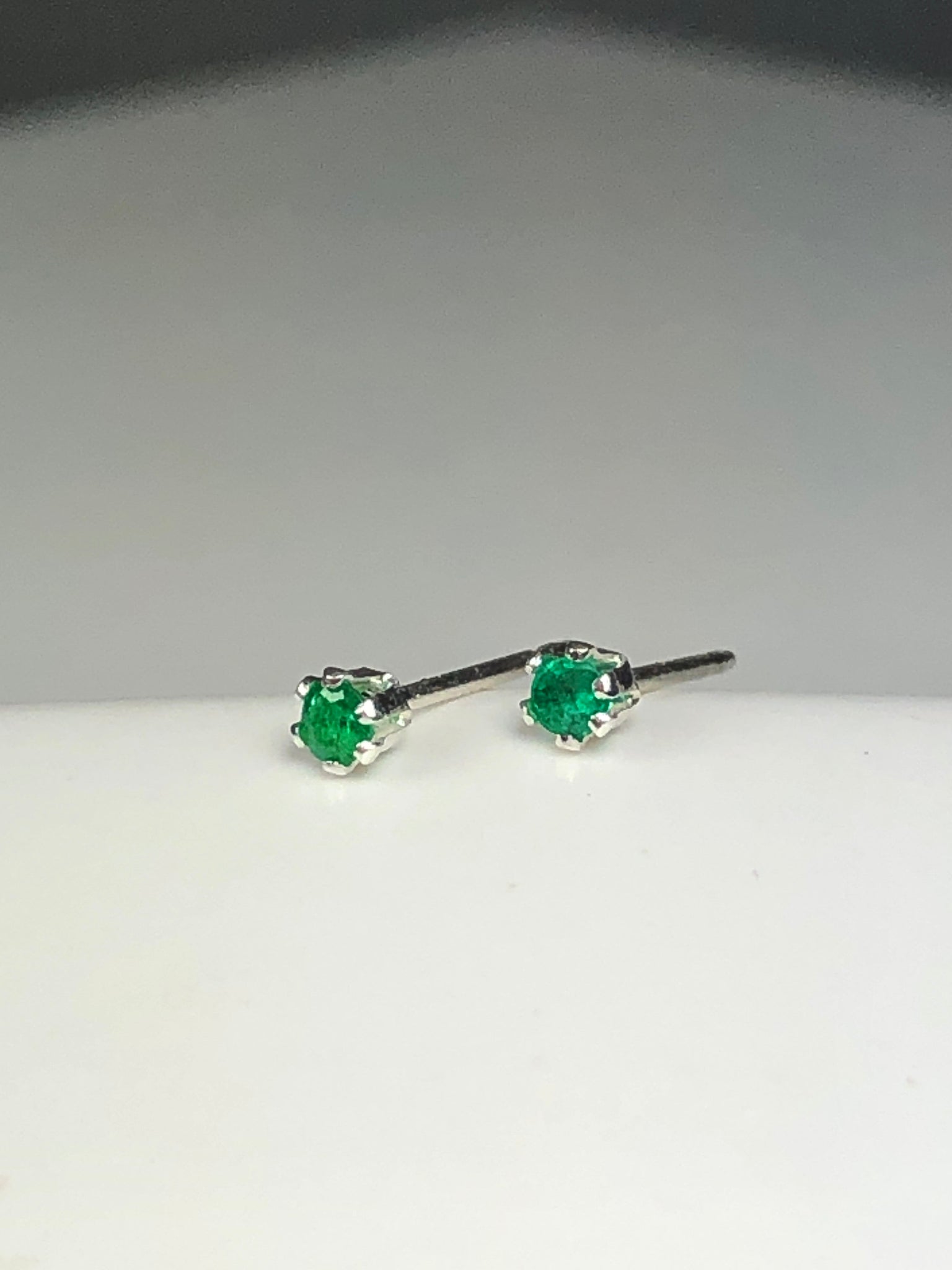 Emerald stud earrings set in silver. Gemstones are 2mm in diameter.