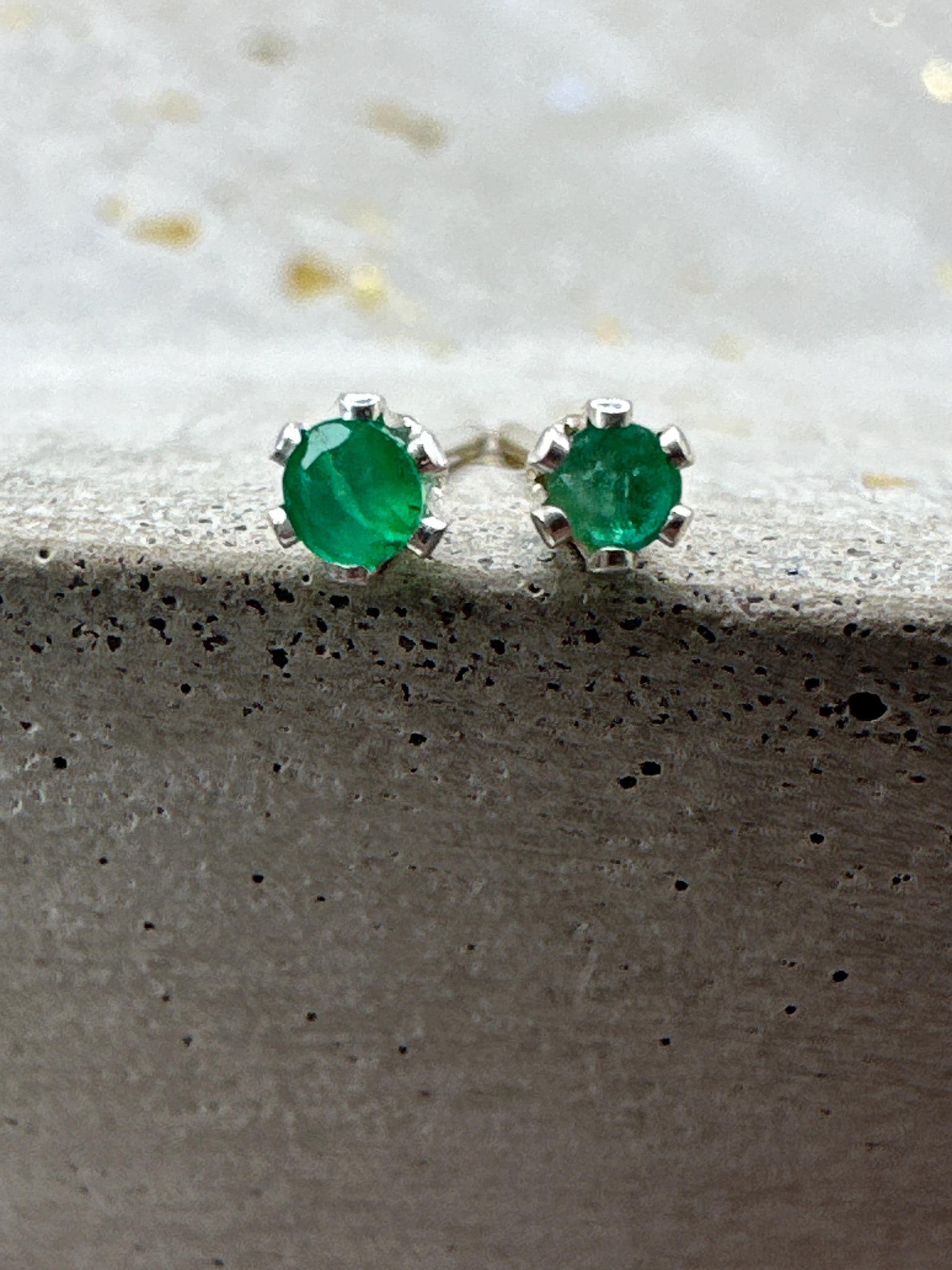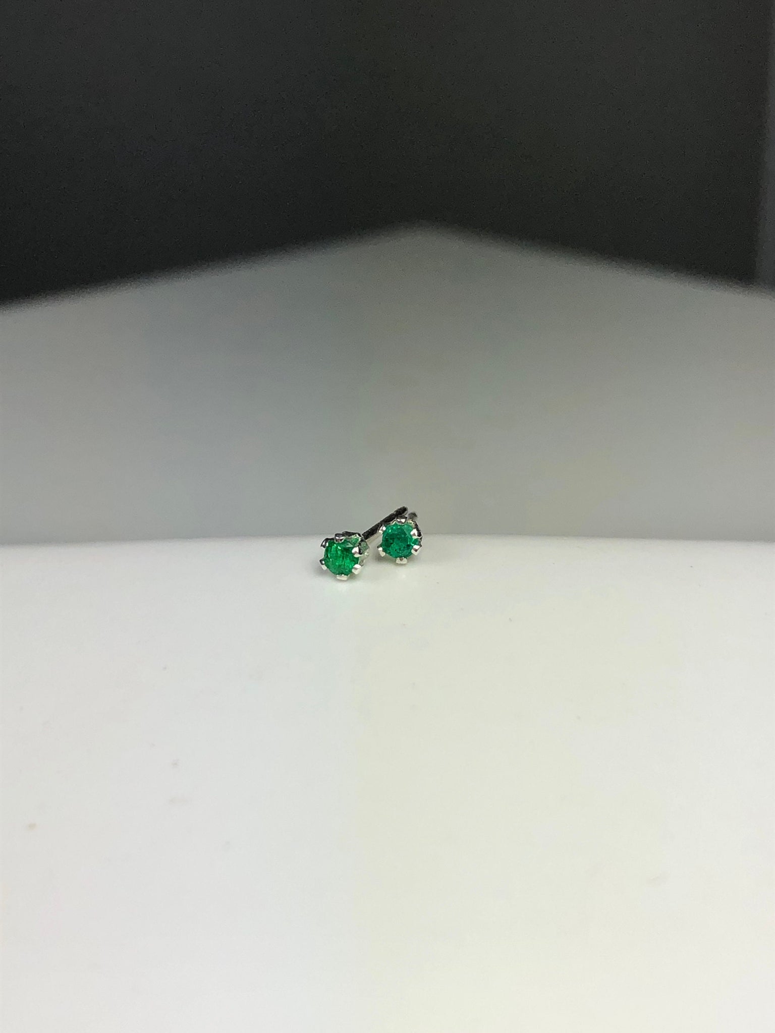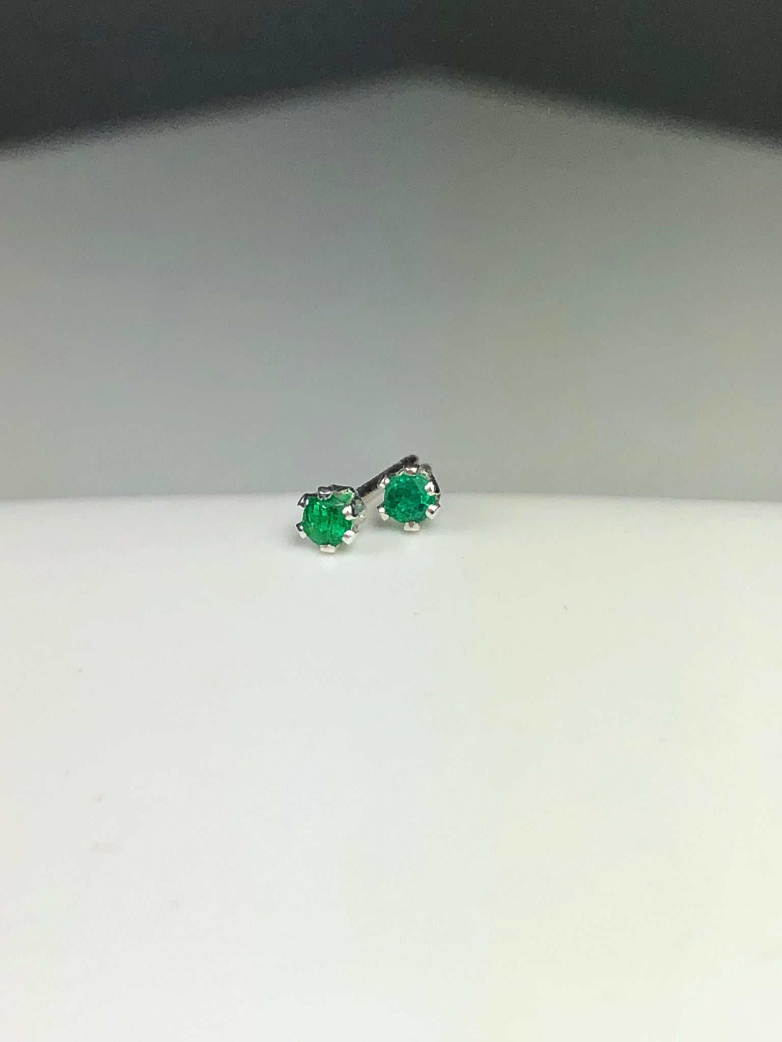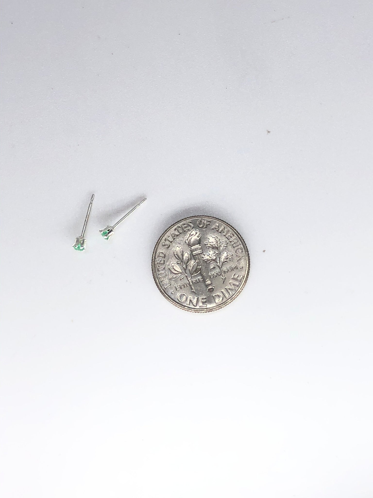 Emerald stud earrings set in silver. Gemstones are 2mm in diameter.
