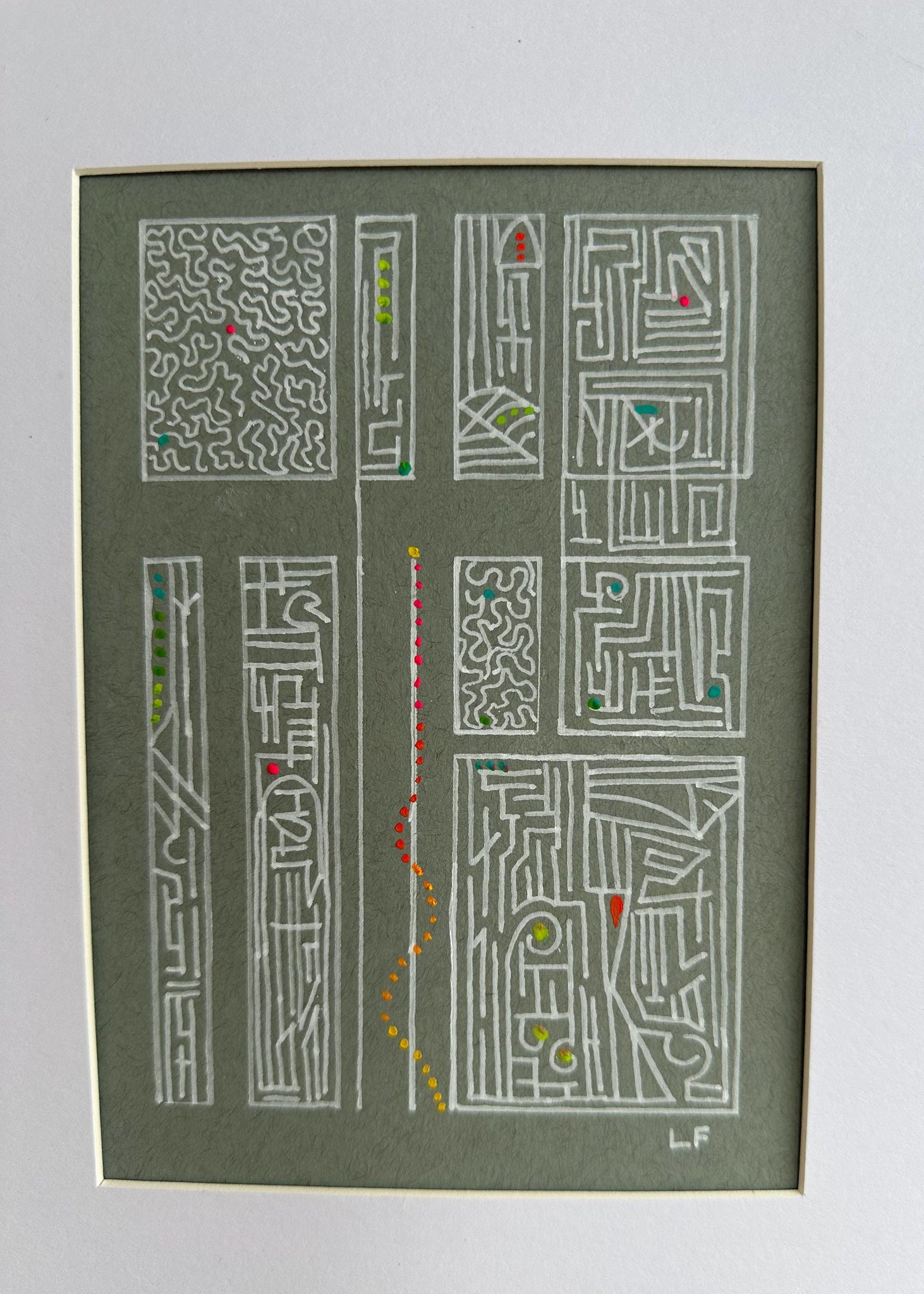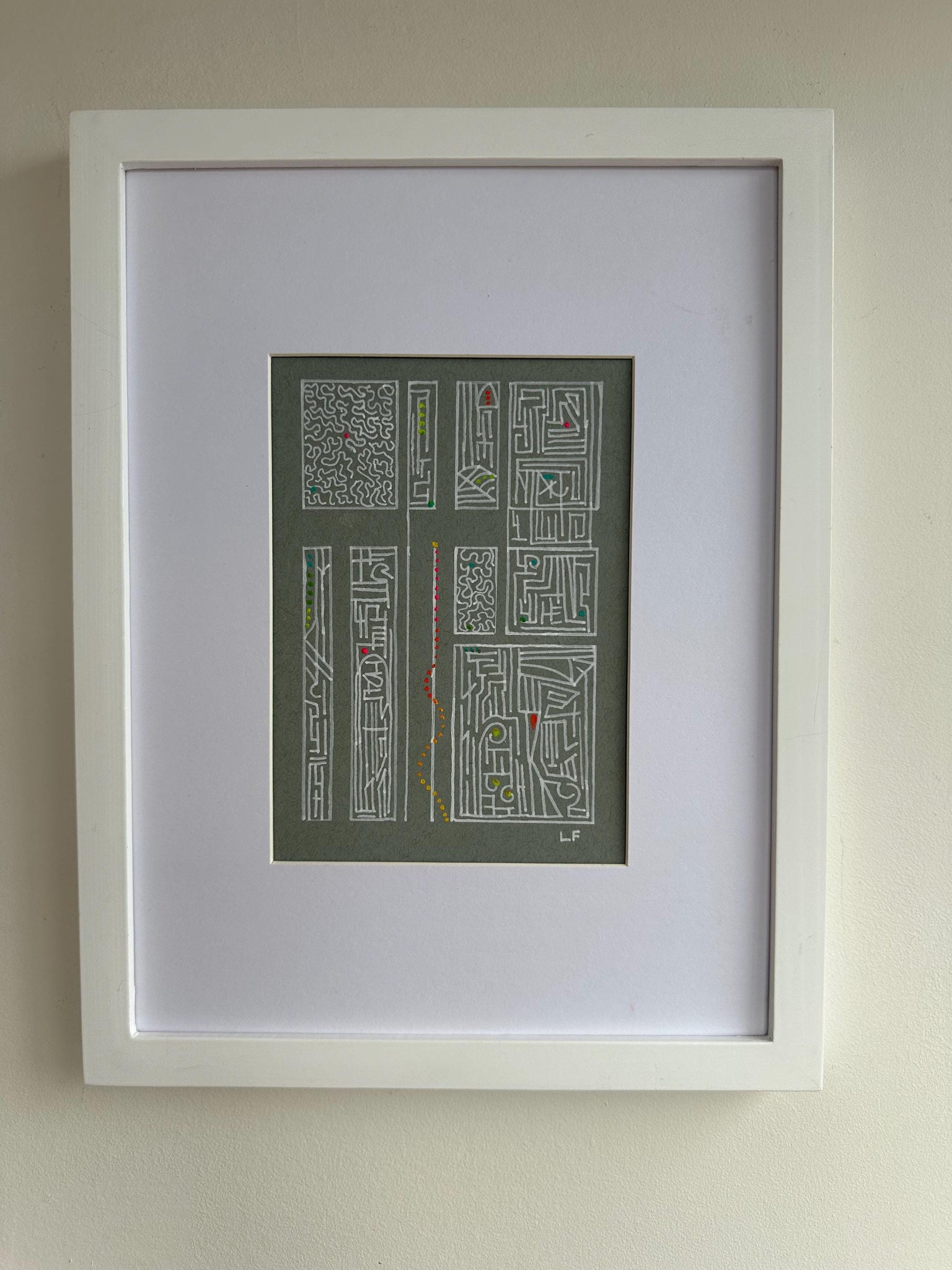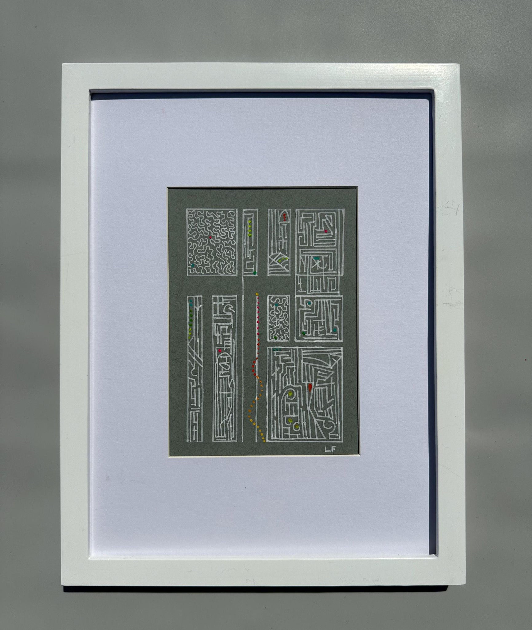 Original abstract painting. Paint pens on mixed media paper. White wood frame with plastic insert is included. Size including the frame is 13 x10 inches.