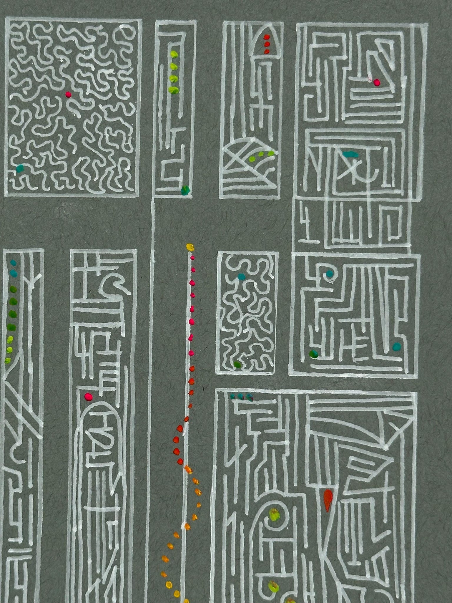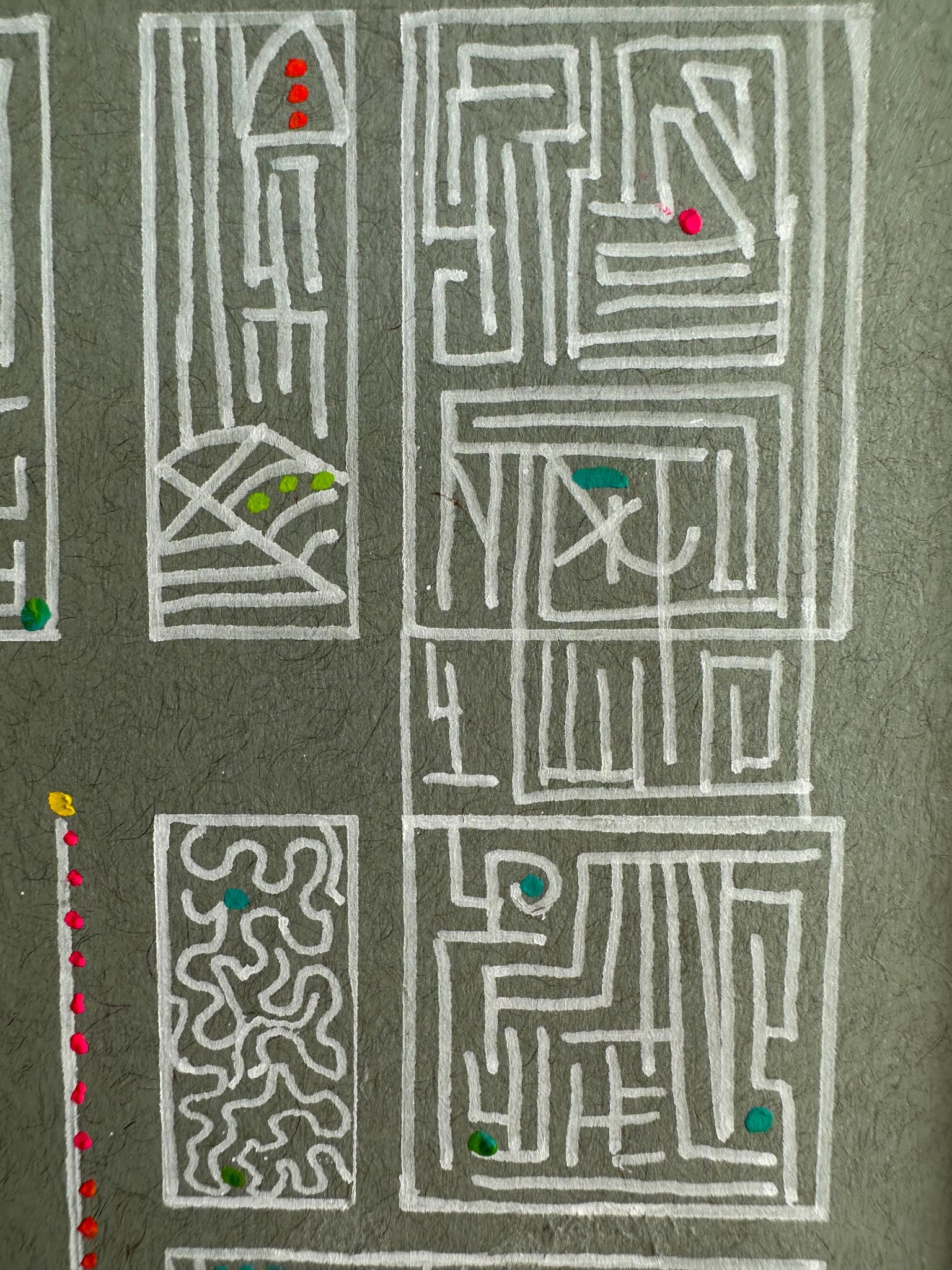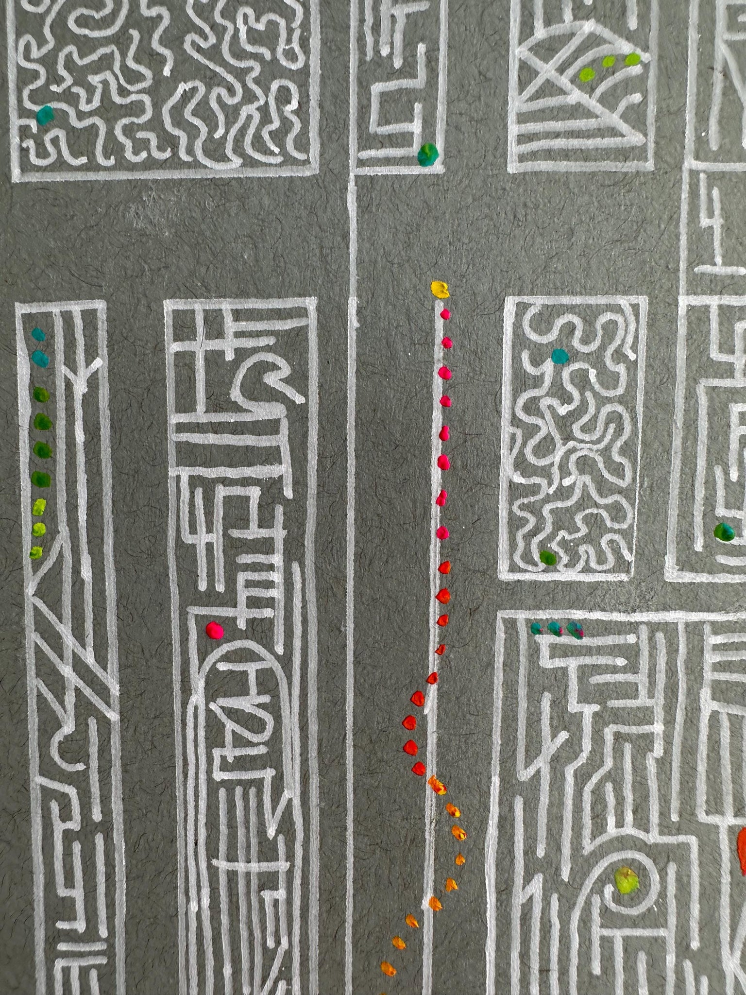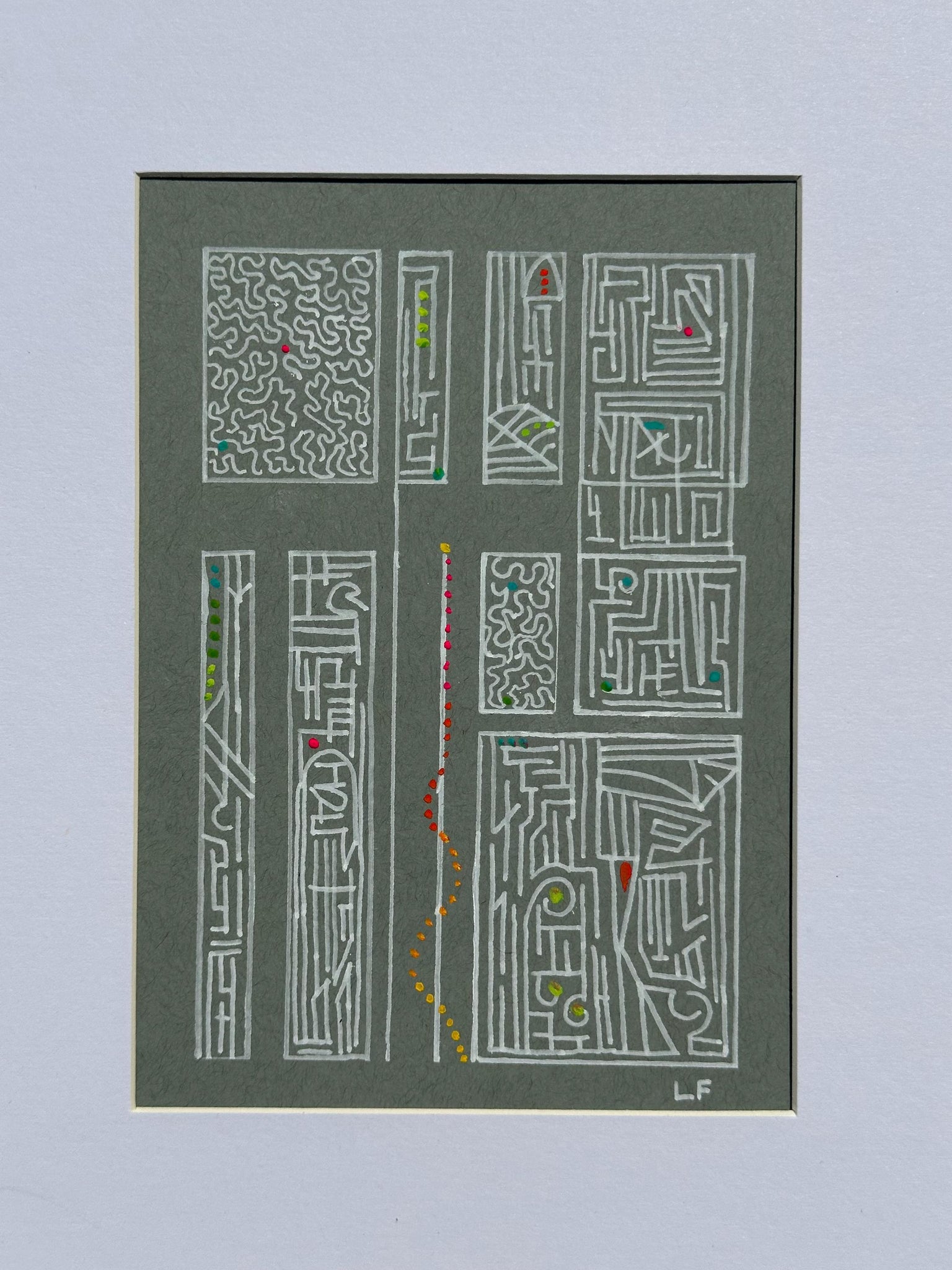 Original abstract painting. Paint pens on mixed media paper. White wood frame with plastic insert is included. Size including the frame is 13 x10 inches.