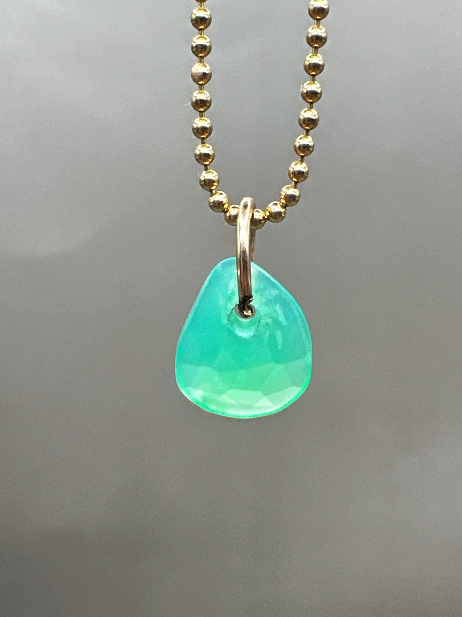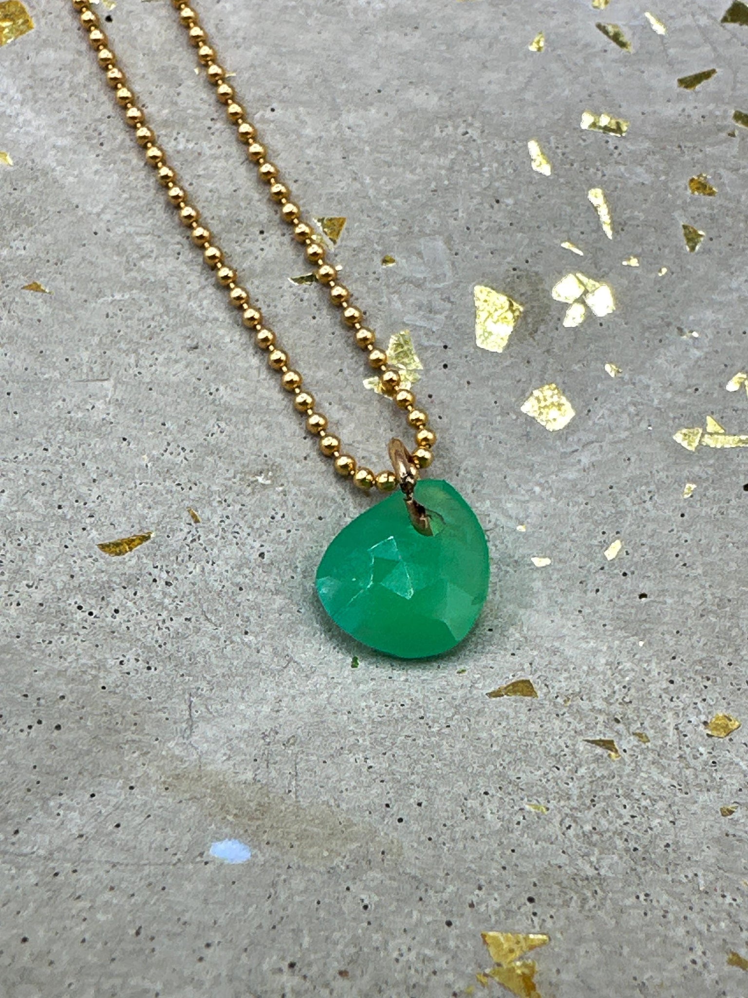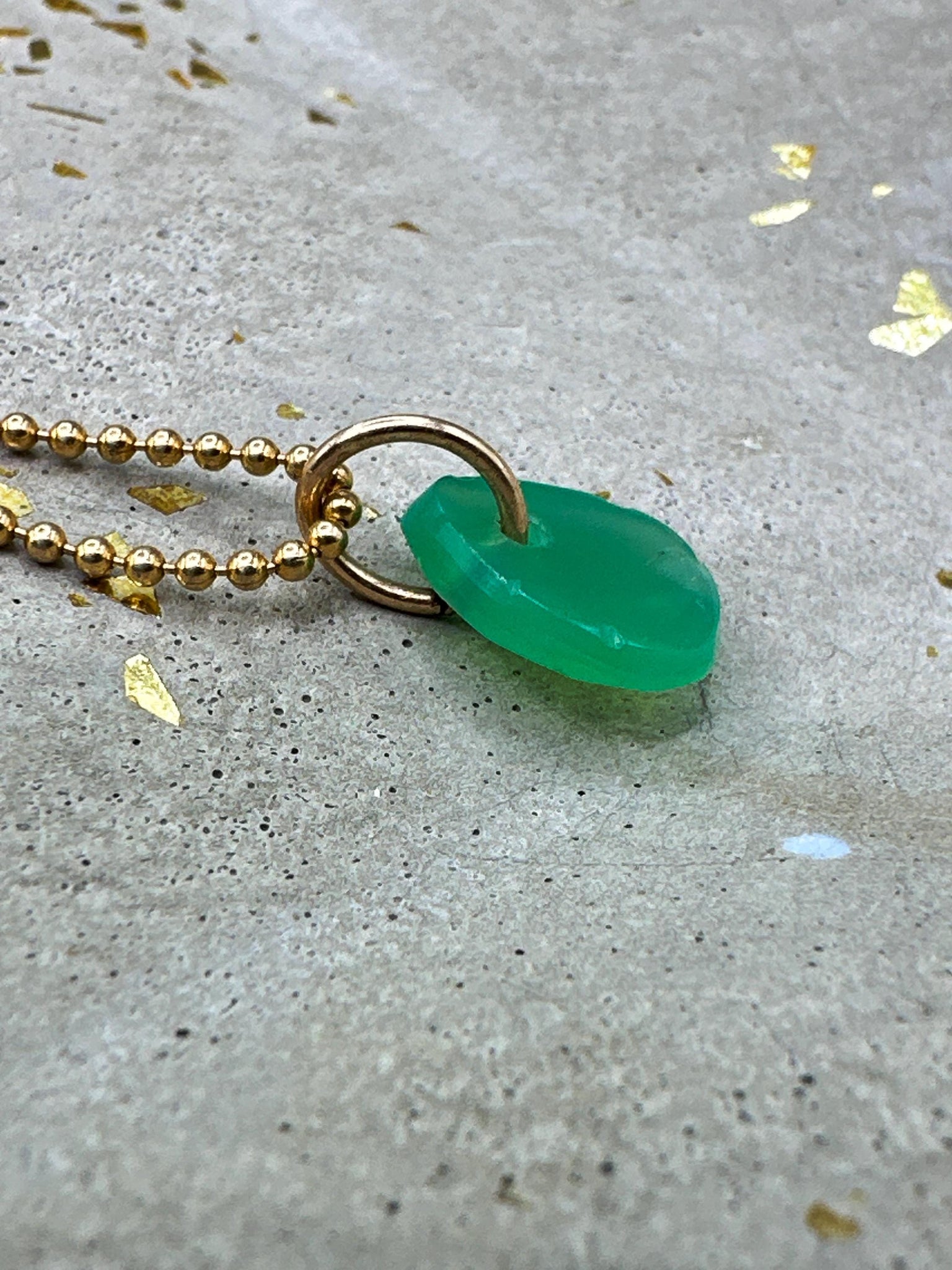 Small green chalcedony pendant. Beautiful green color. Drilled stone on gold-filled ball chain.
