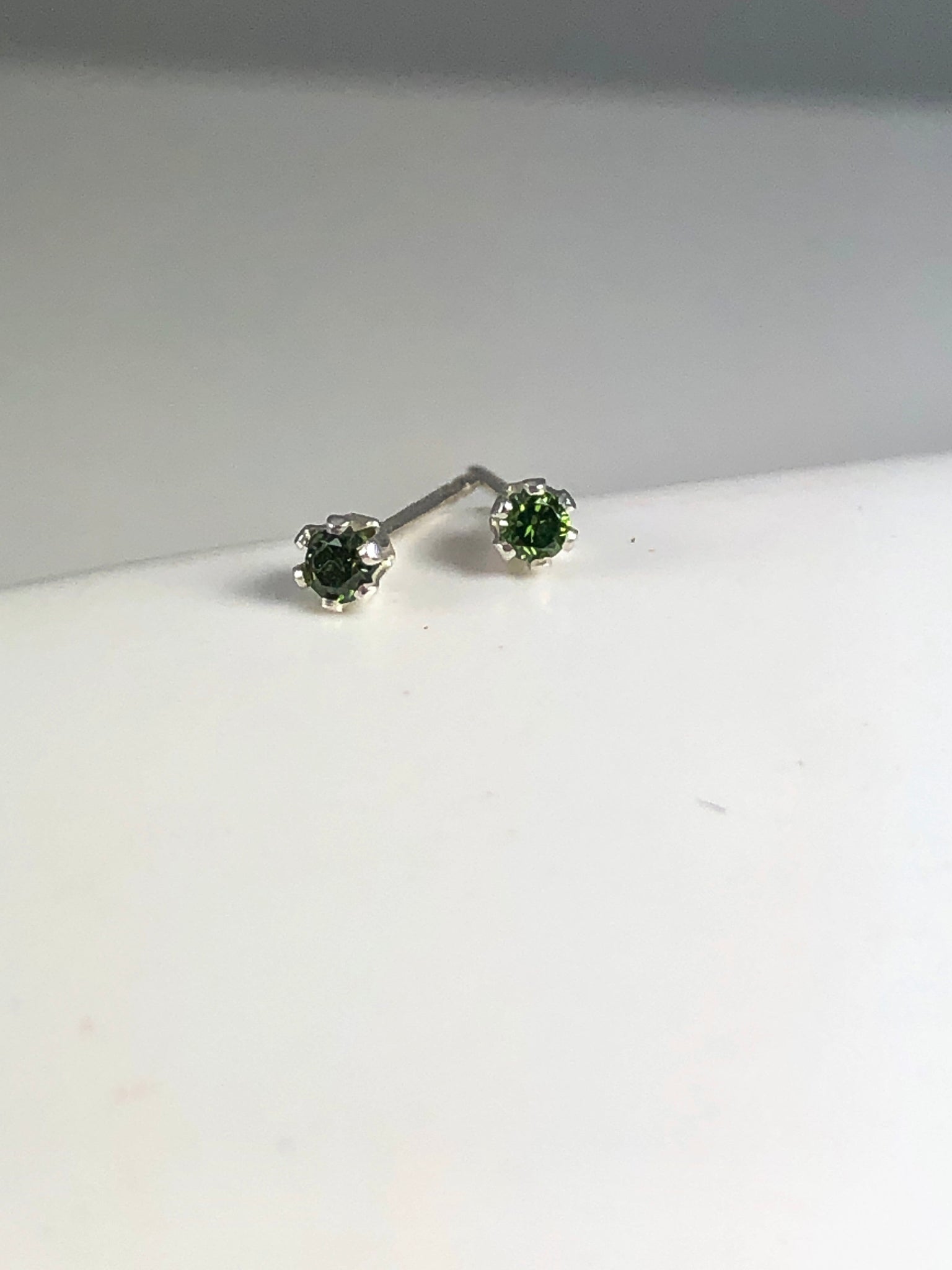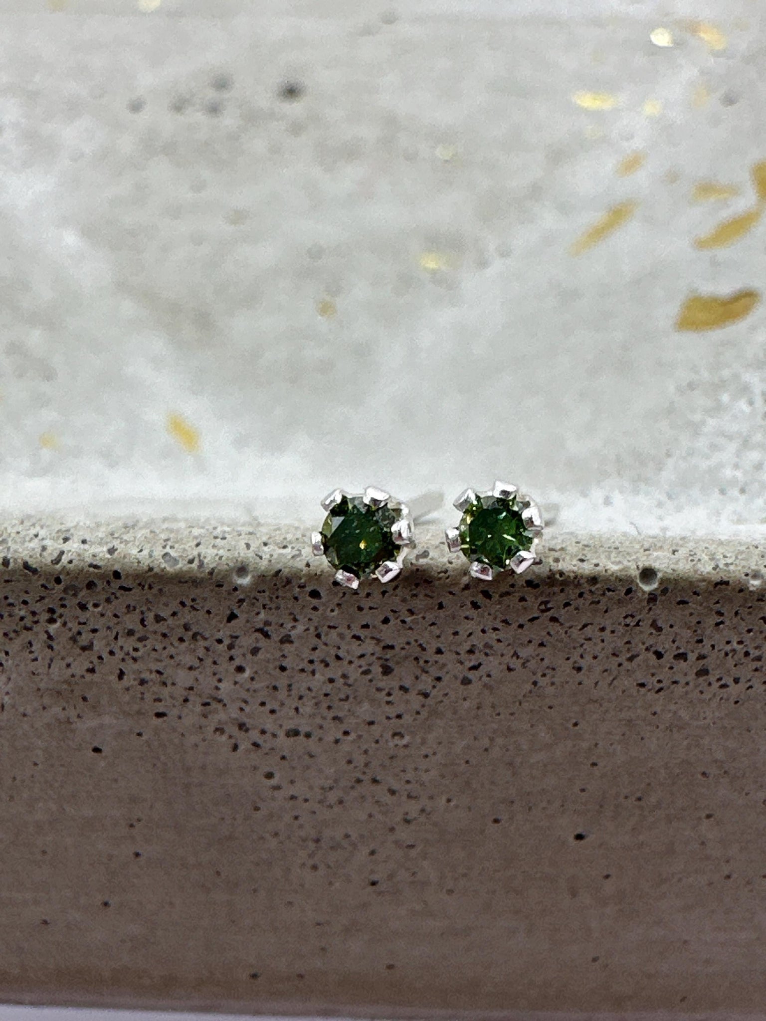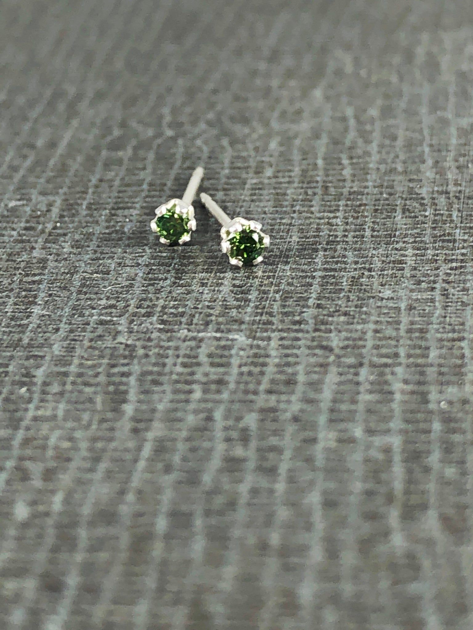 Tiny green diamond stud earrings with sterling silver posts. Stones are 2mm in diameter.