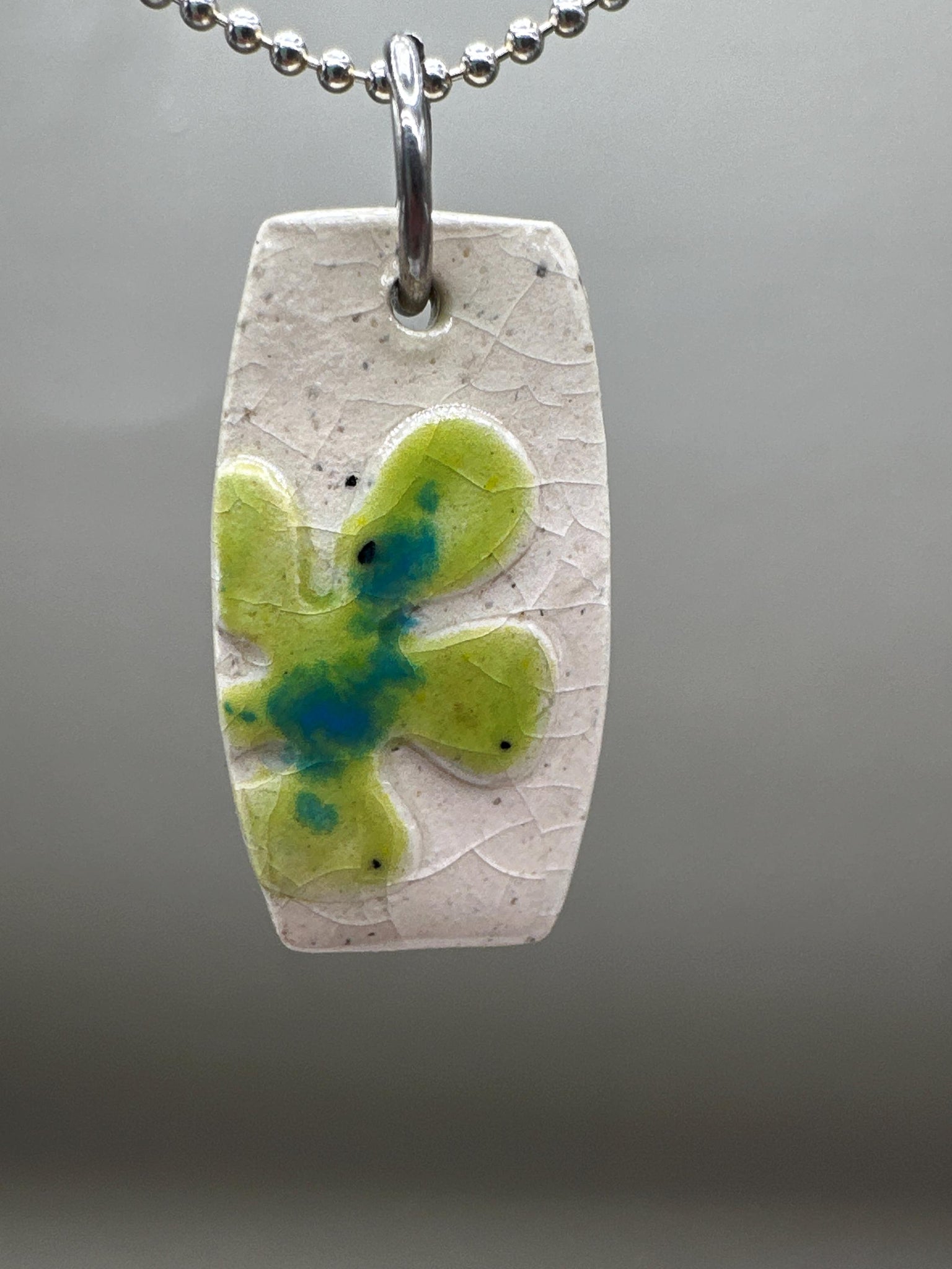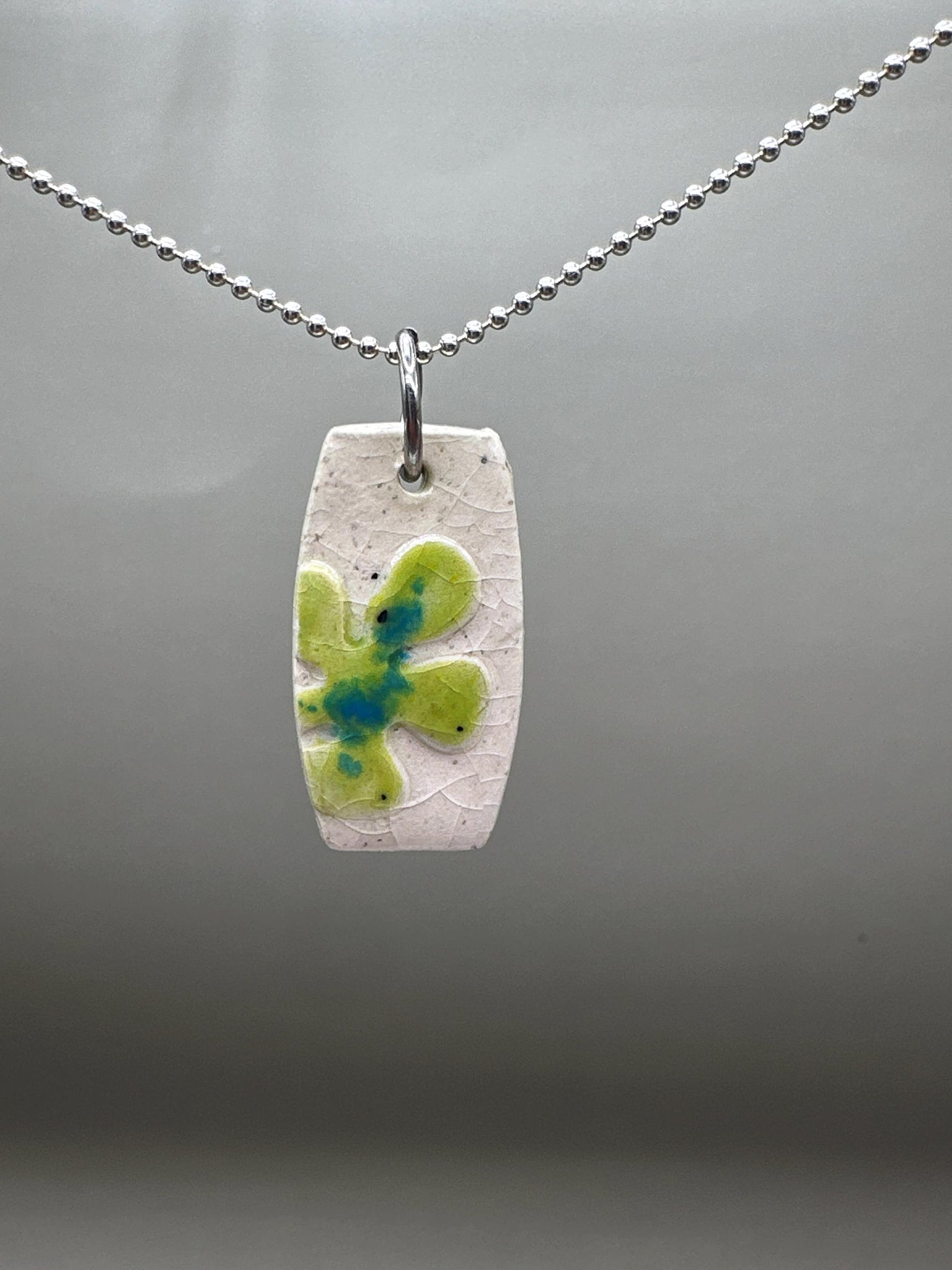 Green glaze with clear crackle on white rectangular ceramic pendant on silver ball chain. Handmade and unique. Each pendant is different.