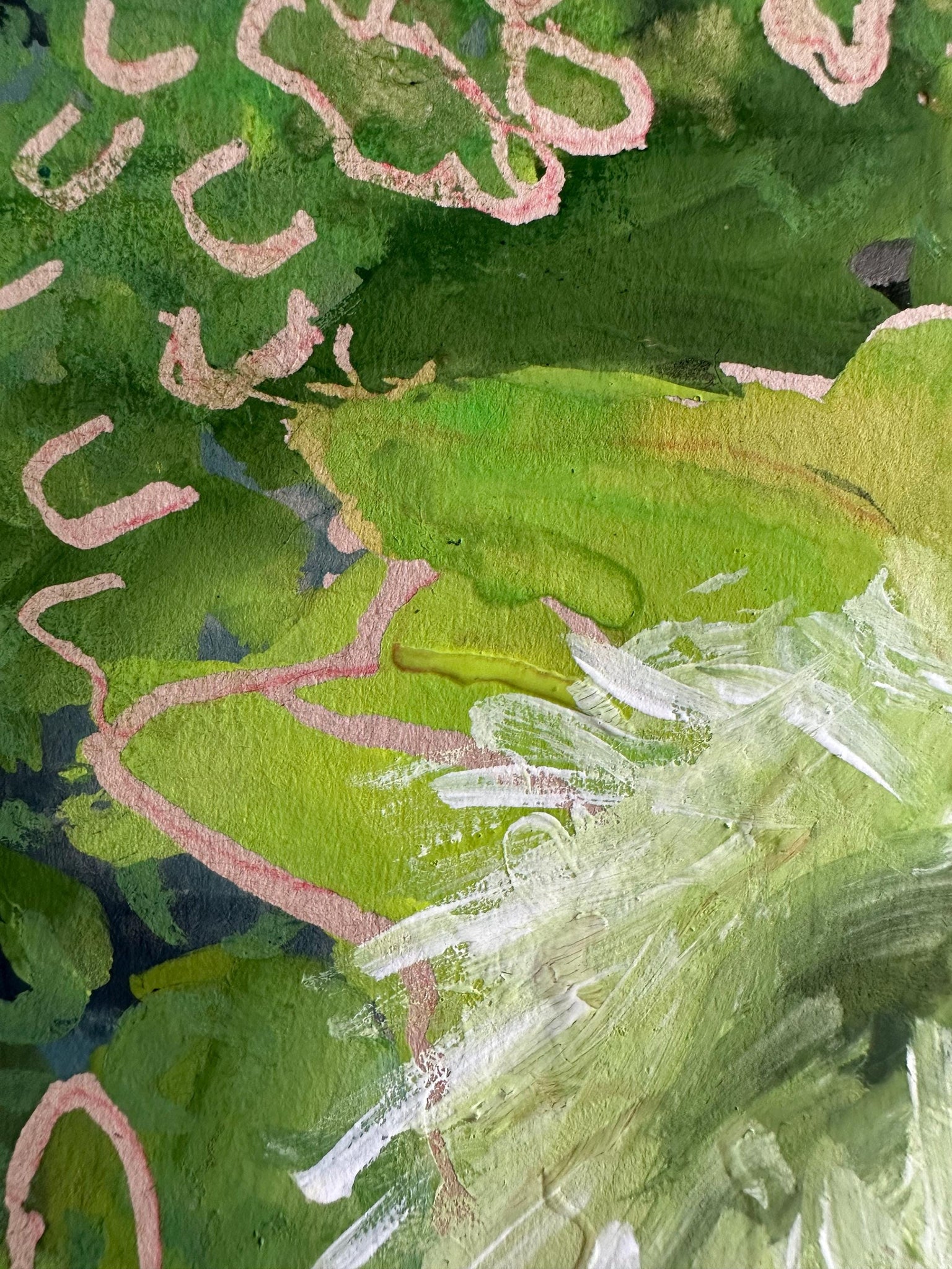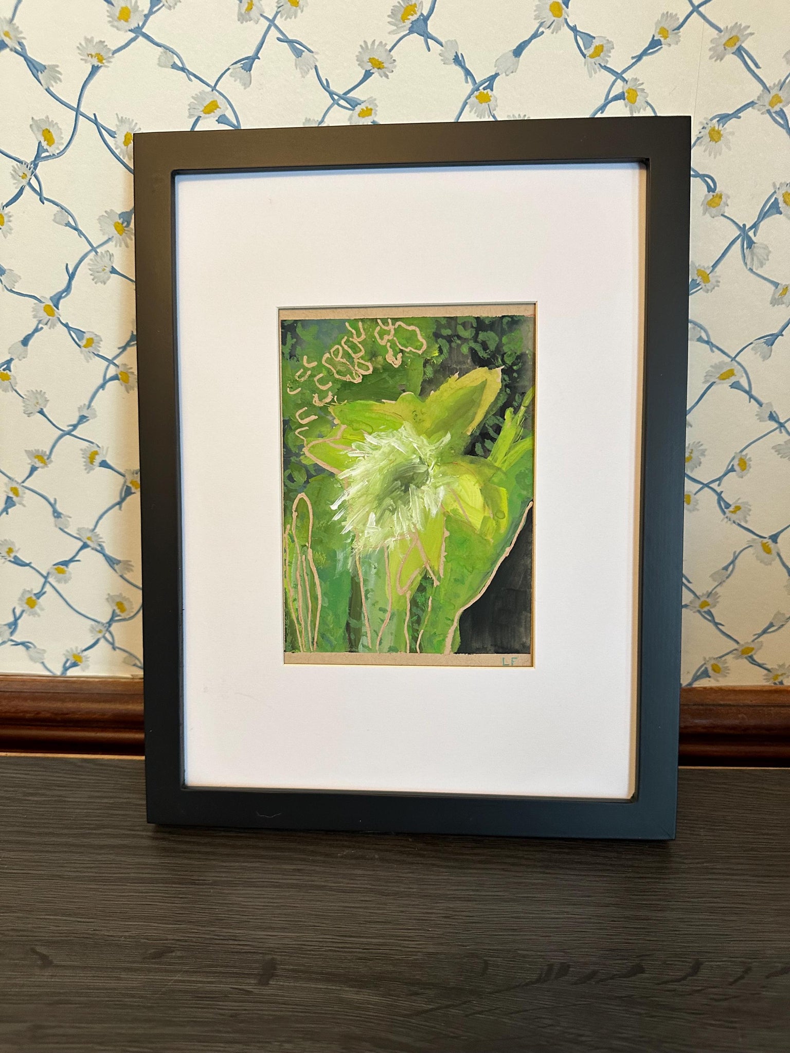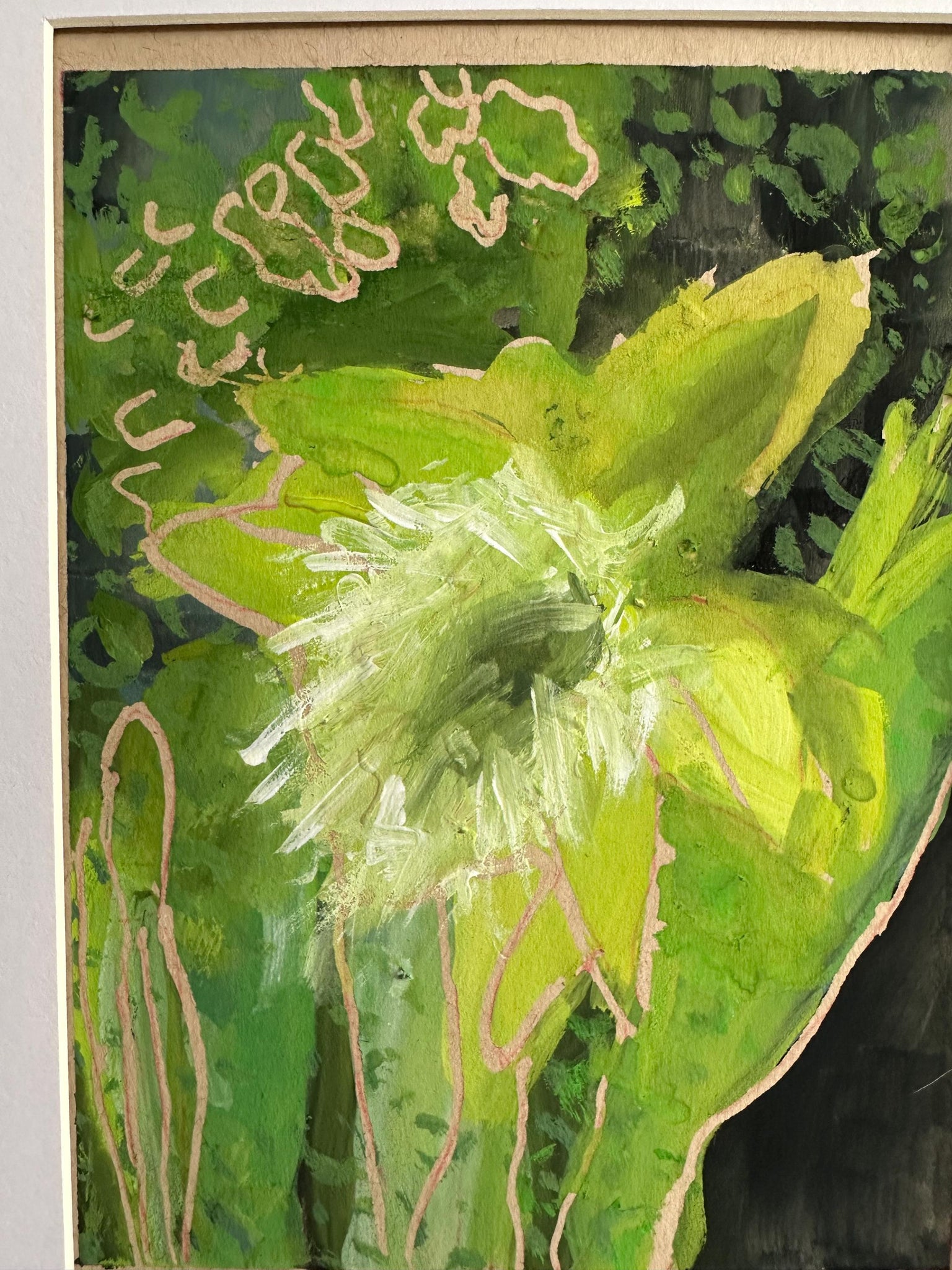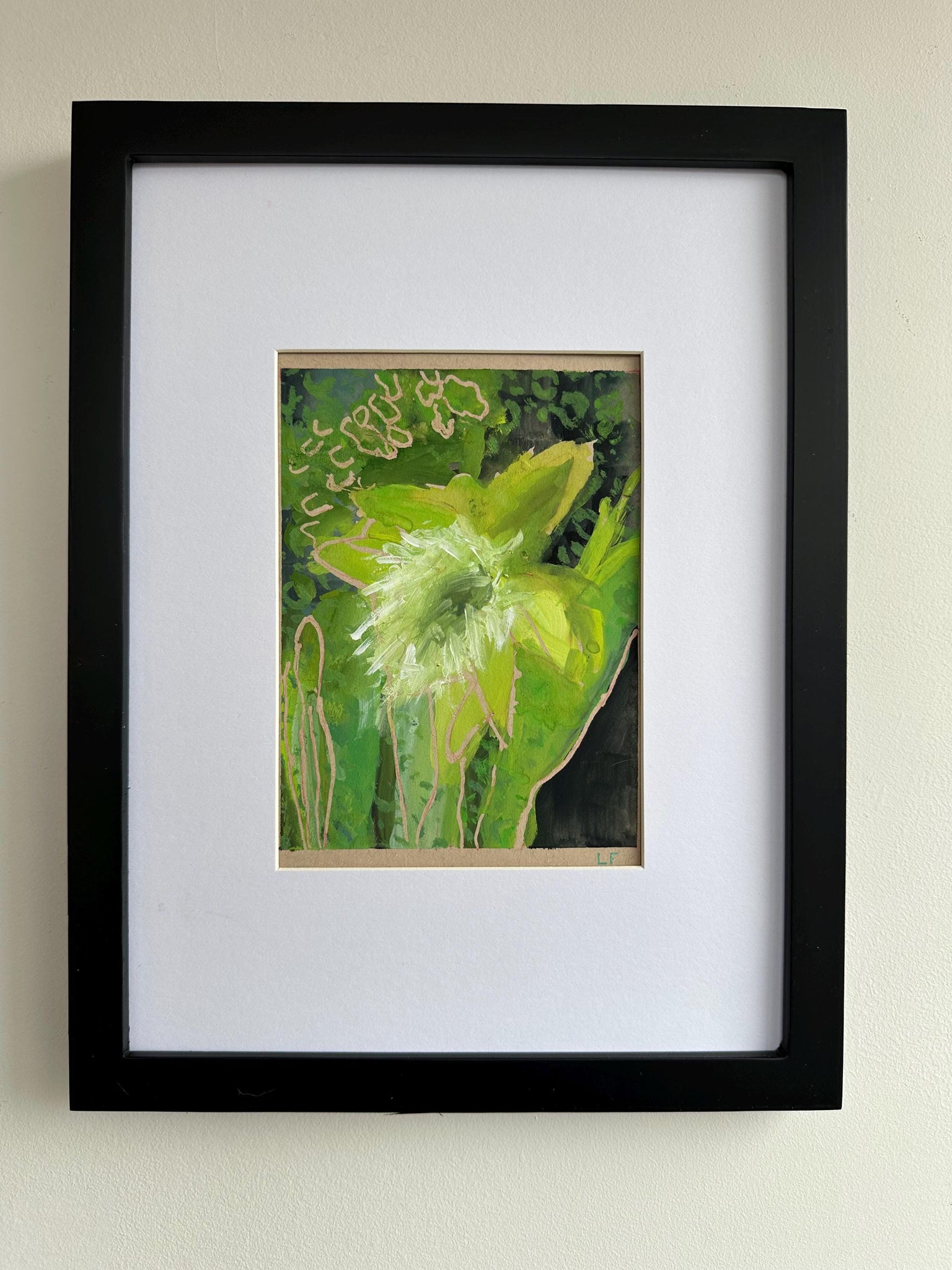 Original abstract painting. Gouache on beige mixed media paper. Black wood frame with plastic insert is included. Size including the frame is 13 x10 inches.