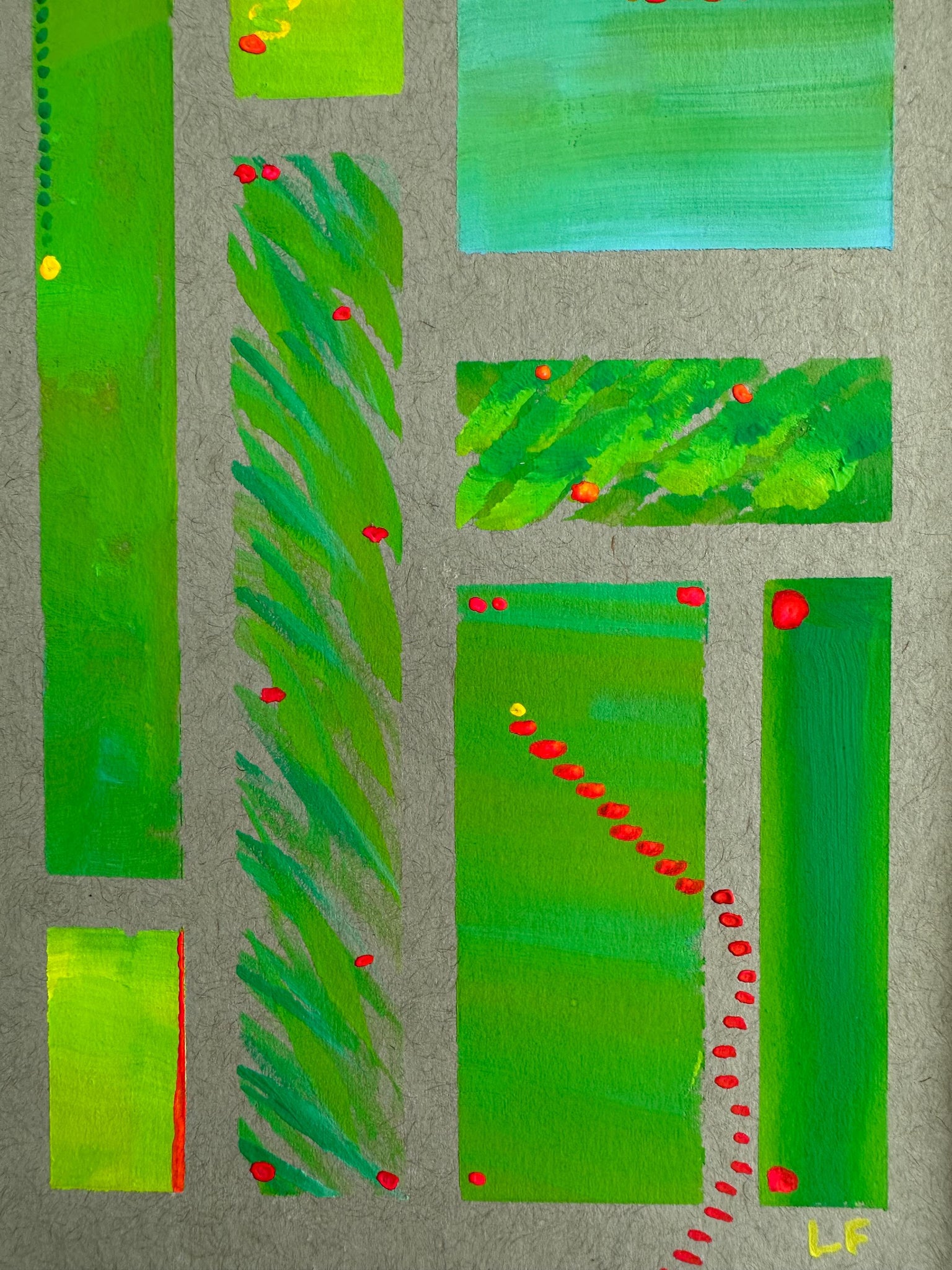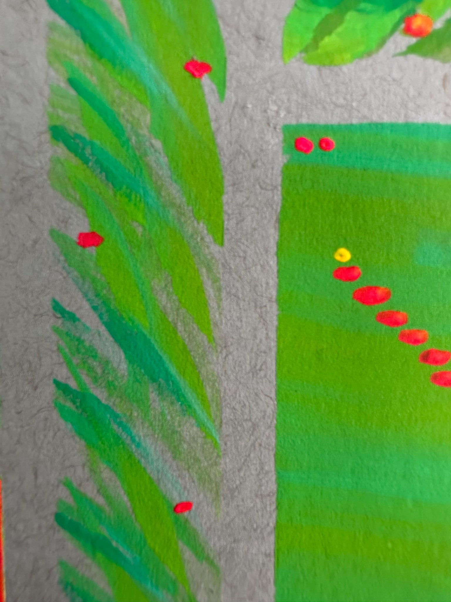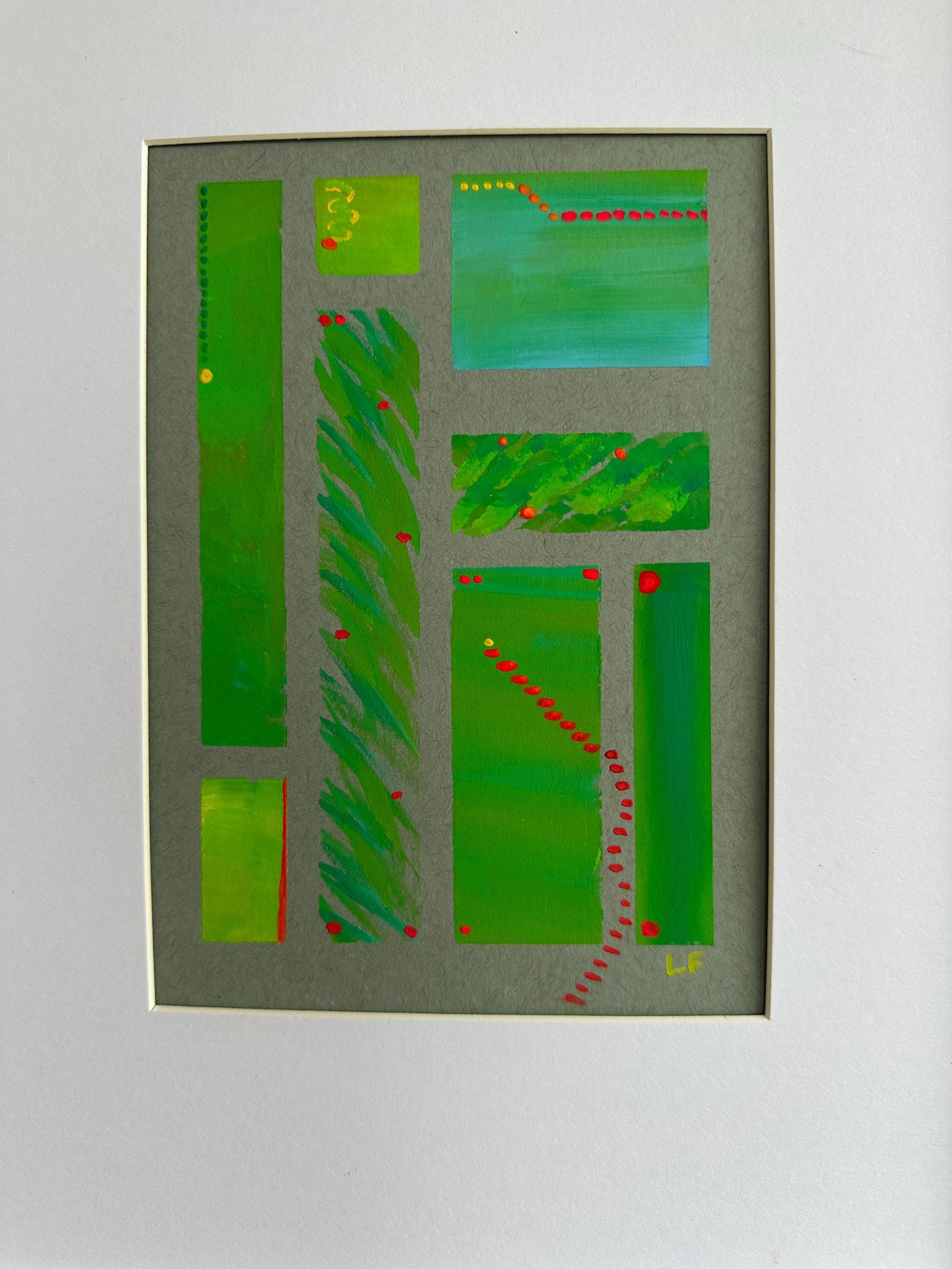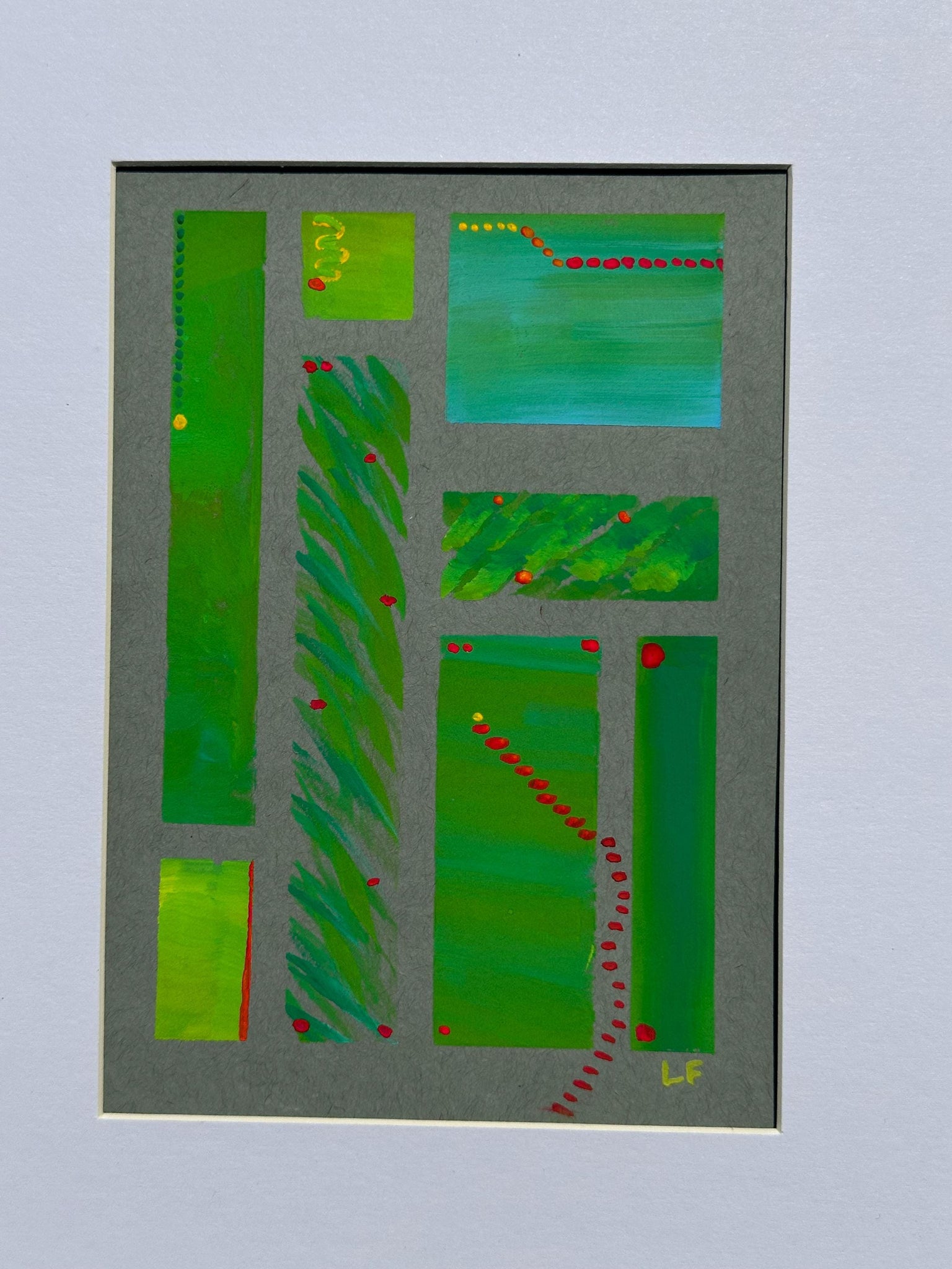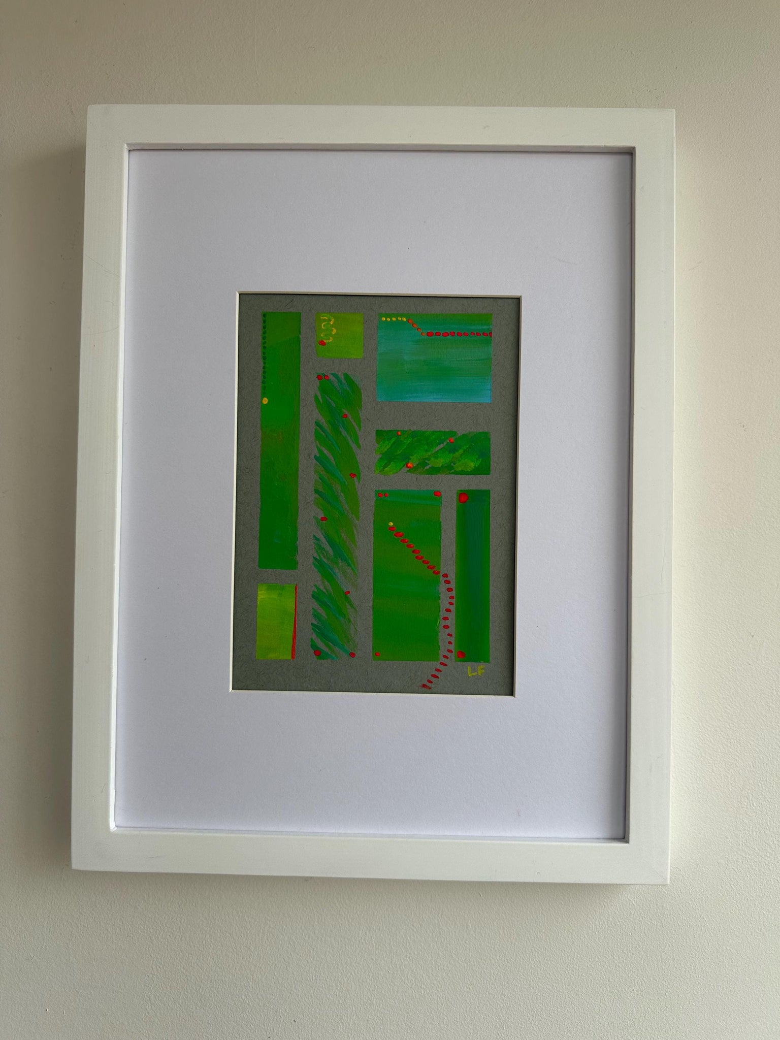 Original abstract painting. Gouache on gray mixed media paper. White wood frame with plastic insert is included. Size including the frame is 13 x10 inches.