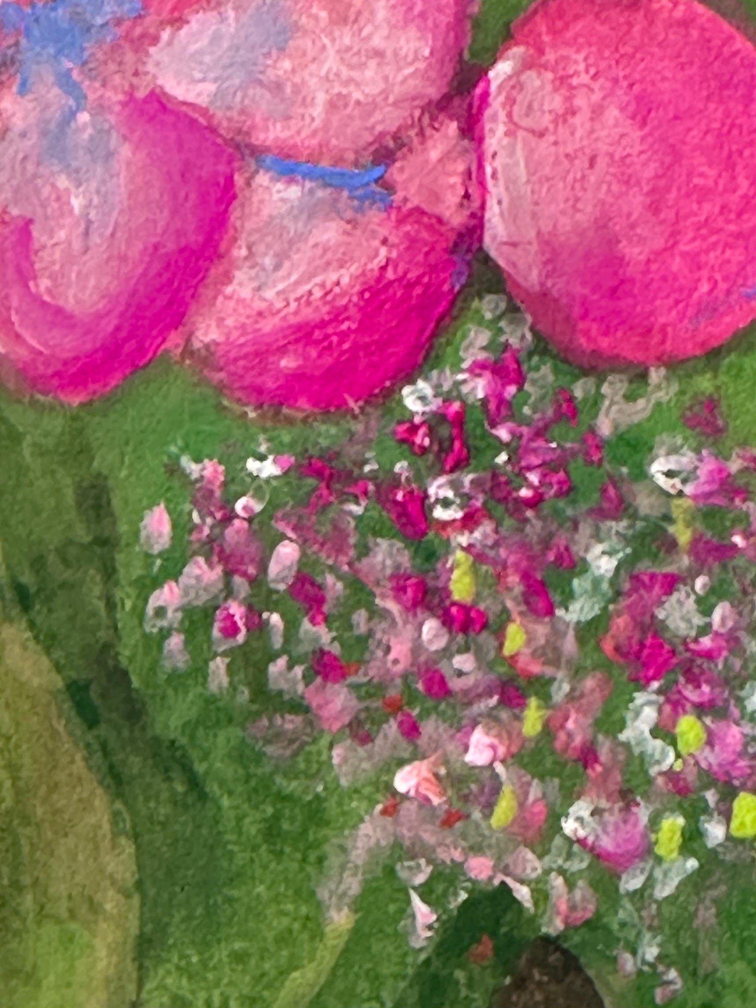 Mini painting - only 5 x 4. Painting from an original photo I took at Longwood Gardens outside Philadelphia. Gouache on mixed media paper. Grey green wood frame with clear plastic insert is included. Size including the frame is 5 x 4 inches.