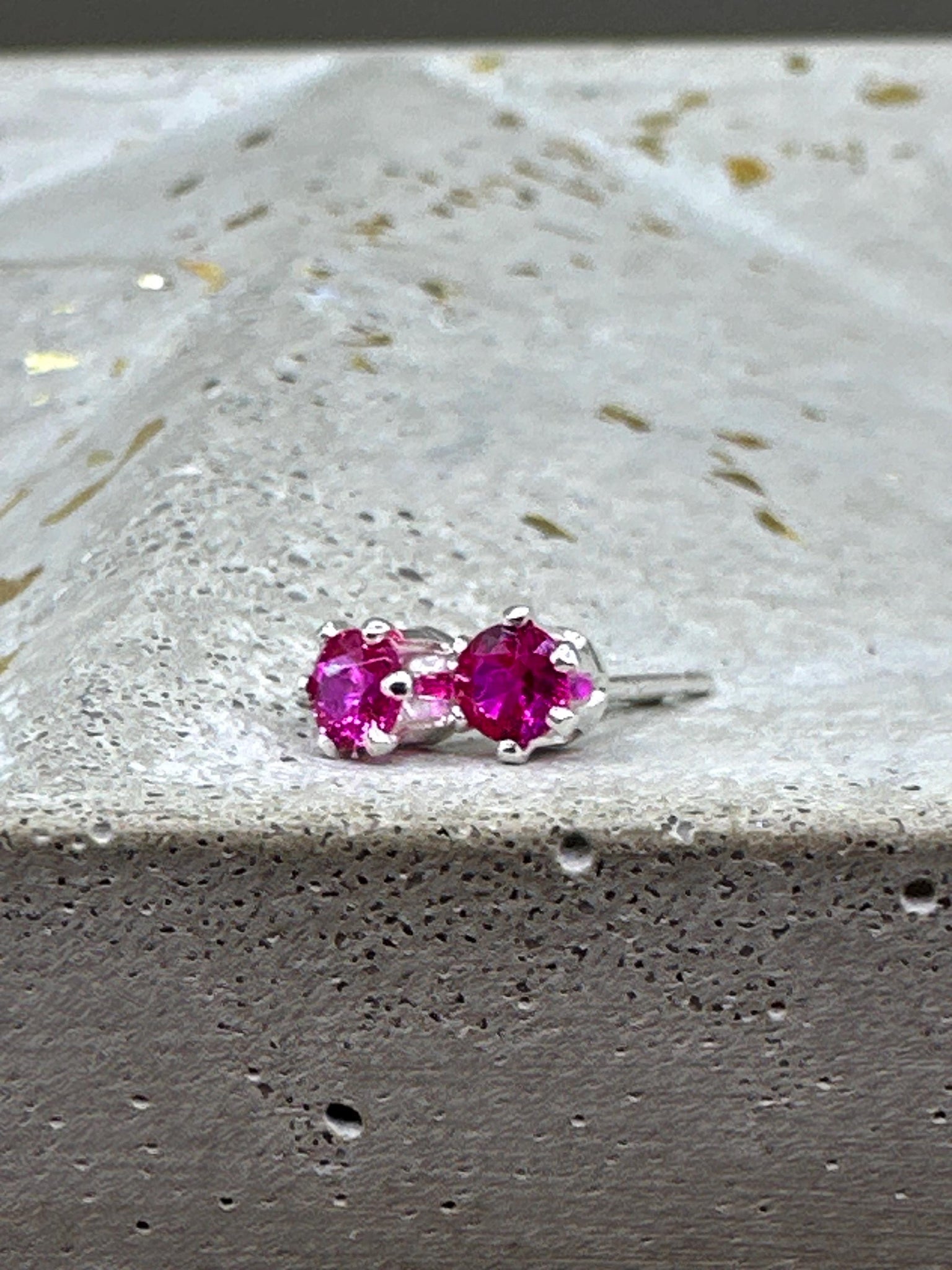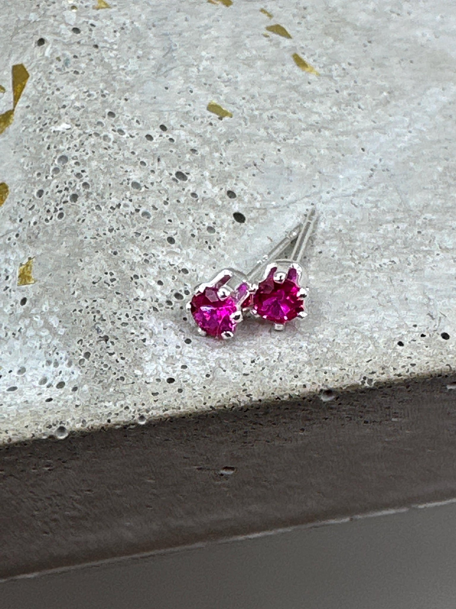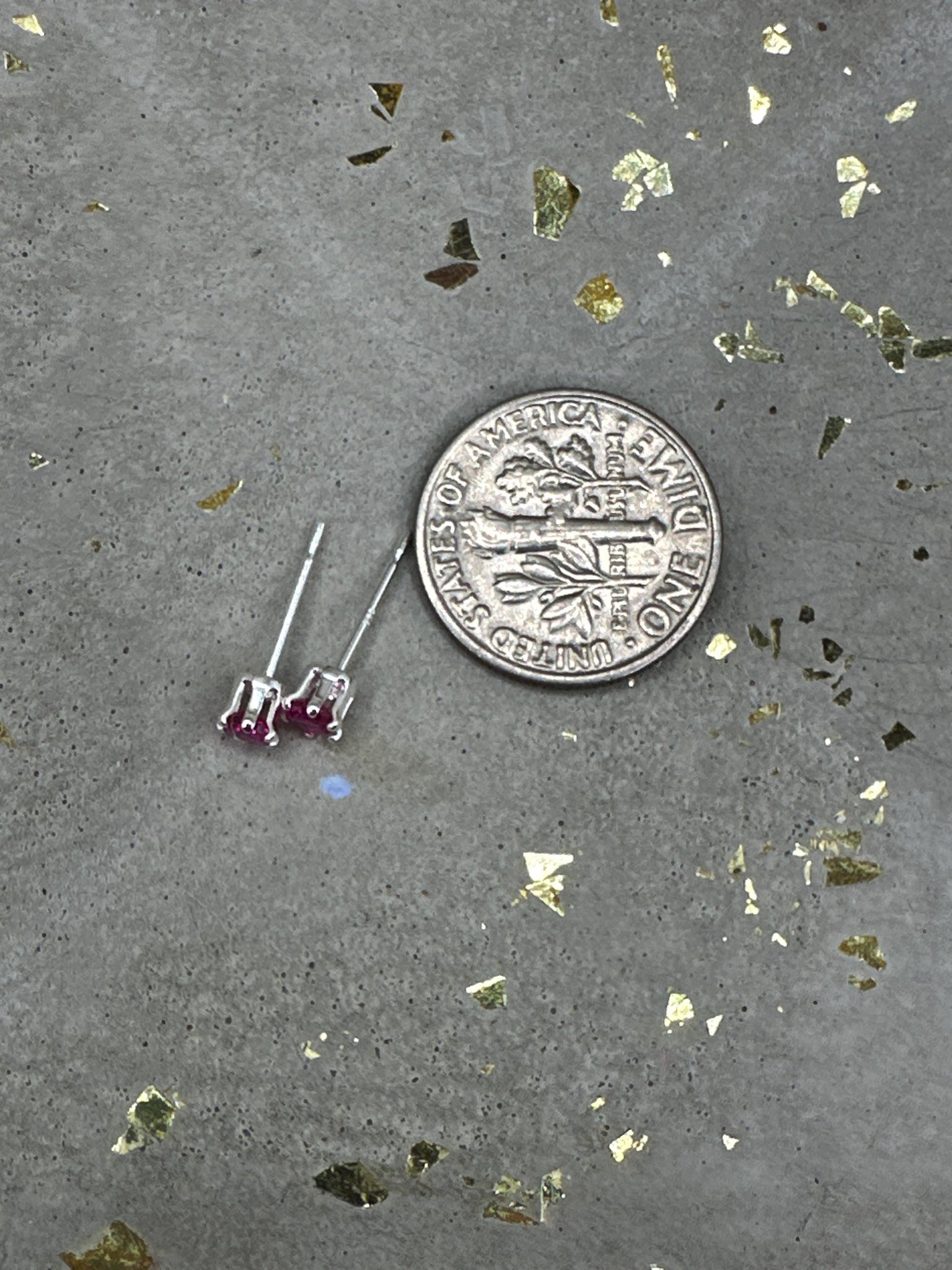 Lab grown ruby stud earrings in silver. Gemstones are 3mm in diameter. 2mm millimeter stones are also available. Picture shows the 2mm and 3mm side by side.