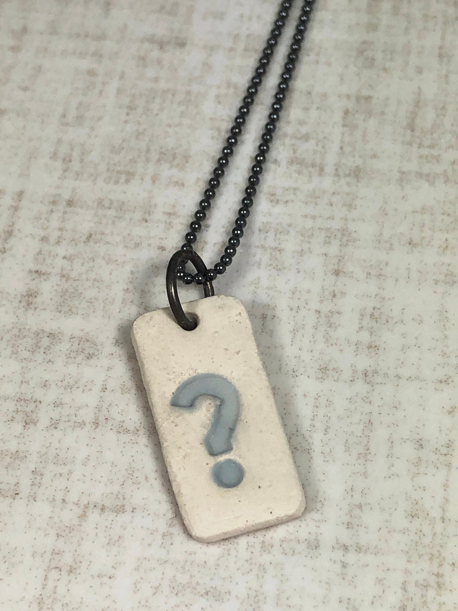 Light blue ? on matte white ceramic pendant on black silver ball chain. Handmade and unique. Each pendant is different.