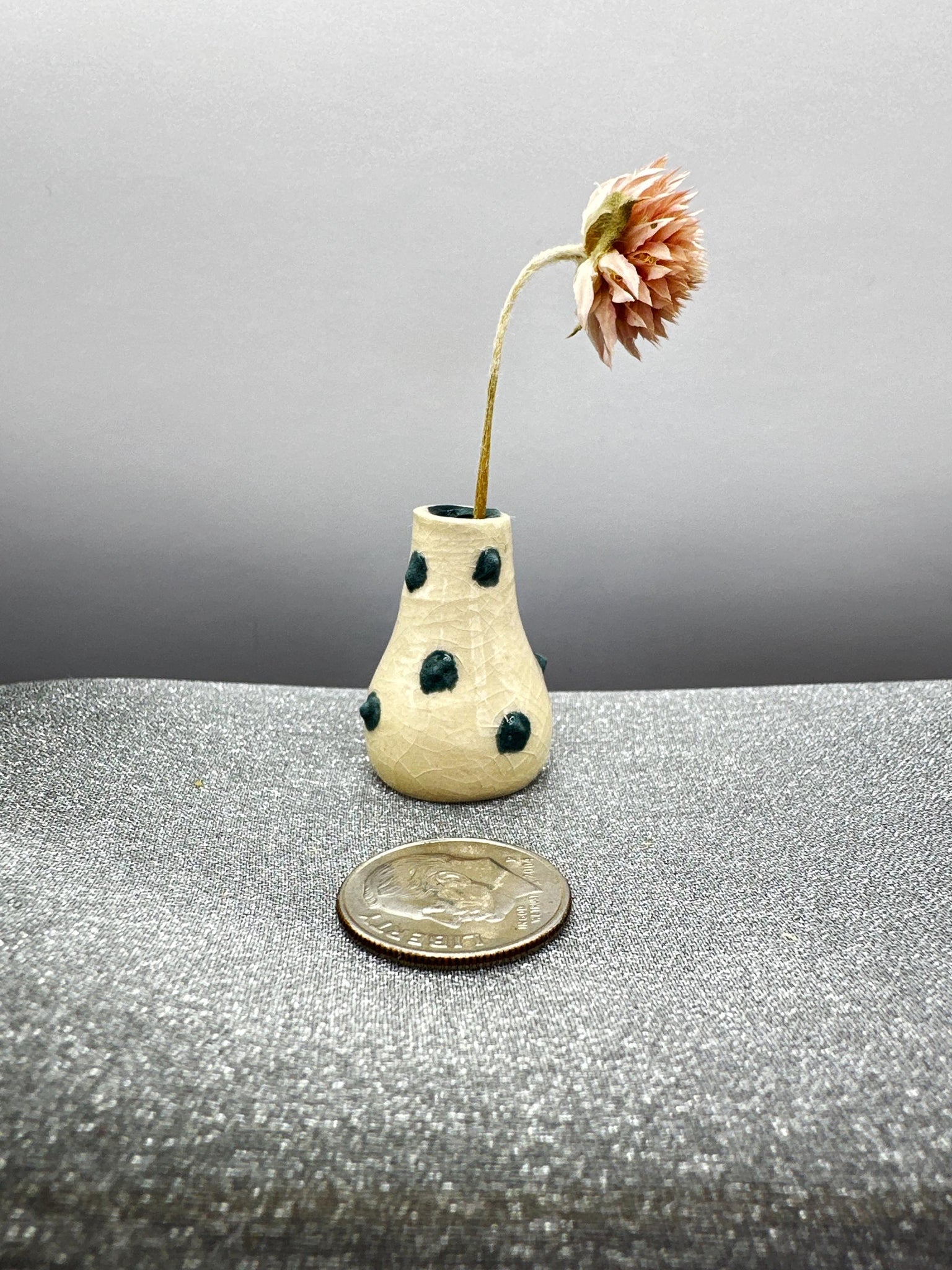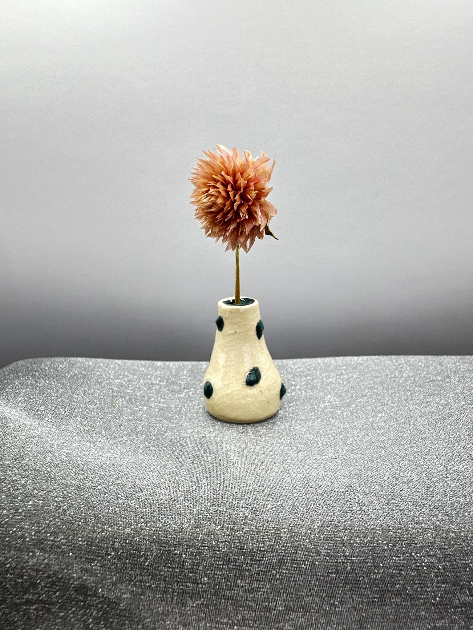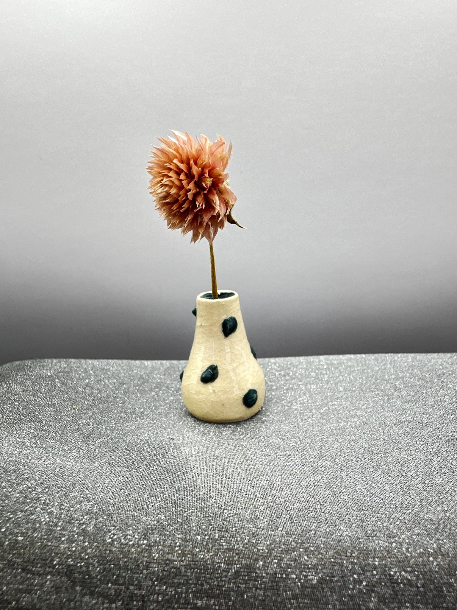 Hand thrown tiny ceramic vase. Smoky blue bumps on clear crackle glaze on white clay. Comes with small dried flower shown. One-of-a-kind. You will receive this exact vase.