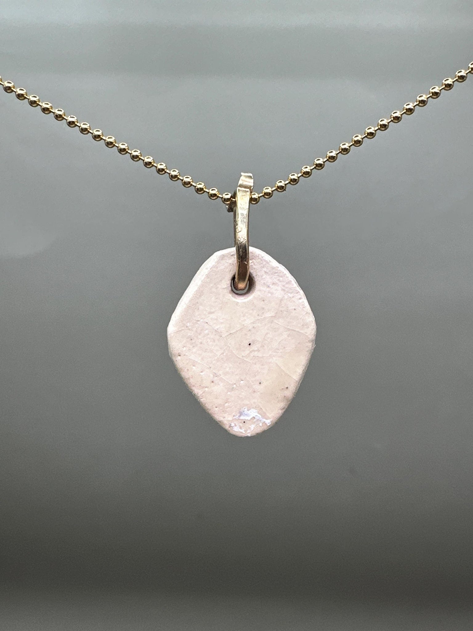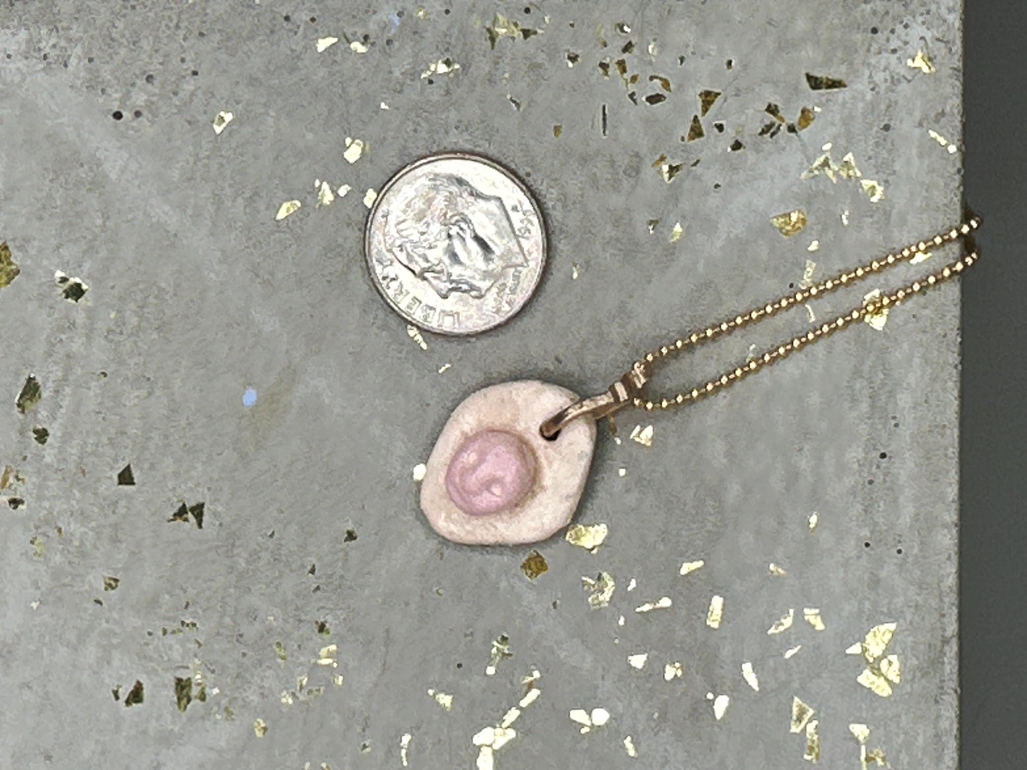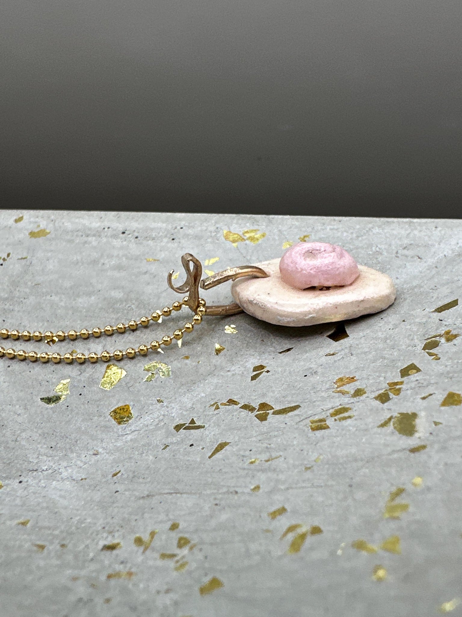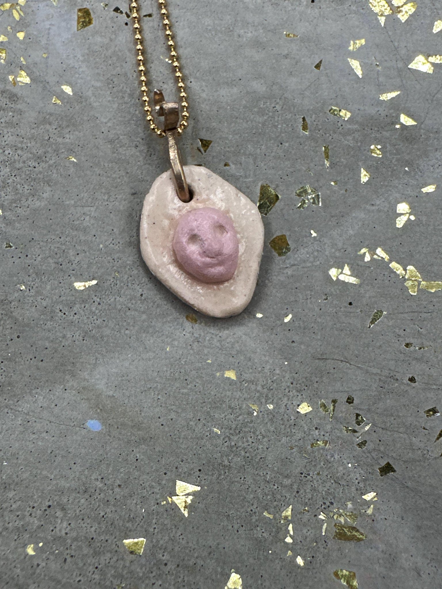 Ceramic pendant on gold filled ball chain. Pink face on white background. Handmade and unique. Each pendant is different.