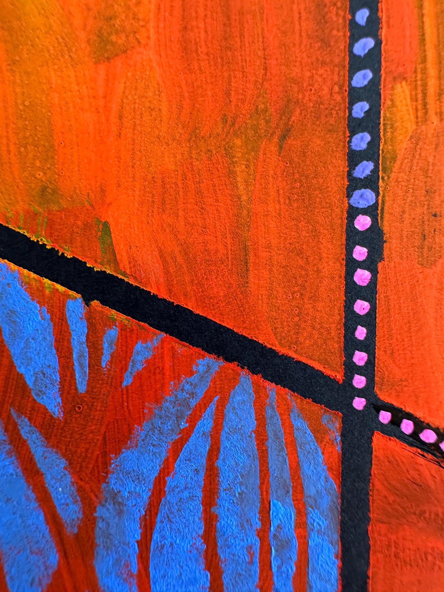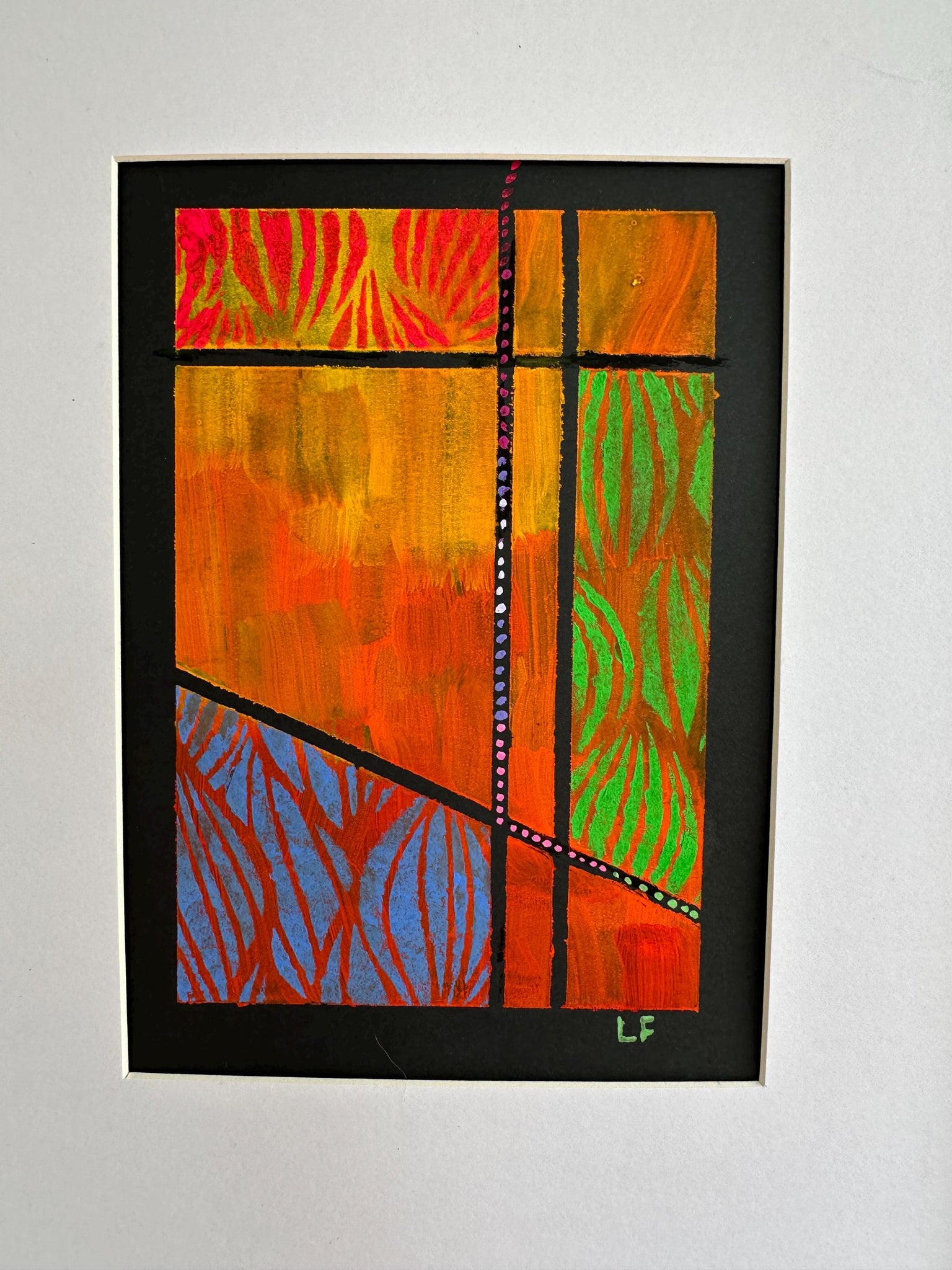Original abstract painting. Gouache on gray mixed media paper. White wood frame with plastic insert is included. Size including the frame is 13 x10 inches.