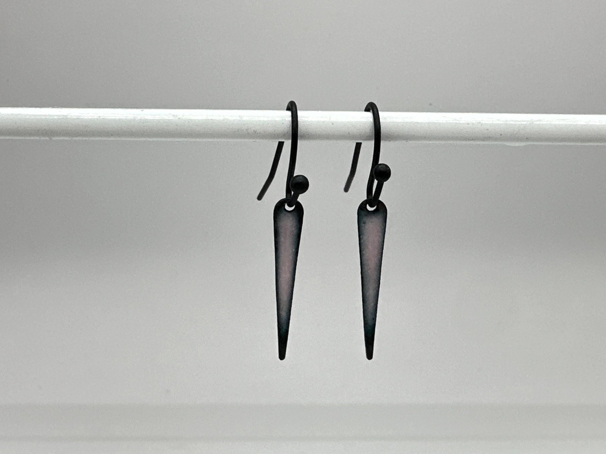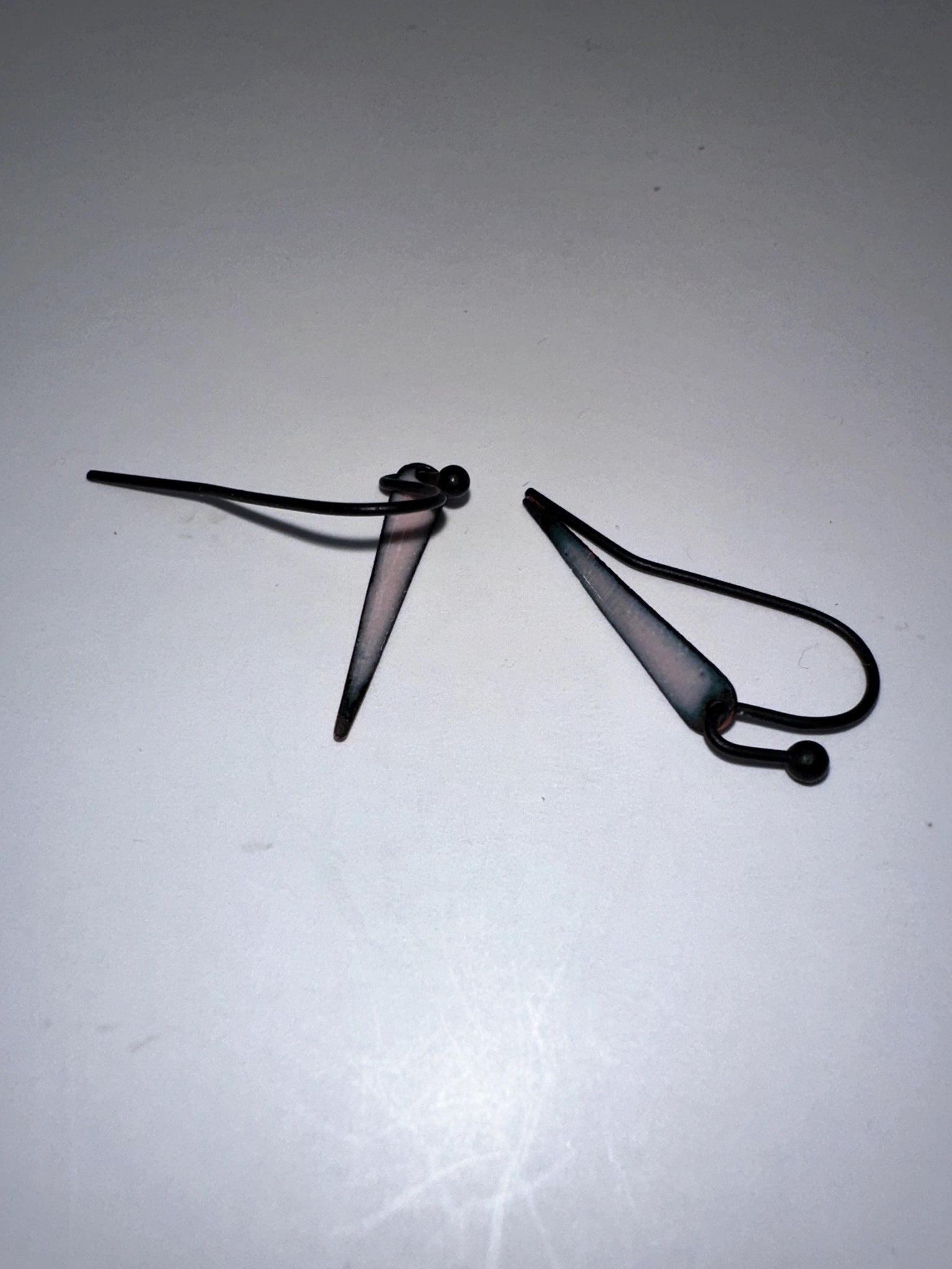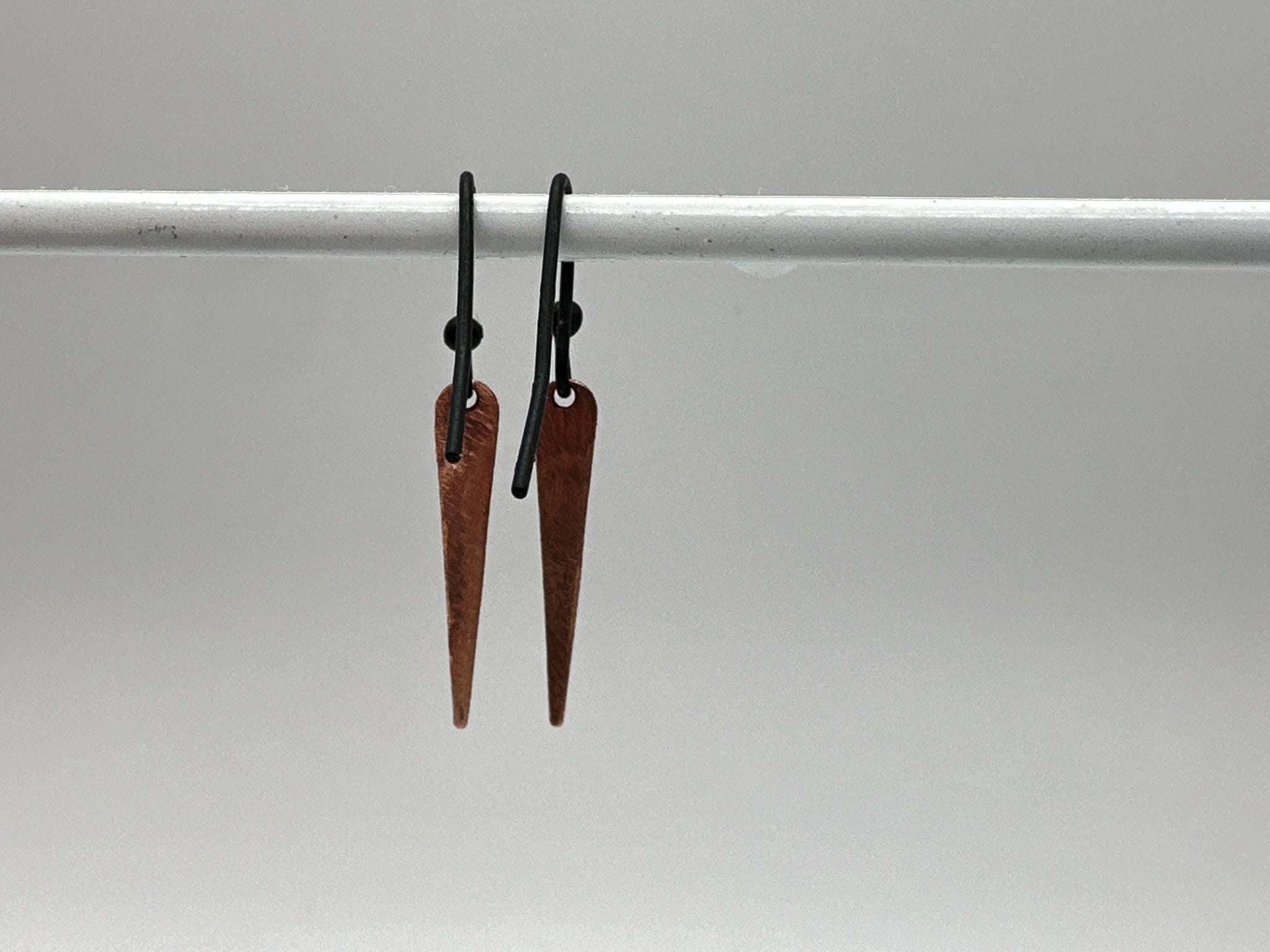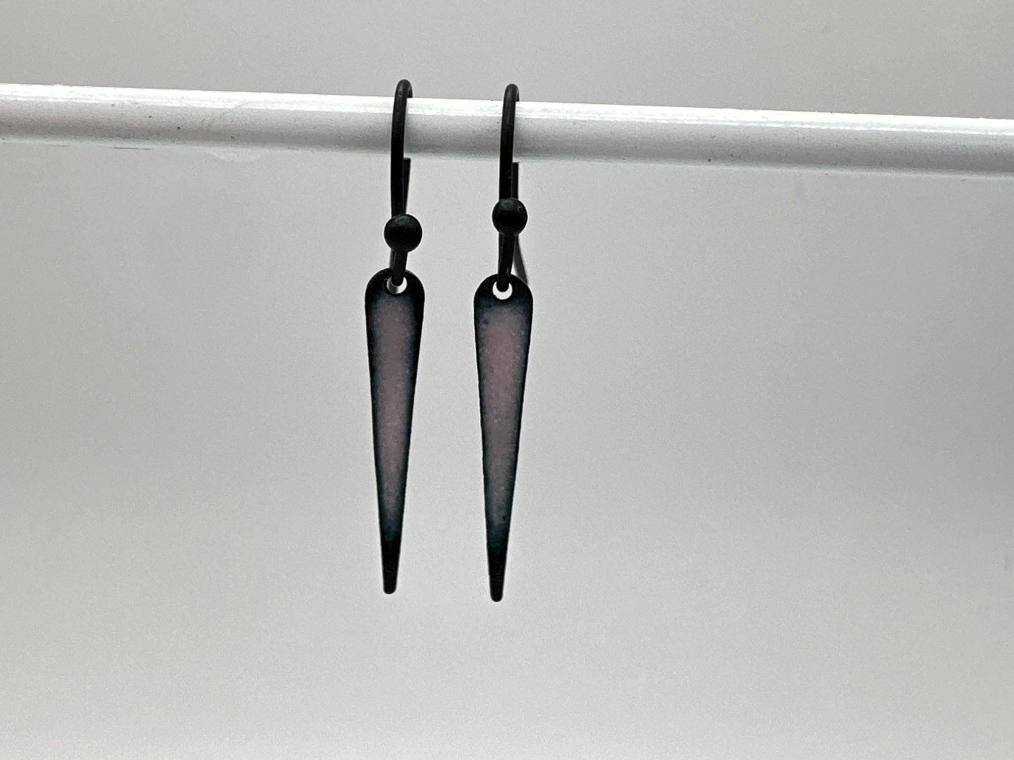 Pale pink enamel on copper spike shaped drop earrings. Backs are unfinished copper. Ear wires are black finished brass.