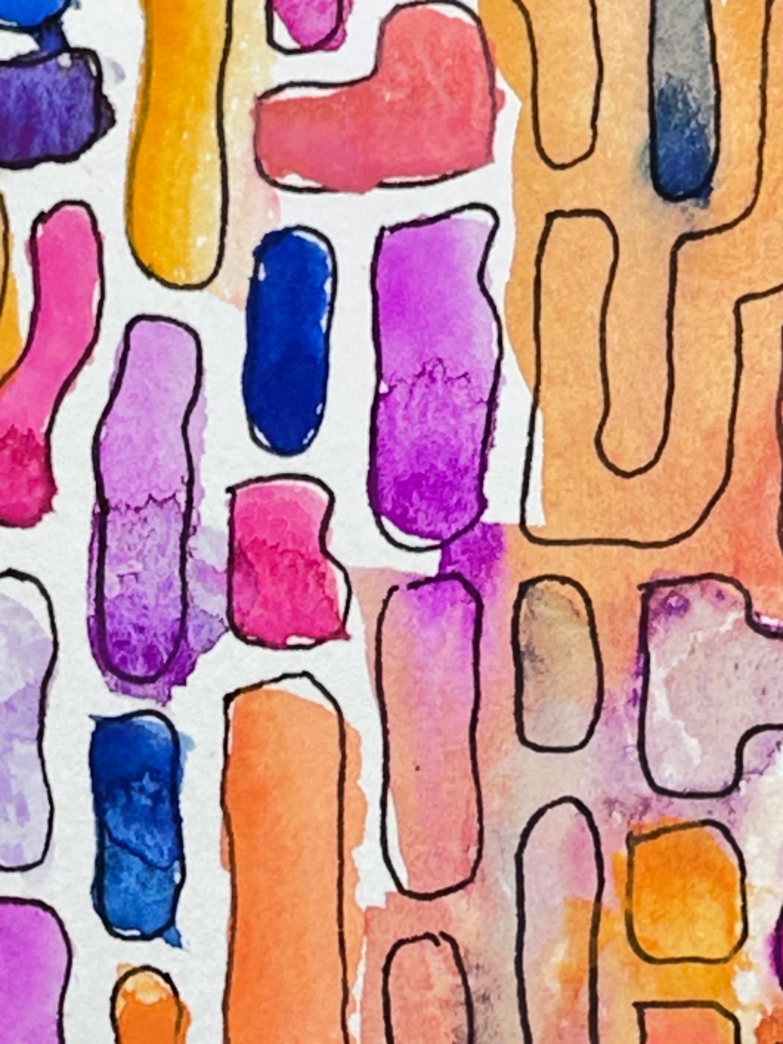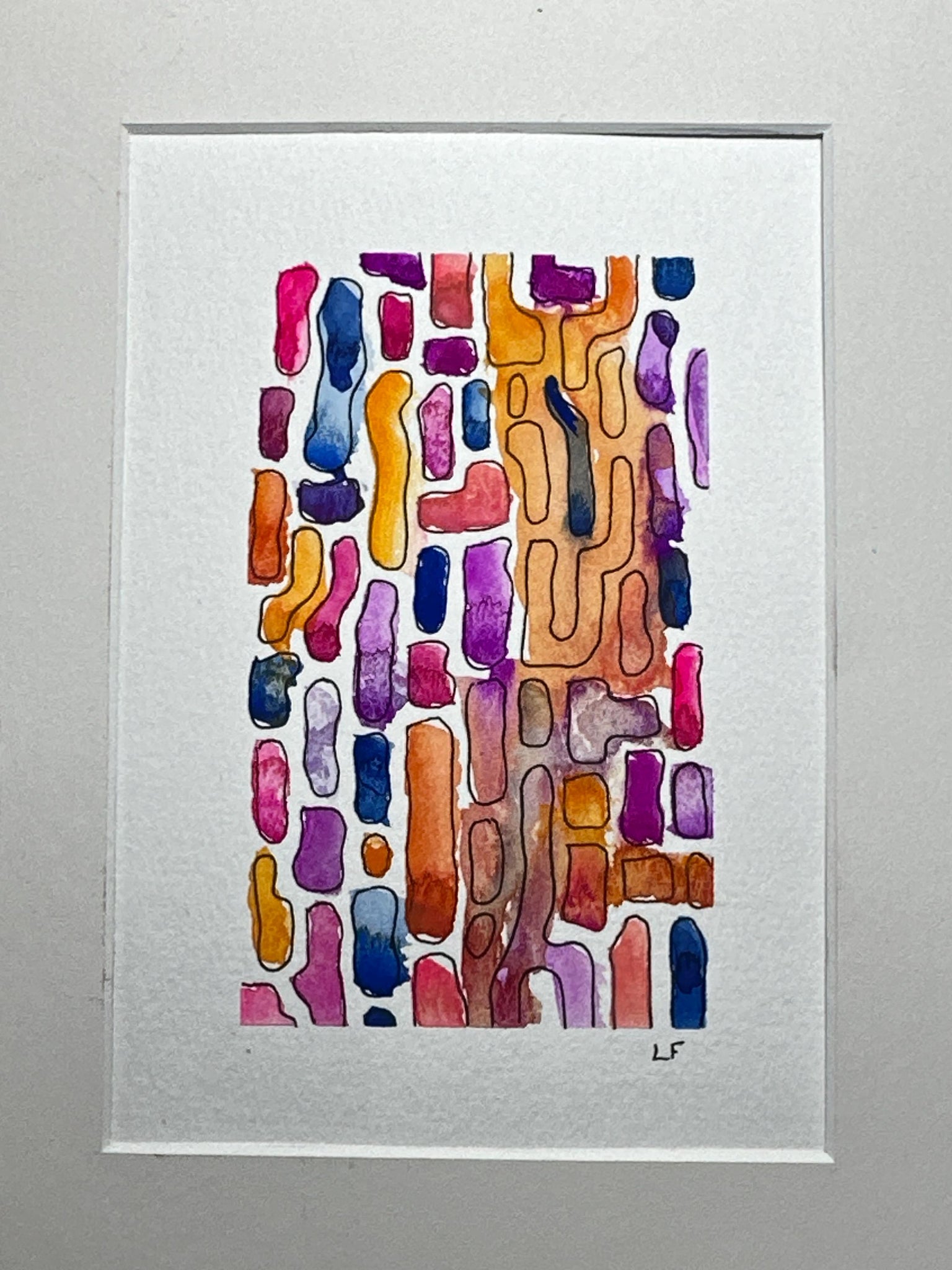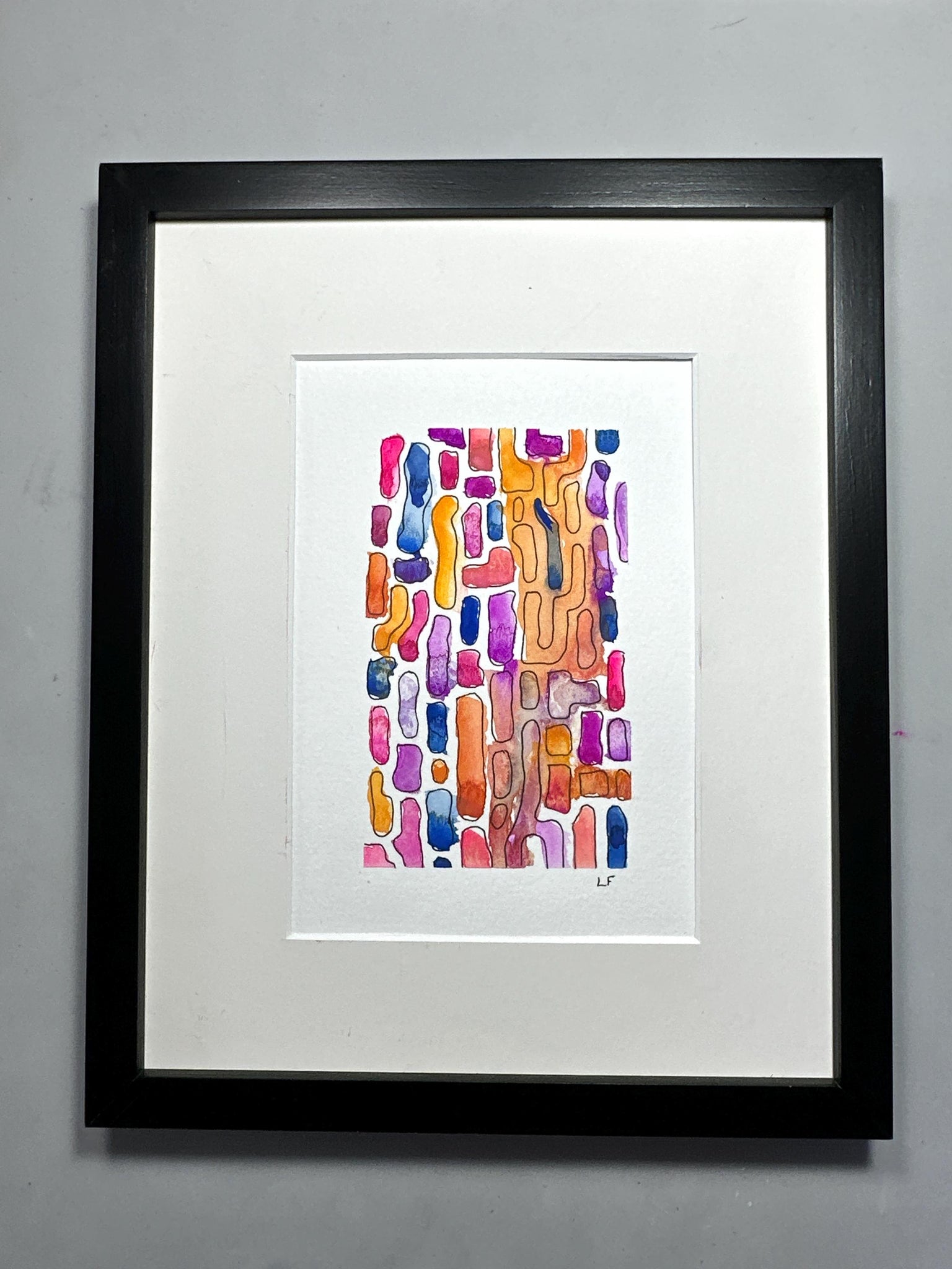 Original abstract painting of pink, orange, blue and purple shapes. Gouache and ink on watercolor paper. Black wood frame can be included. Size including the frame is 11 x 9 inches. Image size is 5.5 x 4 inches.