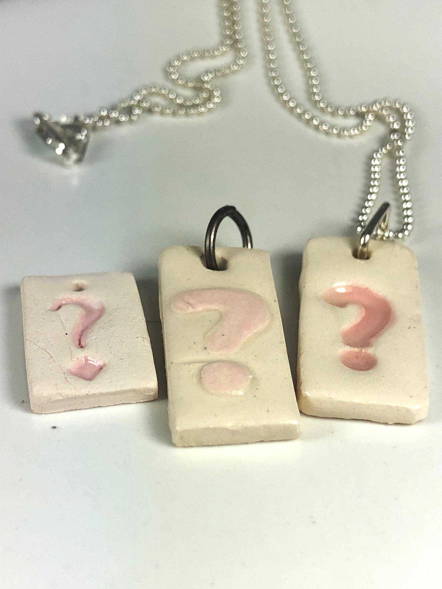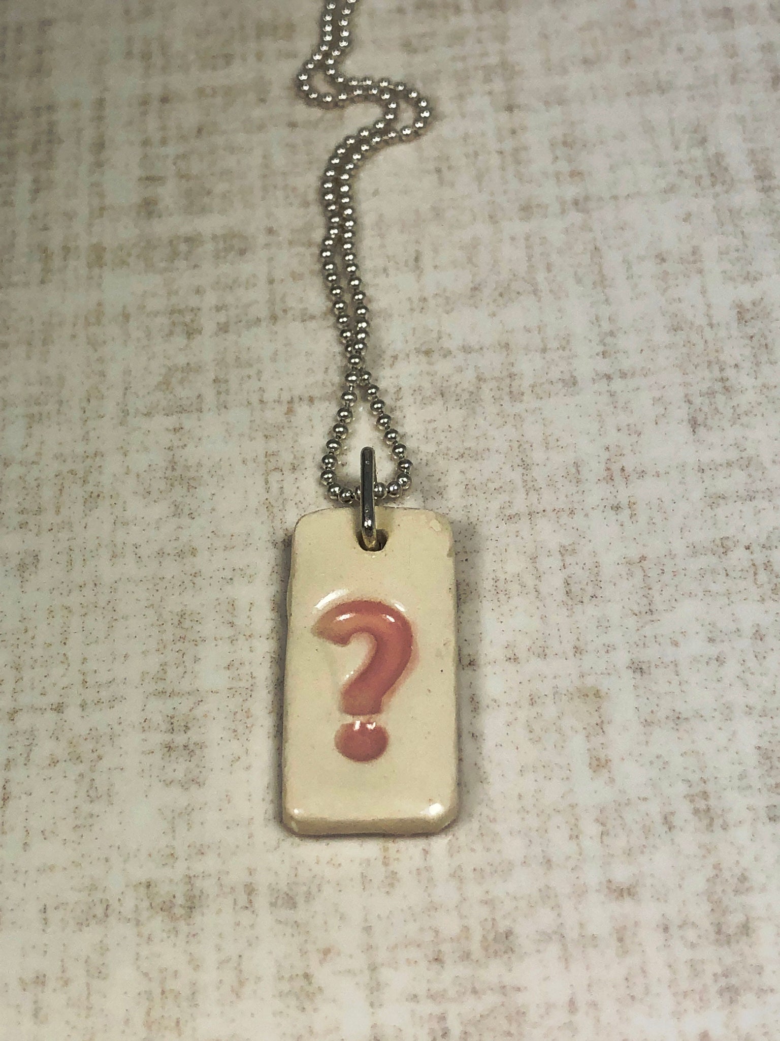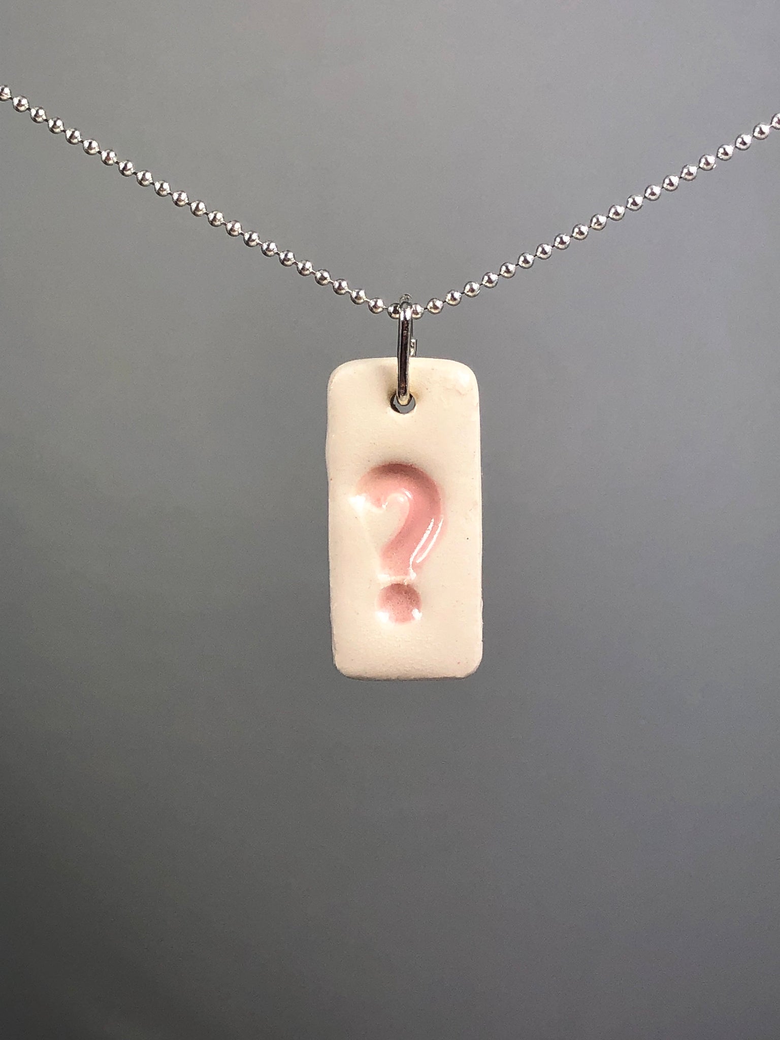 Pink ? on white ceramic pendant on silver ball chain. Handmade and unique. Each pendant is different.