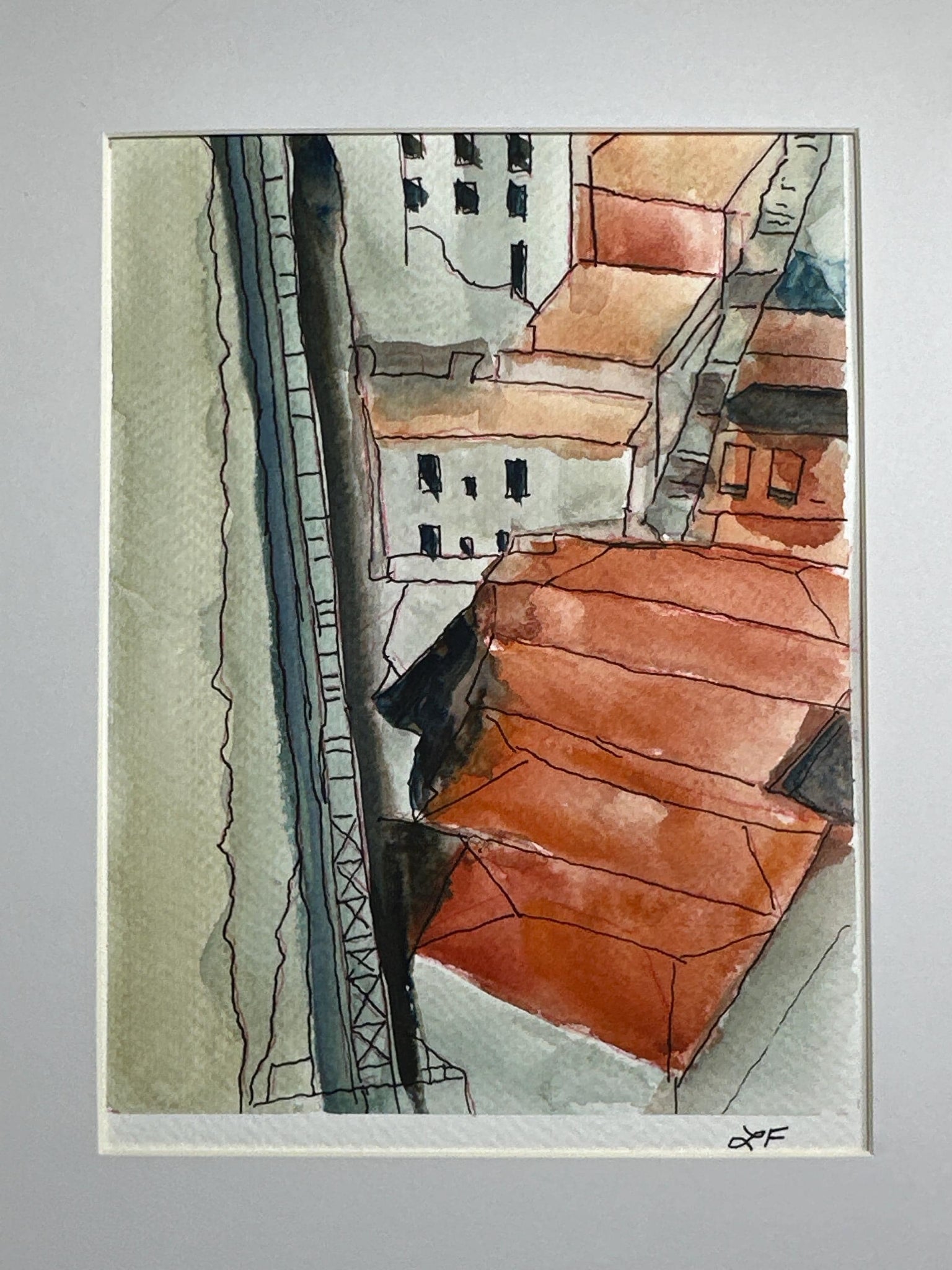 Original painting of a hill in Porto, Portugal. From an original photo. Gouache and ink on watercolor paper.