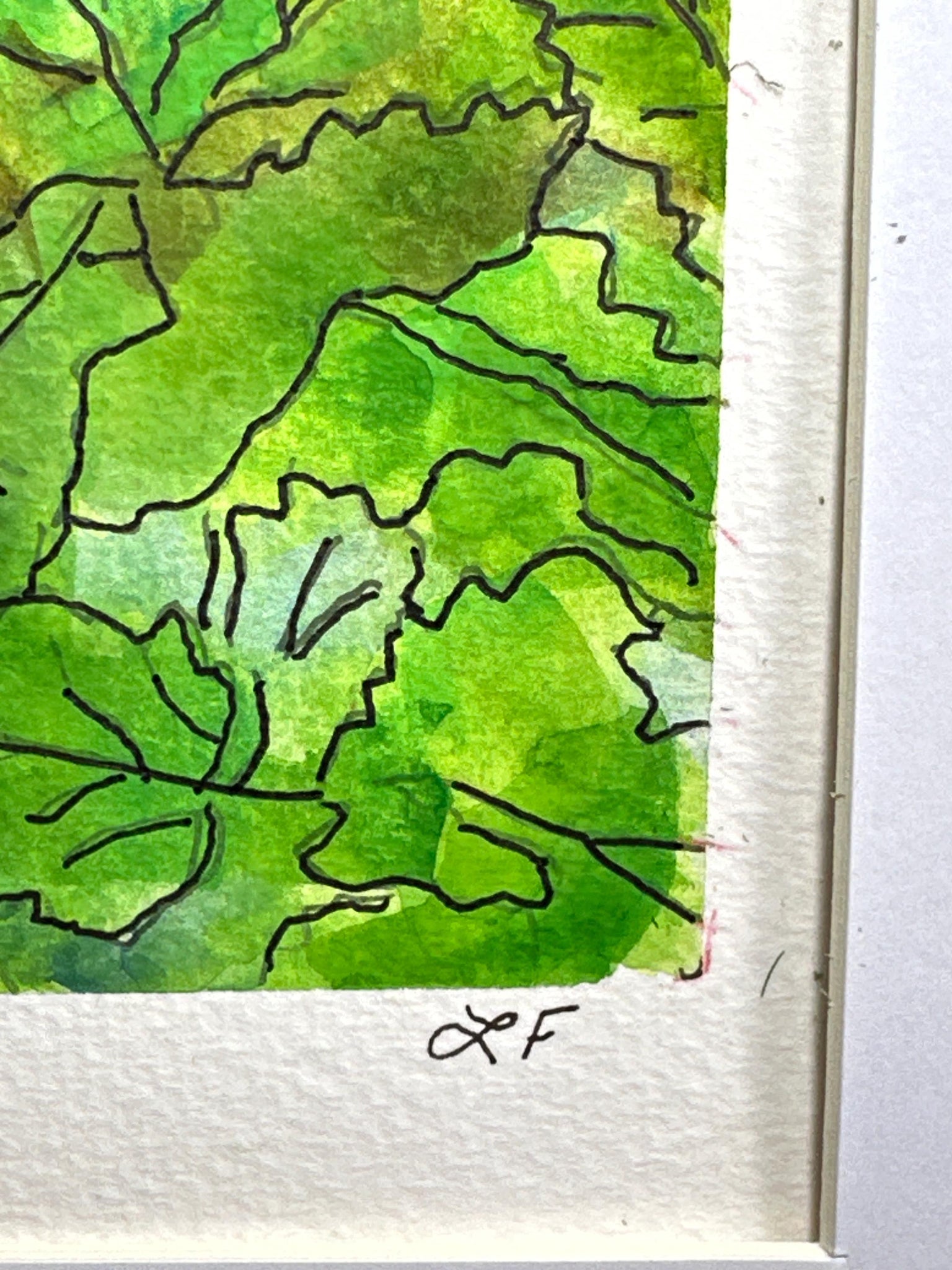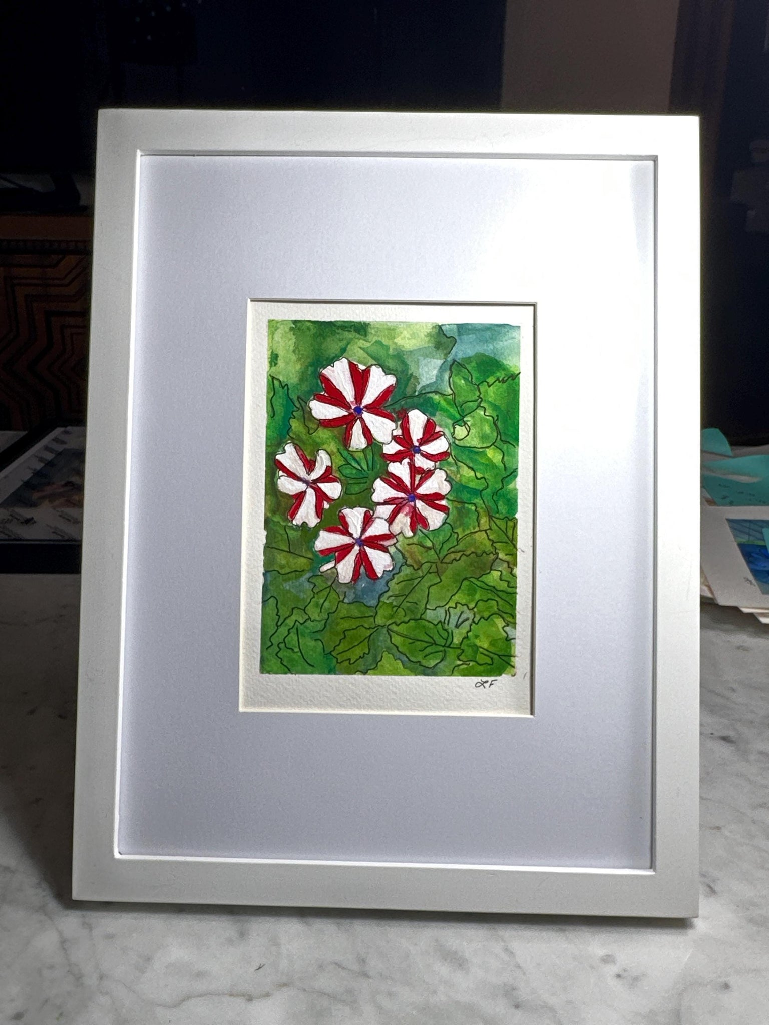 Original painting of red and white vincas. From an original photo taken in Colts Neck, New Jersey. Gouache and ink on watercolor paper.