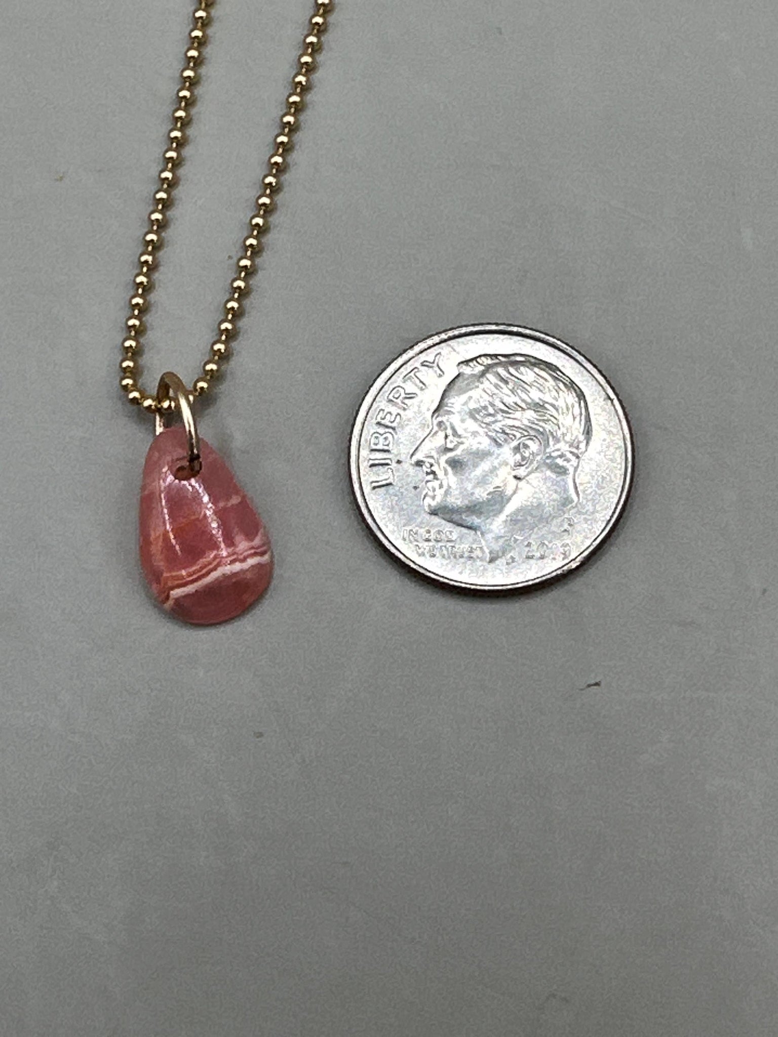 Small rhodochrosite cabochon pendant. Drilled stone on gold-filled ball chain.