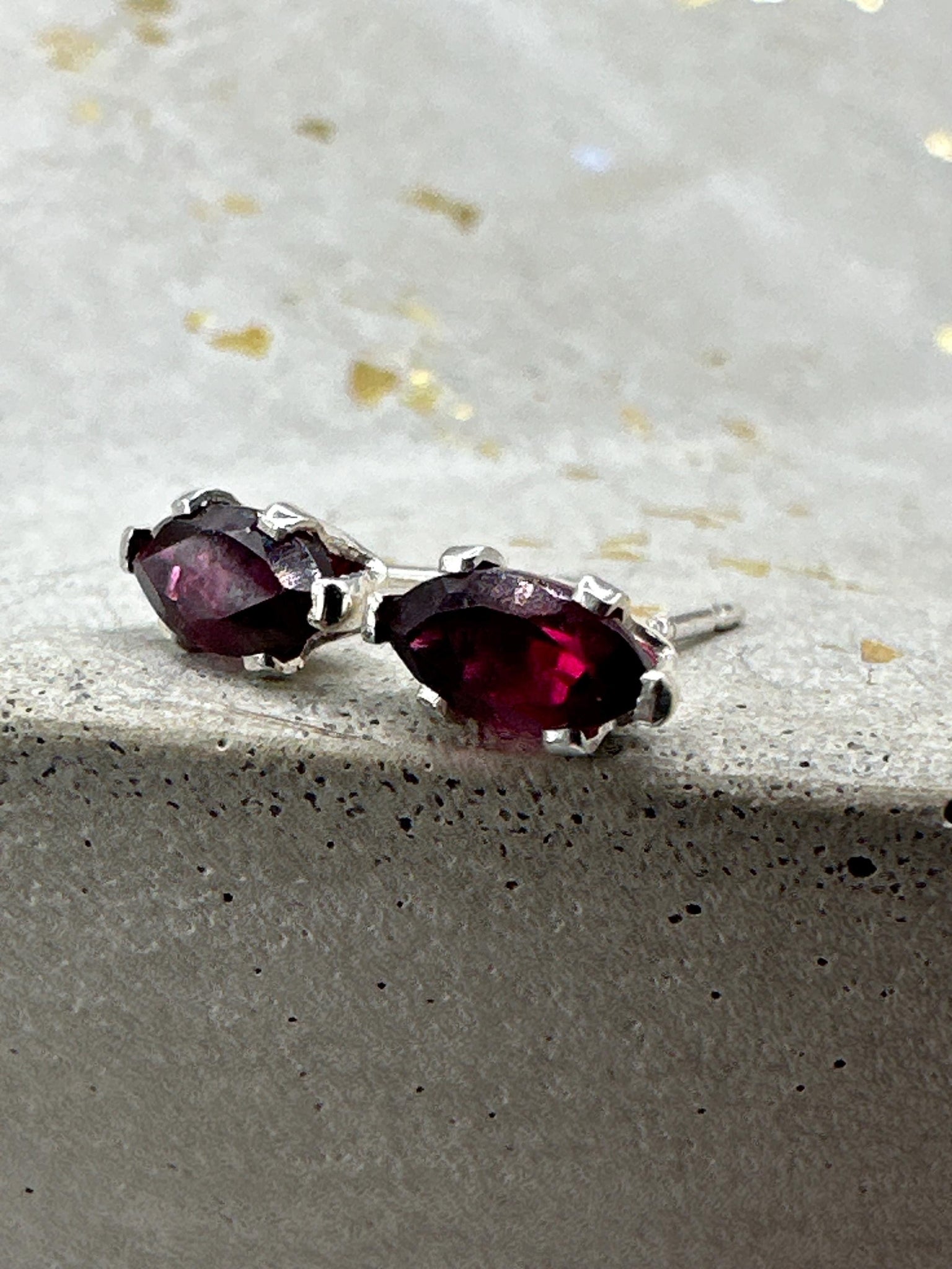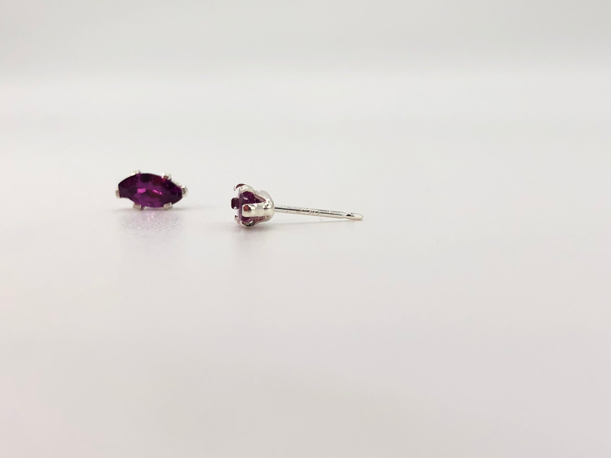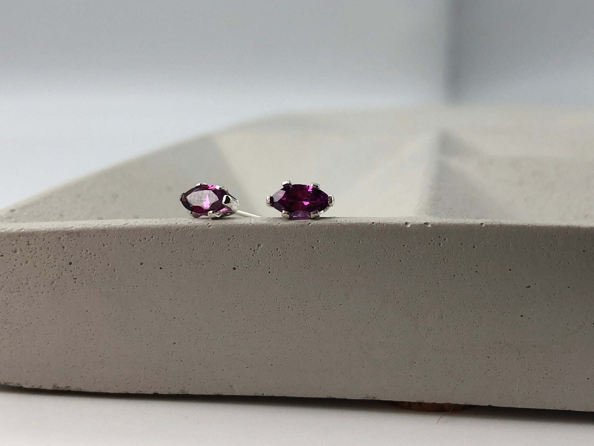 Rhodolite garnet marquise shaped stud earrings in silver settings. Gemstones are 6mm by 3mm. Beautiful purplish red color.
