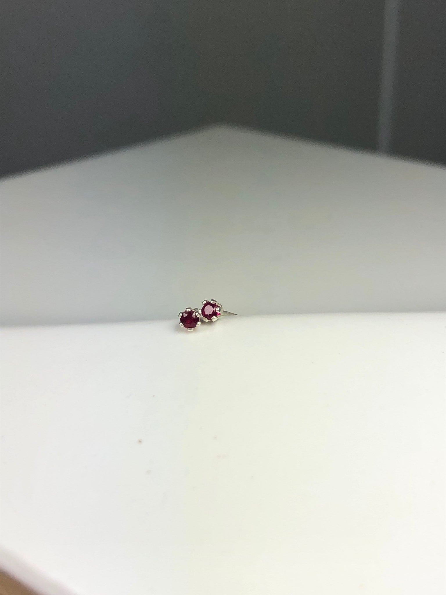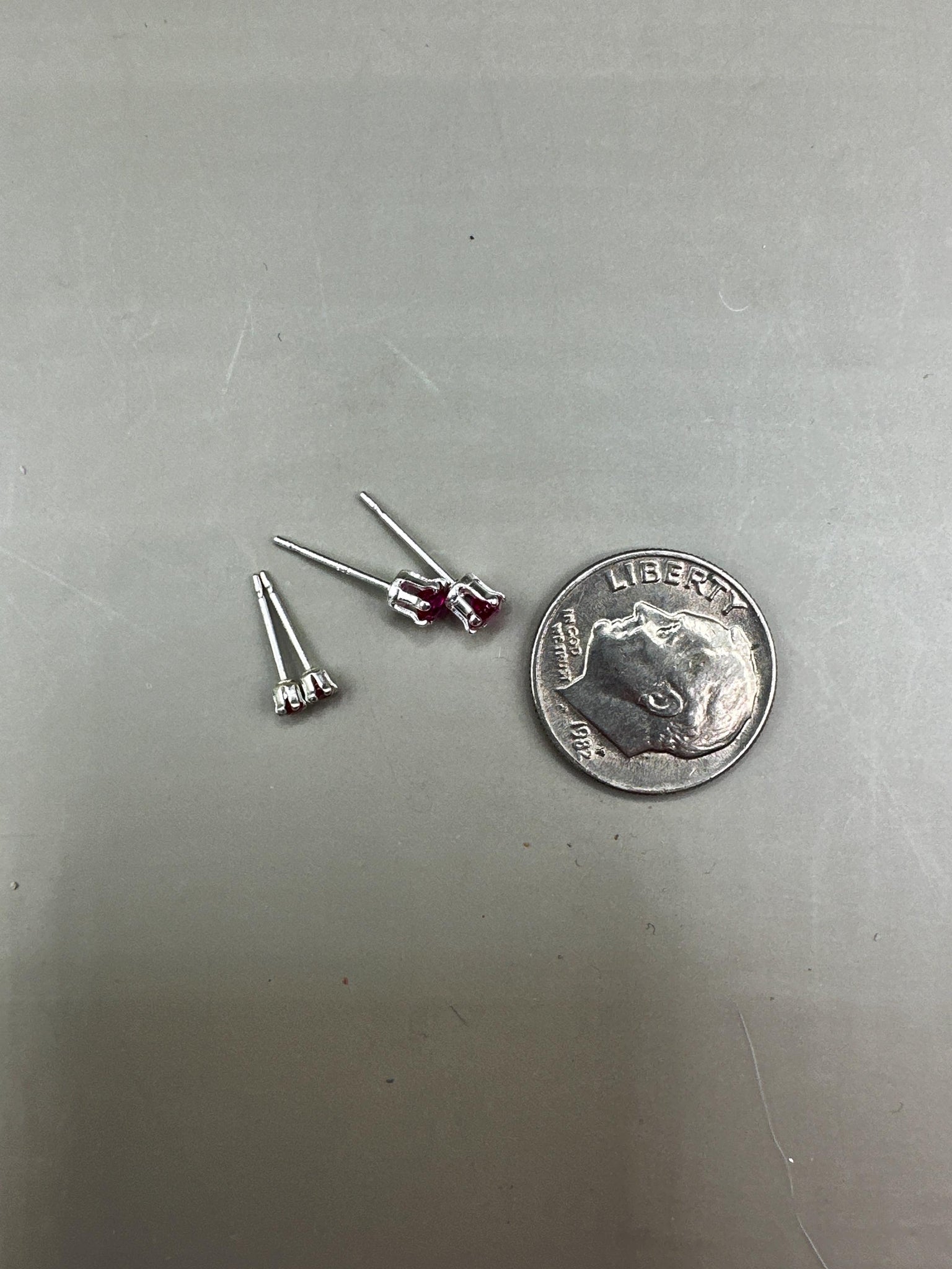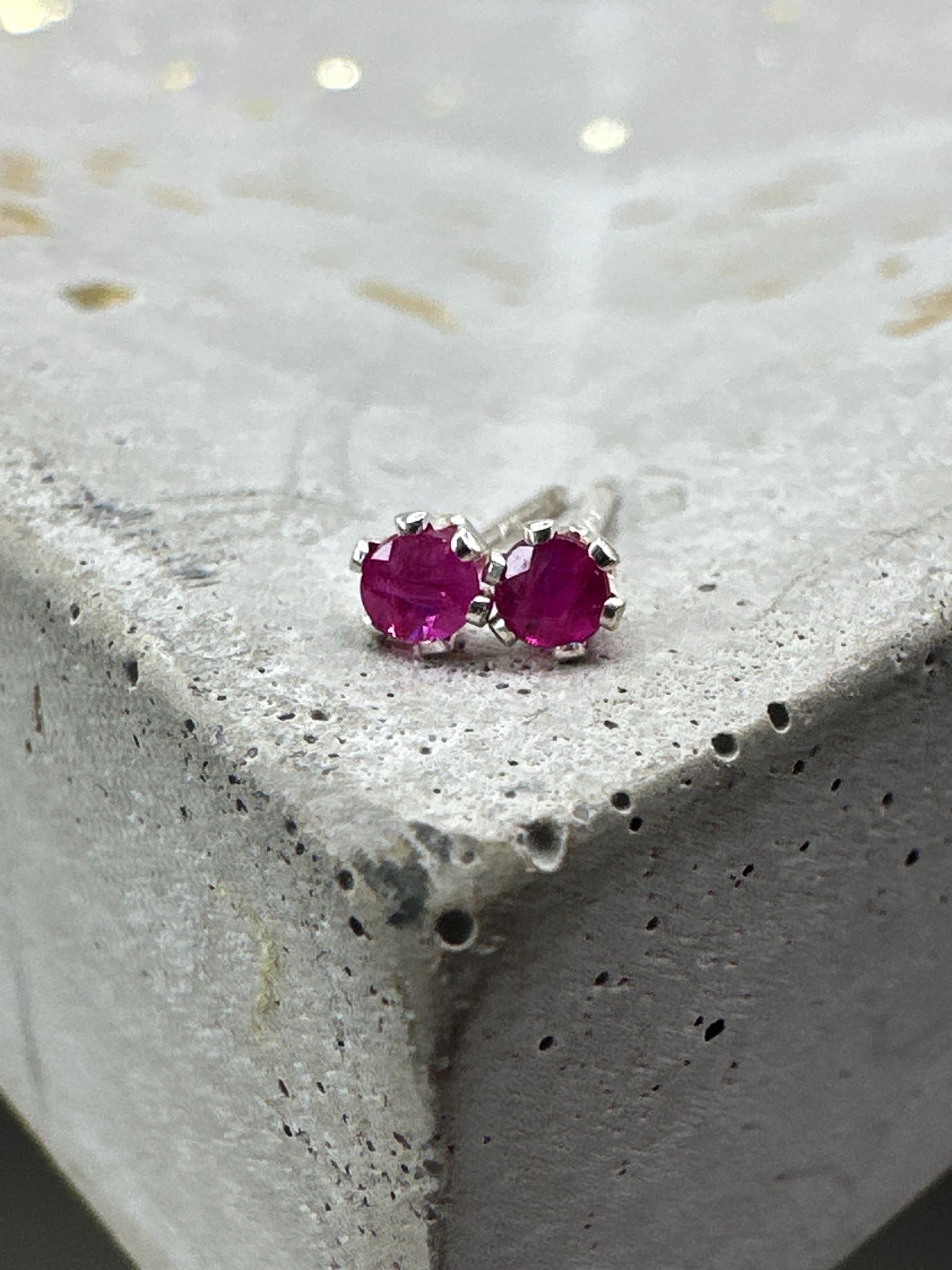 Natural ruby stud earrings in sterling silver settings. Gemstones are 2mm in diameter. 3mm stones are also available. Picture shows 2mm and 3mm side by side.