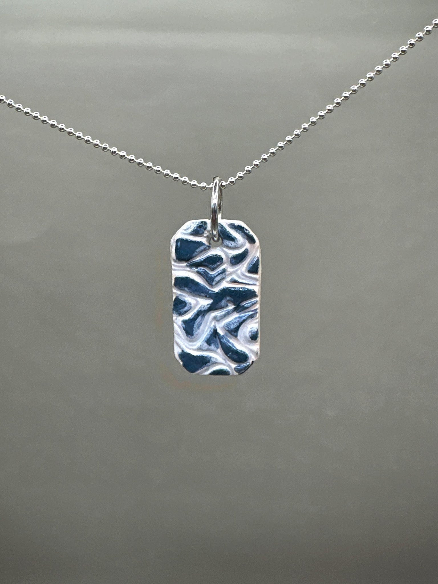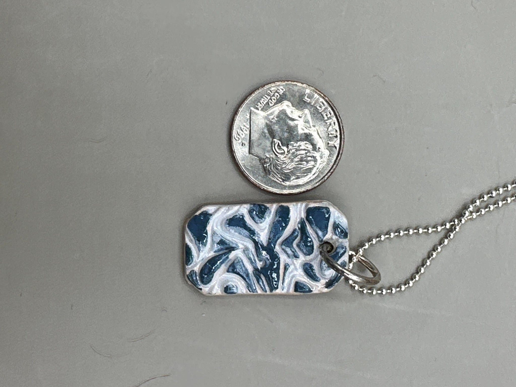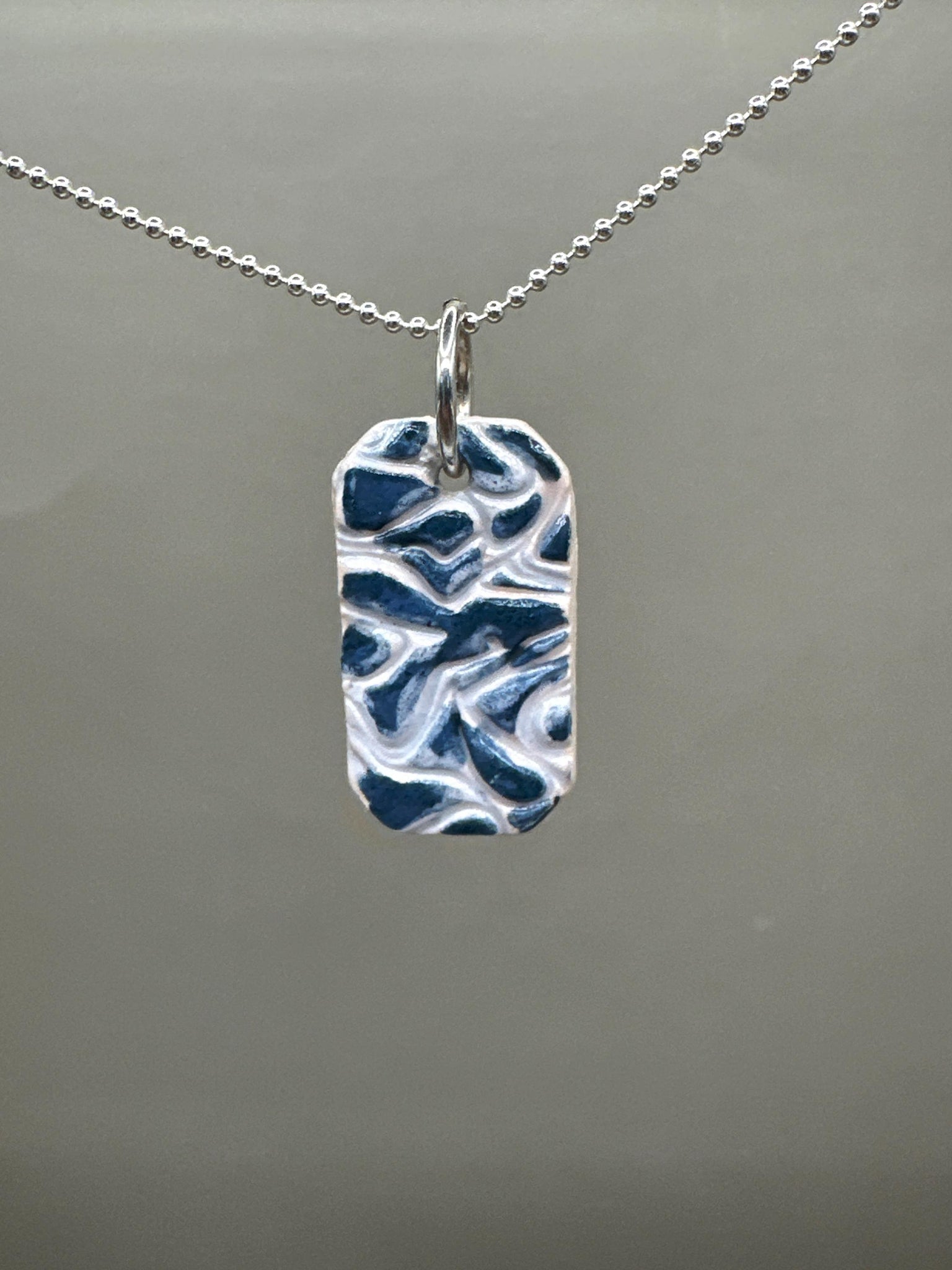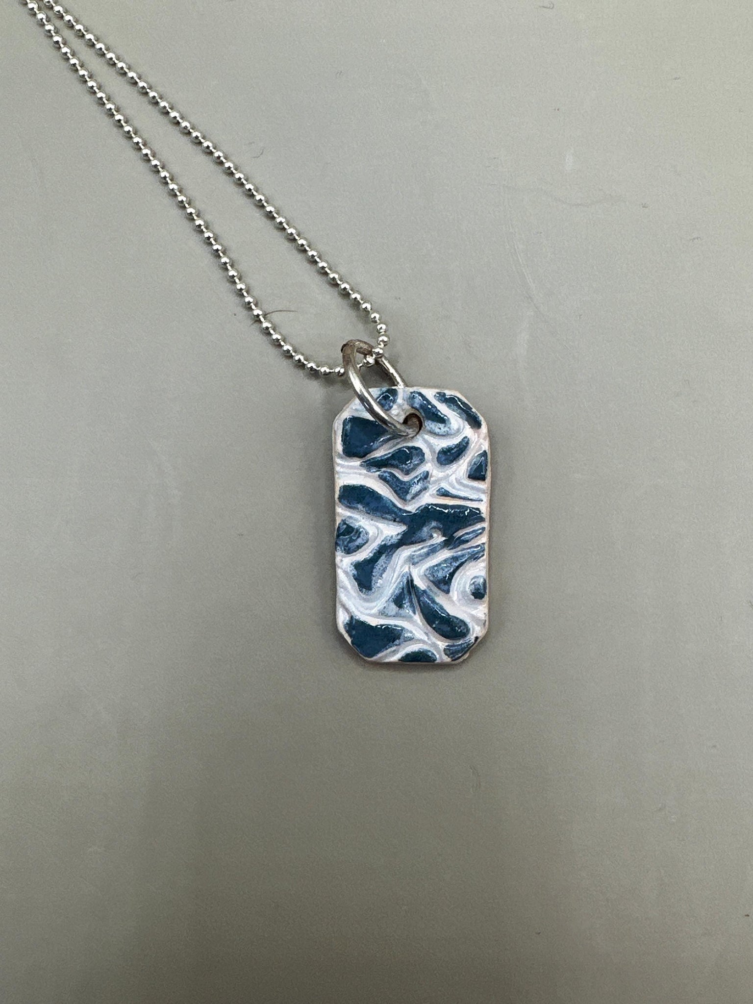 Ceramic pendant on silver ball chain. Textured clay with blue underglaze and clear glaze on white clay. Handmade and unique. Each pendant is different.
