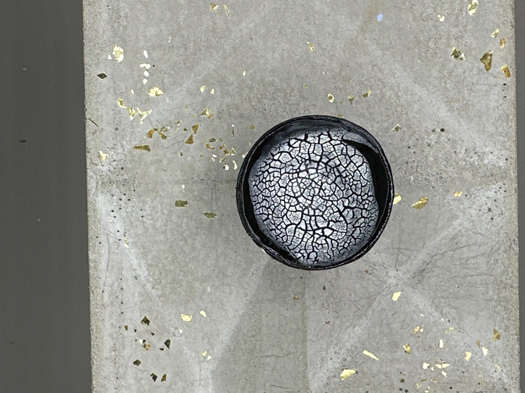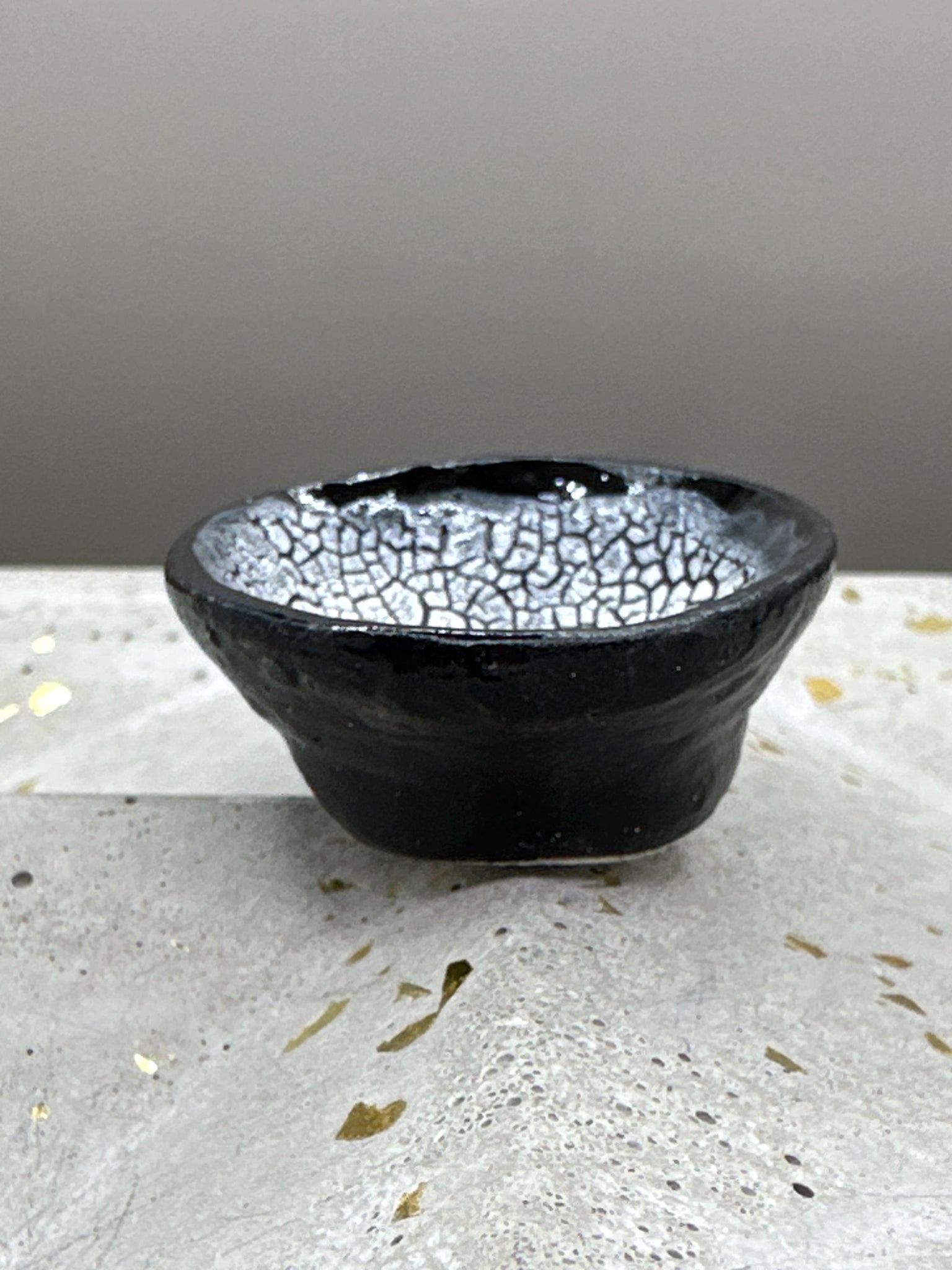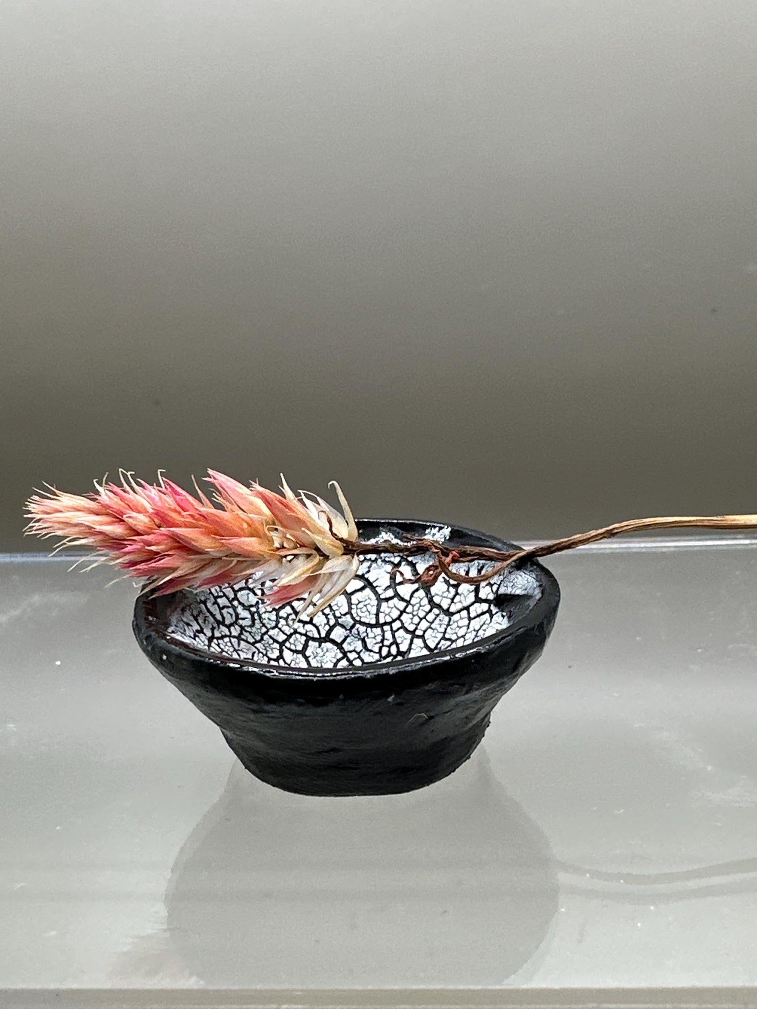 Hand thrown tiny ceramic bowl. White crackle glaze on black. Comes with small dried flower shown. One-of-a-kind. You will receive this exact vase.