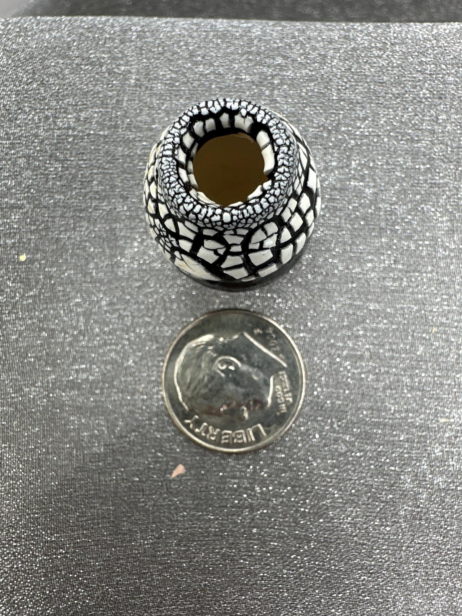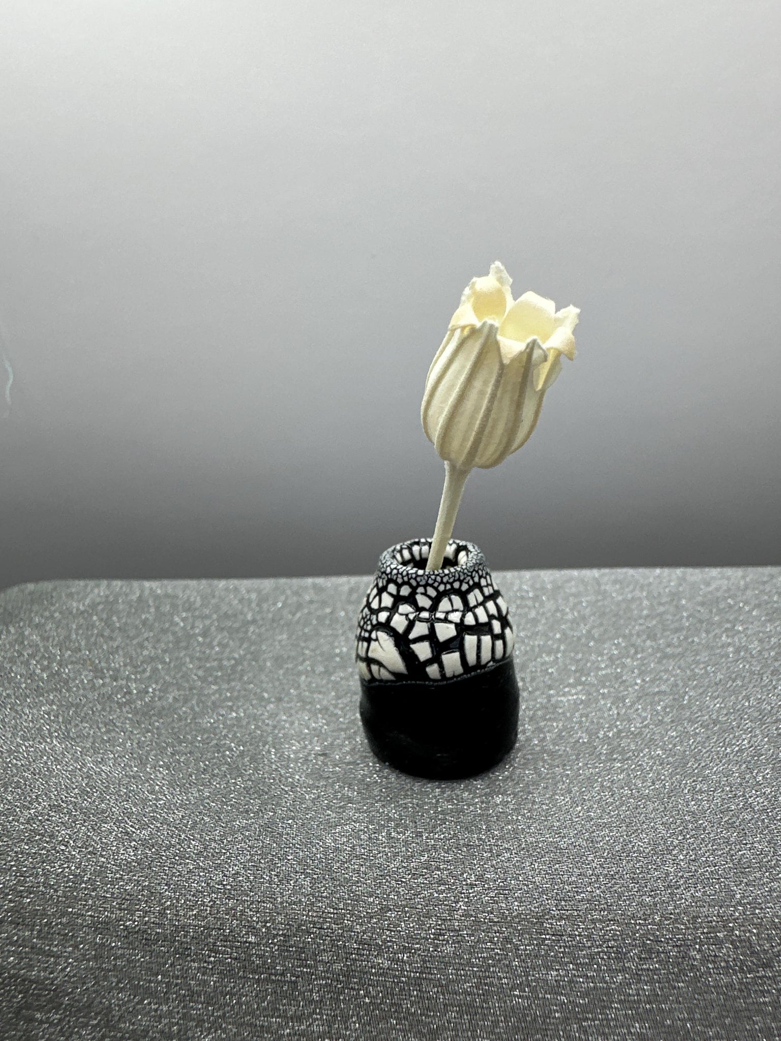 Hand thrown tiny ceramic vase. White crackle glaze on black. Comes with small dried flower shown. One-of-a-kind. You will receive this exact vase.
