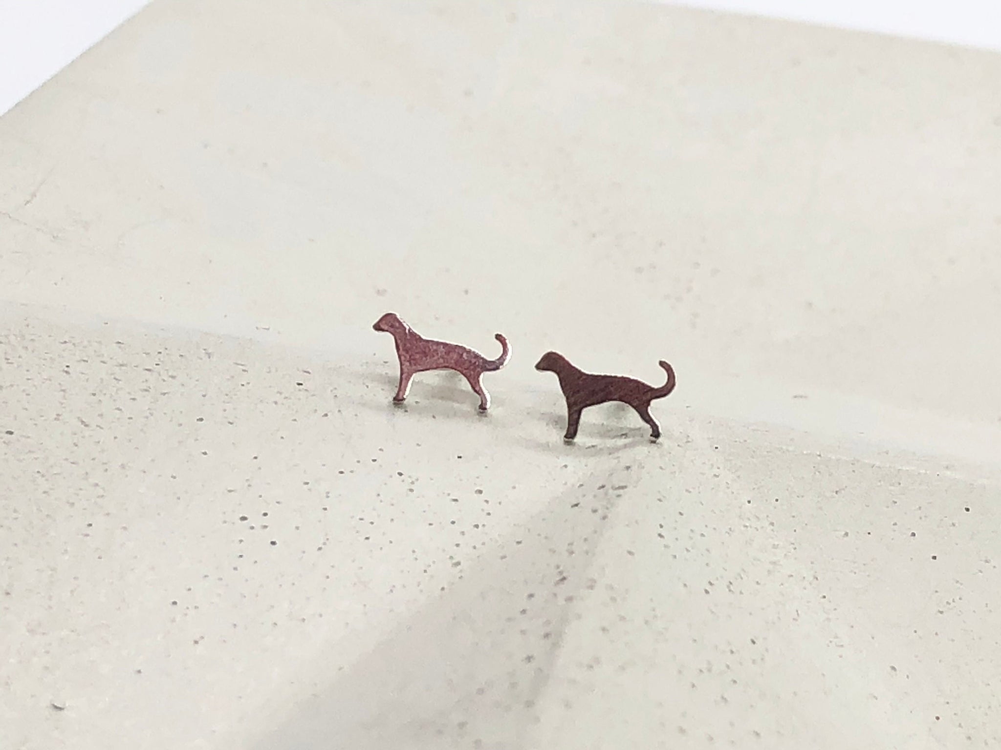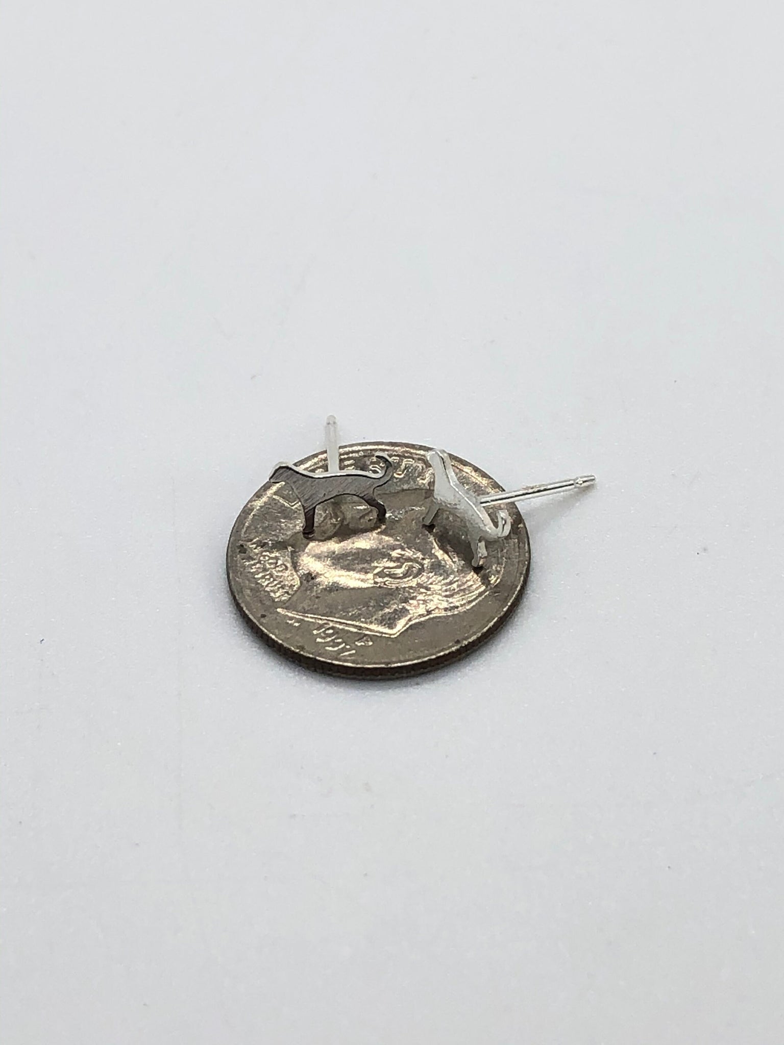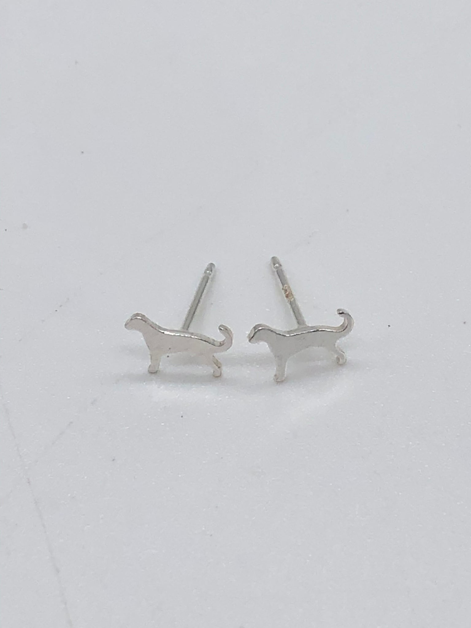 Pair of sterling silver stud earrings with very tiny silver dog cutouts.