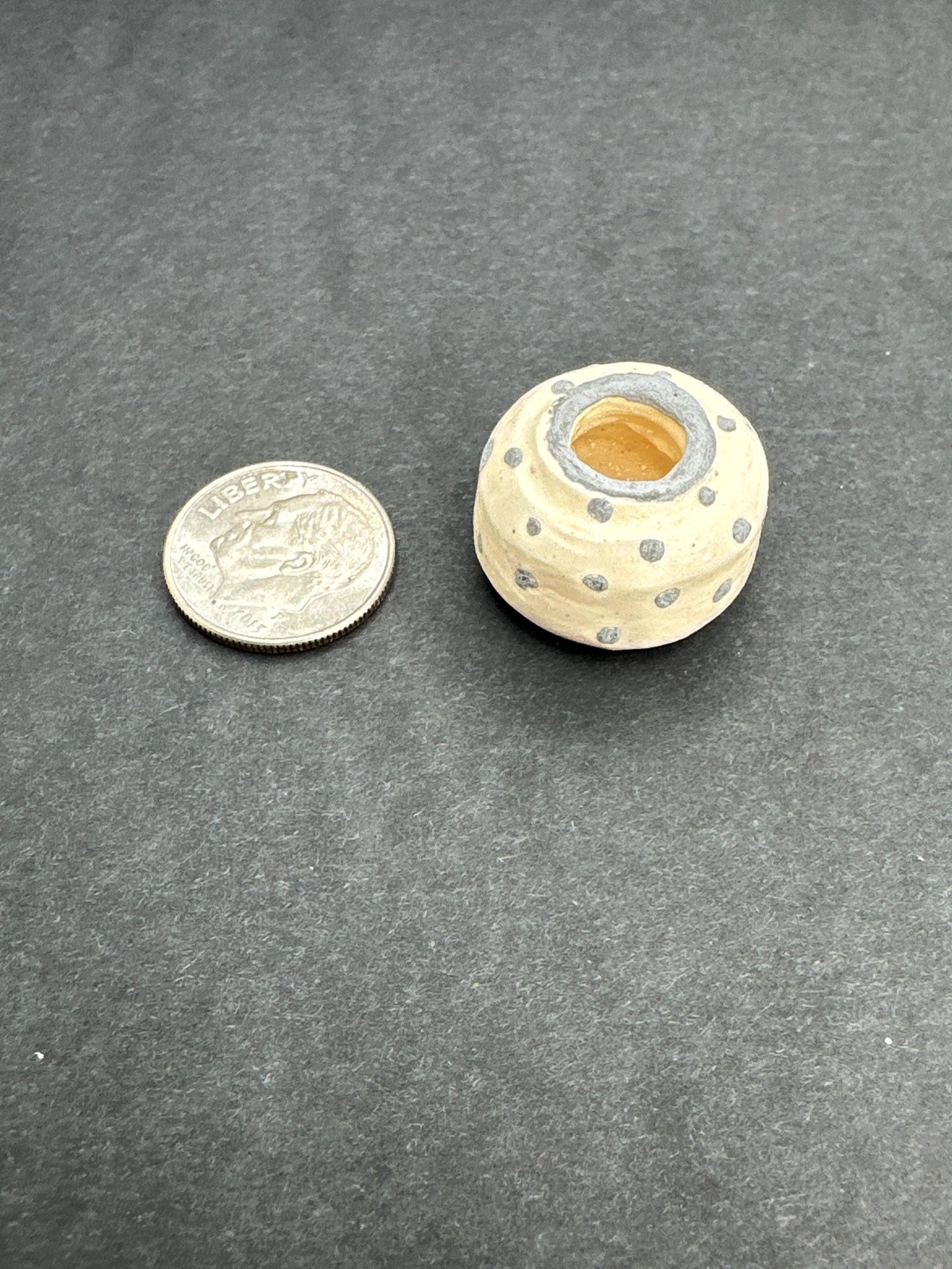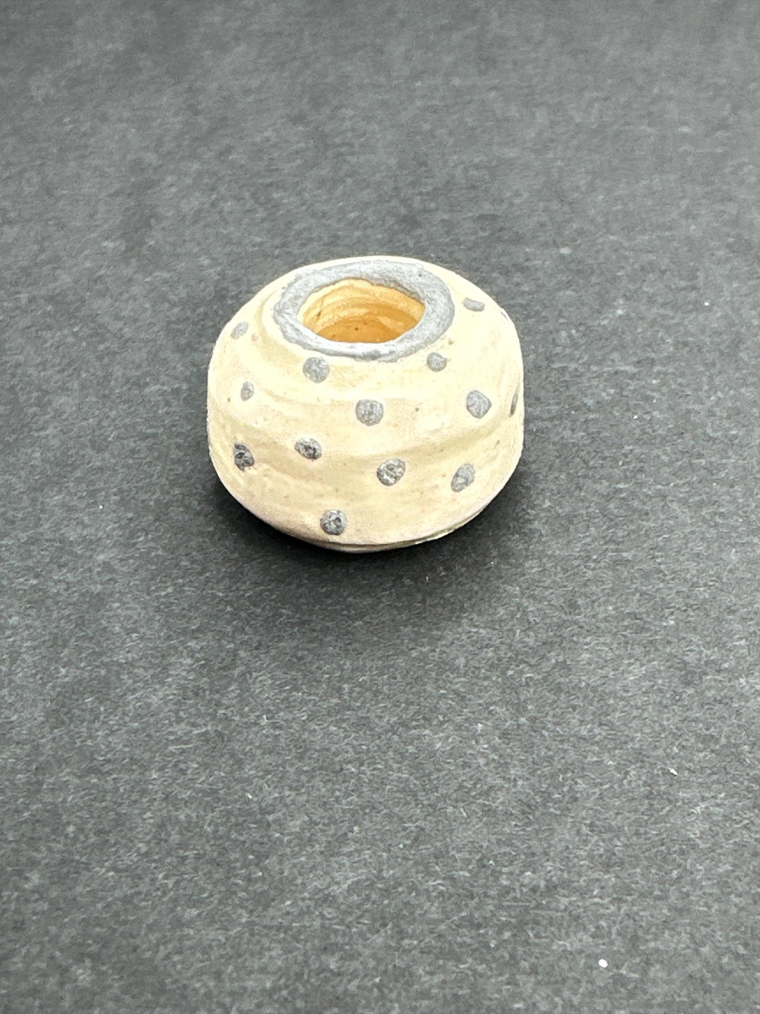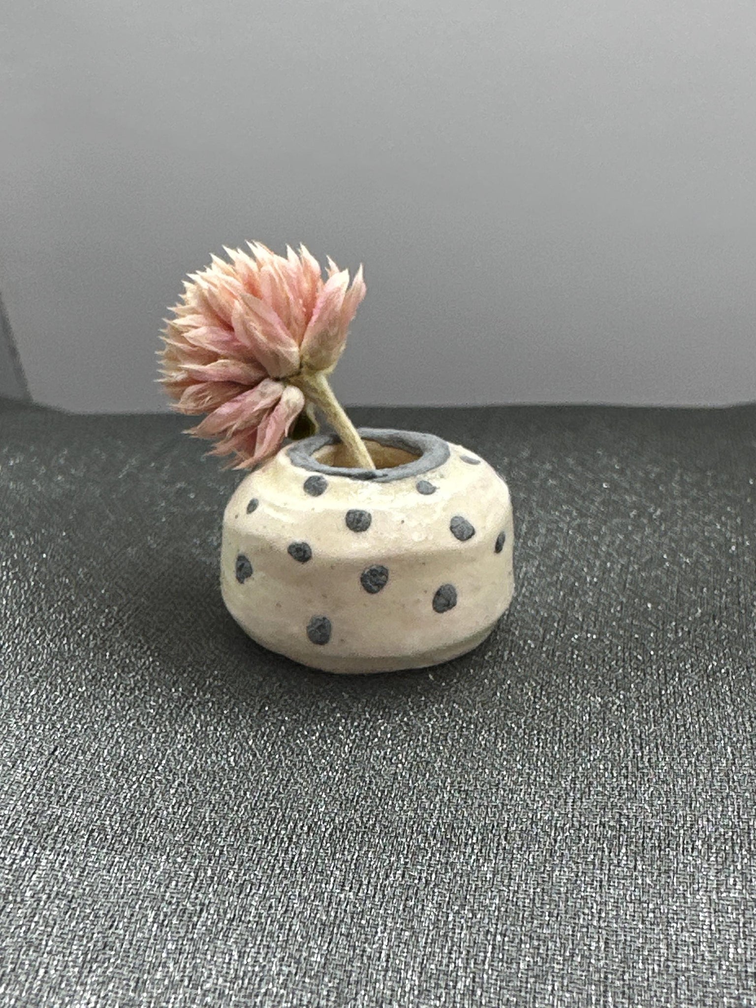 Hand thrown tiny ceramic vase. Cream glaze with raised gray spots Comes with small dried flower shown. One-of-a-kind. You will receive this exact vase.