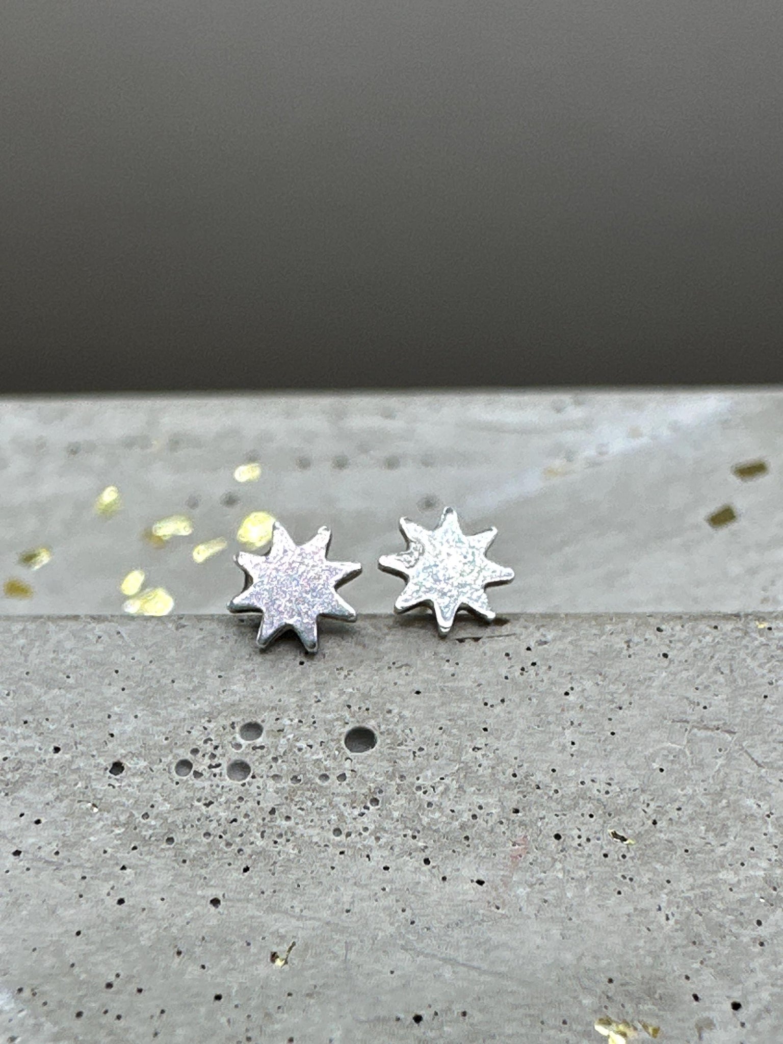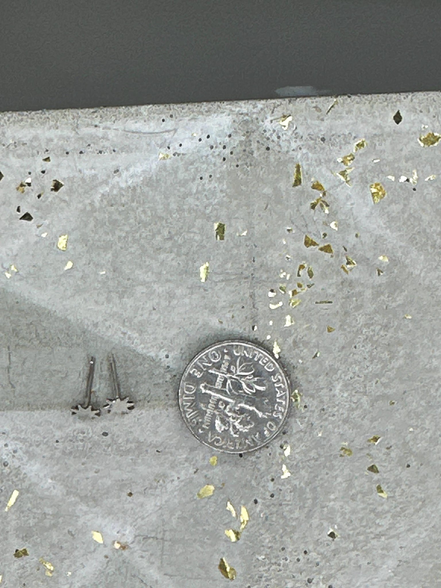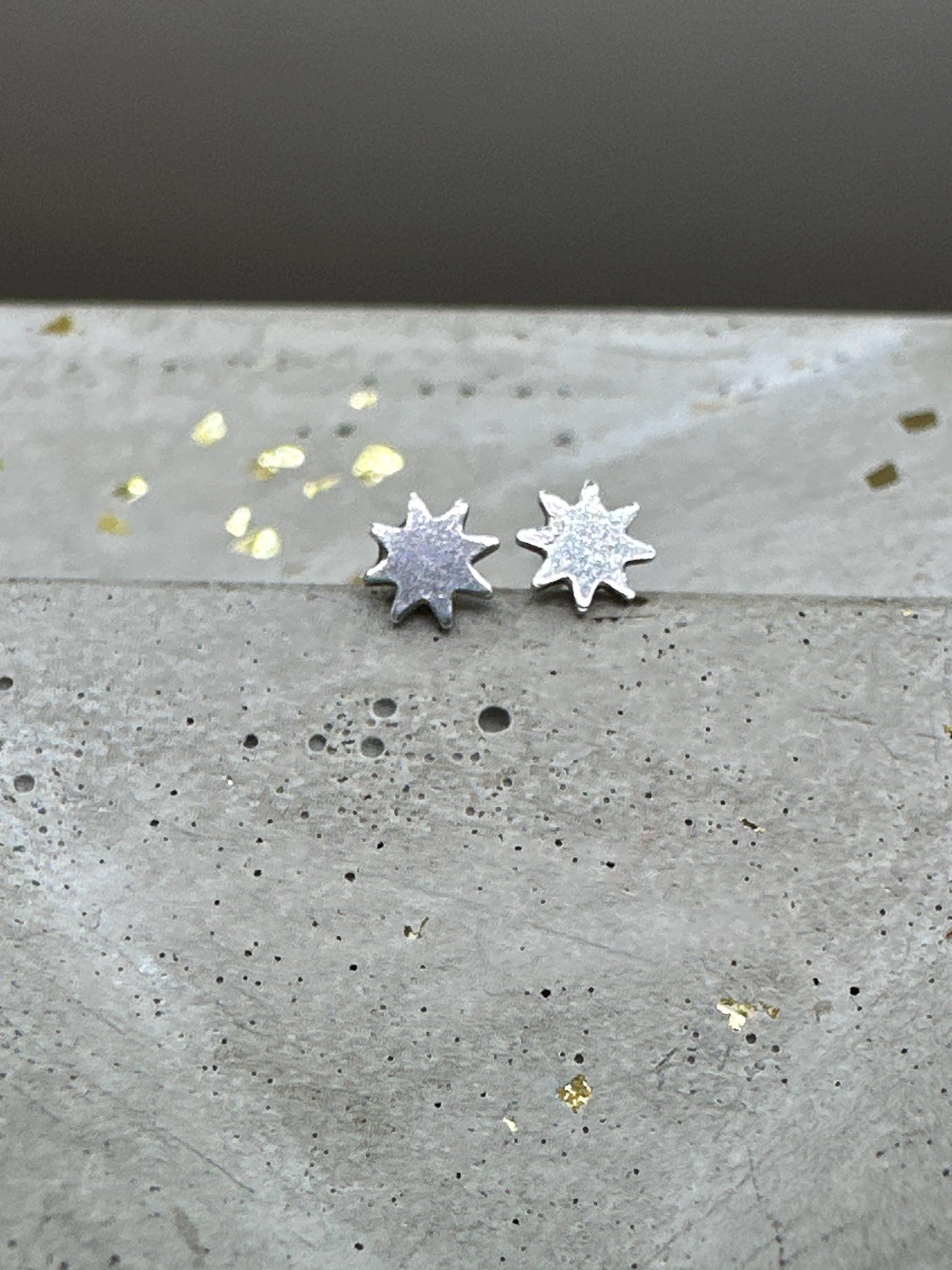 Pair of stud earrings with tiny 8-pointed sterling silver star cutout.