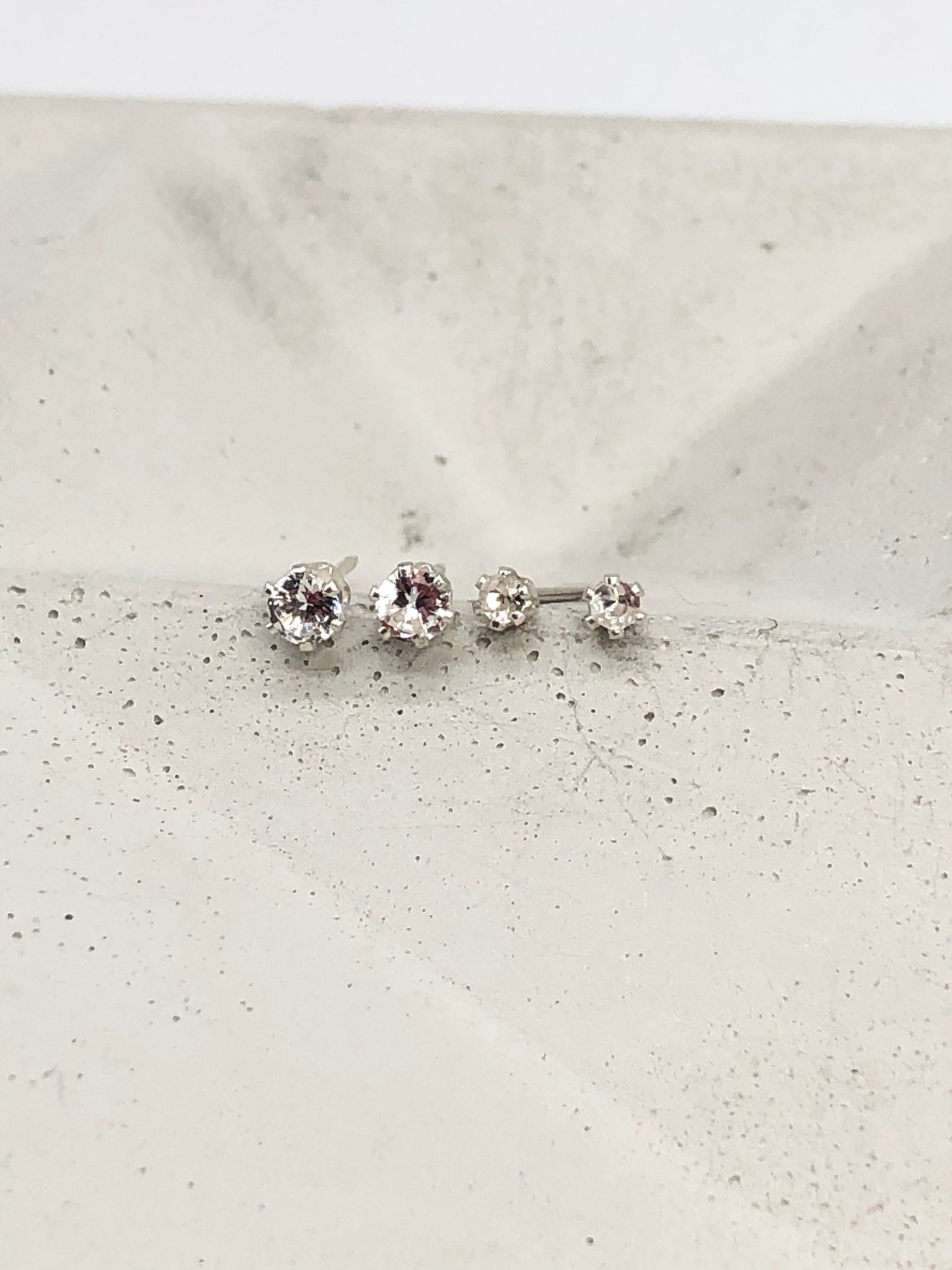 White topaz stud earrings in silver. Gemstones are 2mm in diameter. They are also available with 3mm stones.