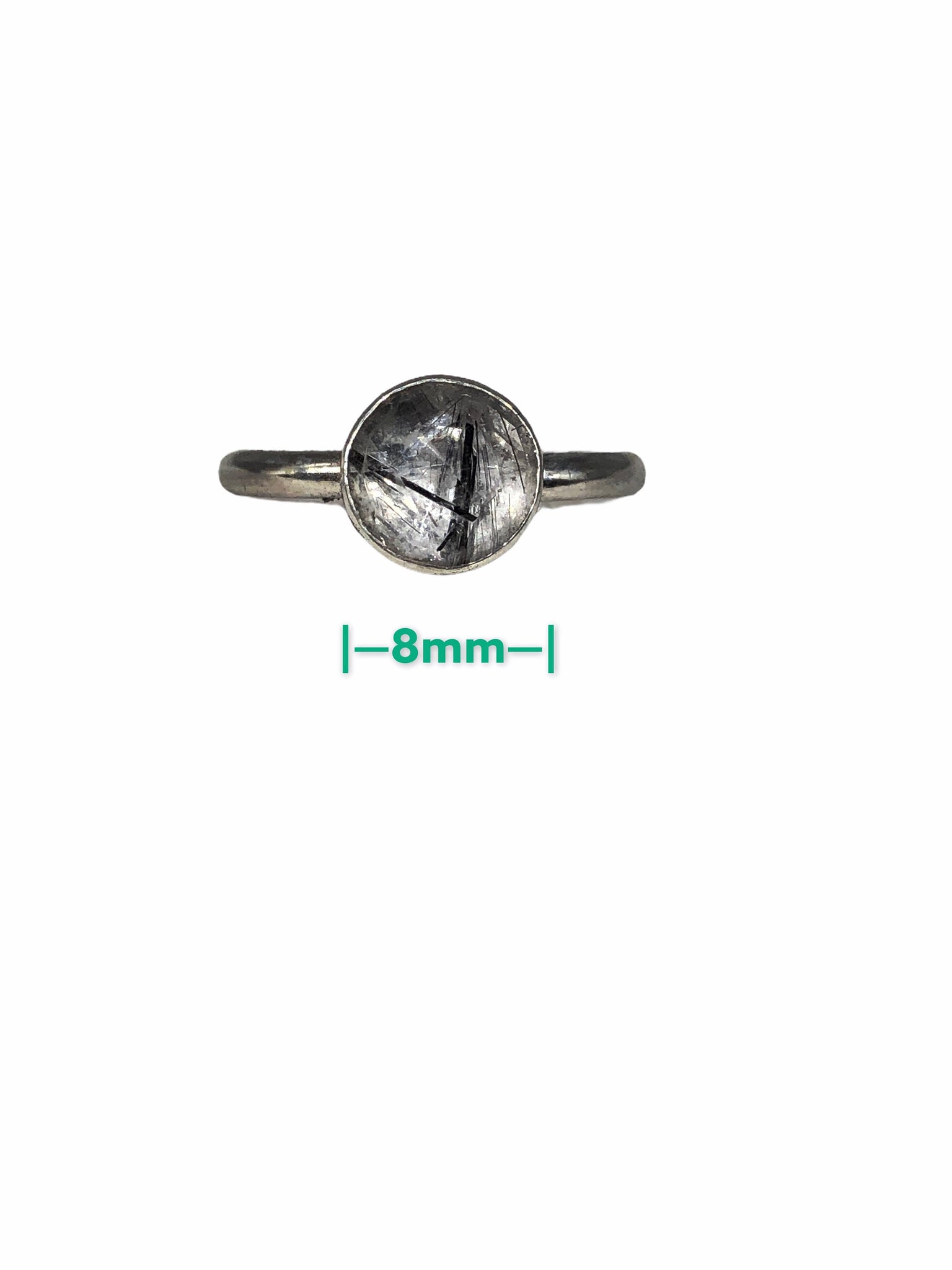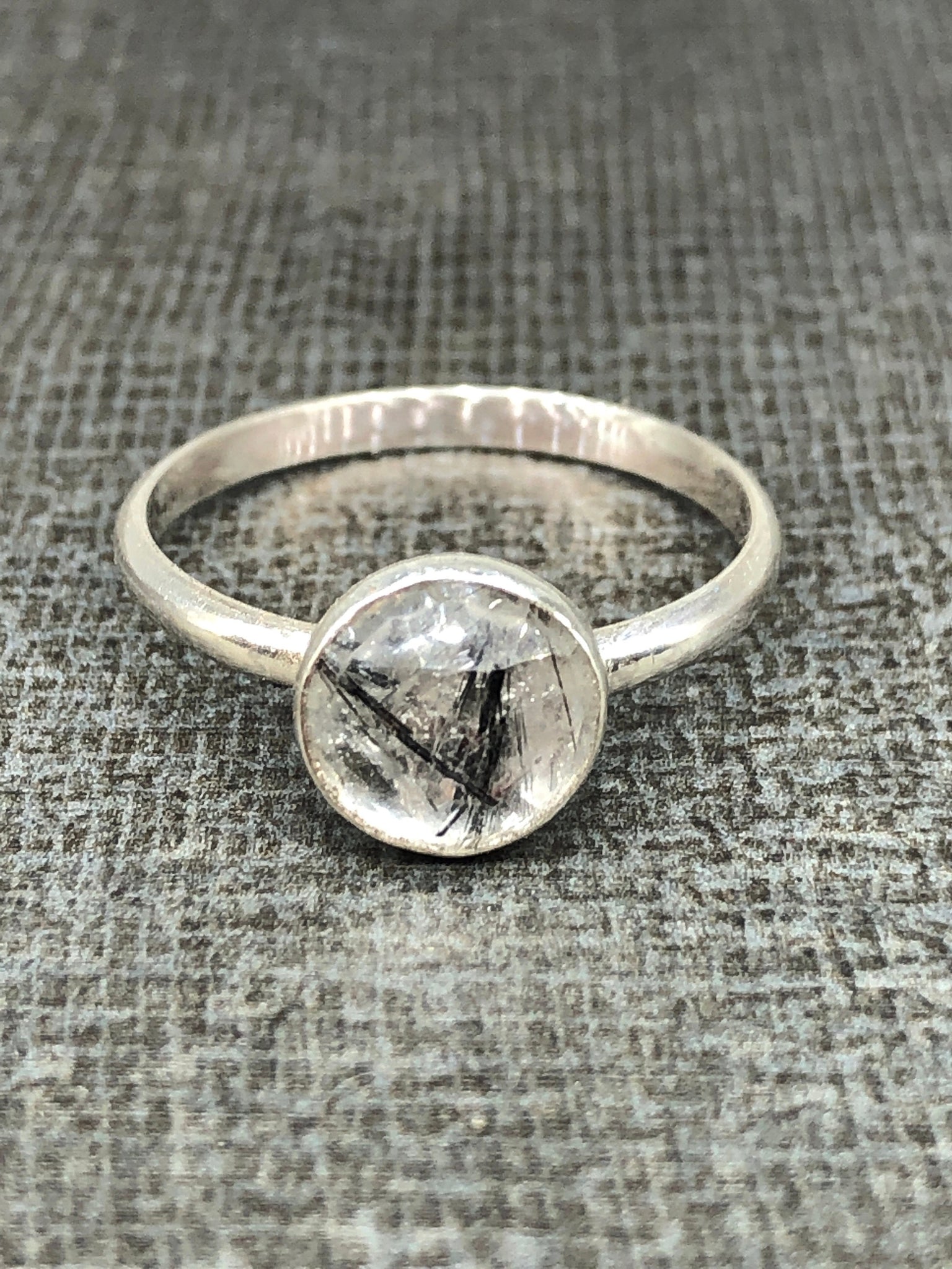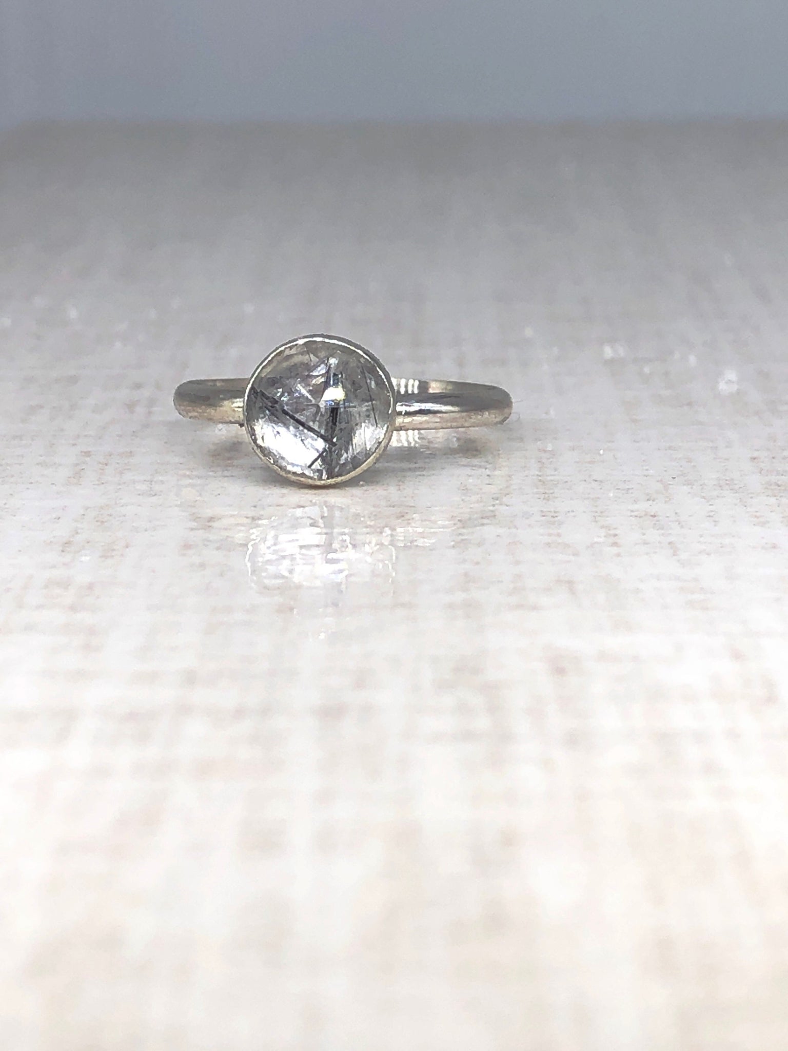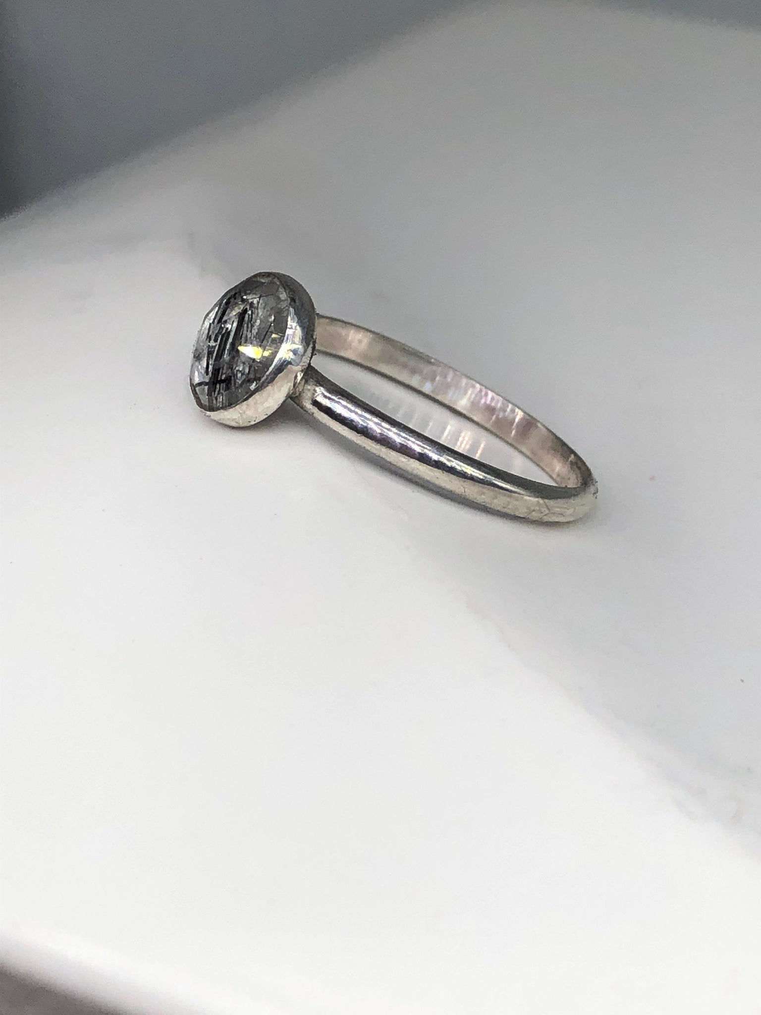 Round rose cut tourmalinated quartz stone on silver band. Simple and sparkly!