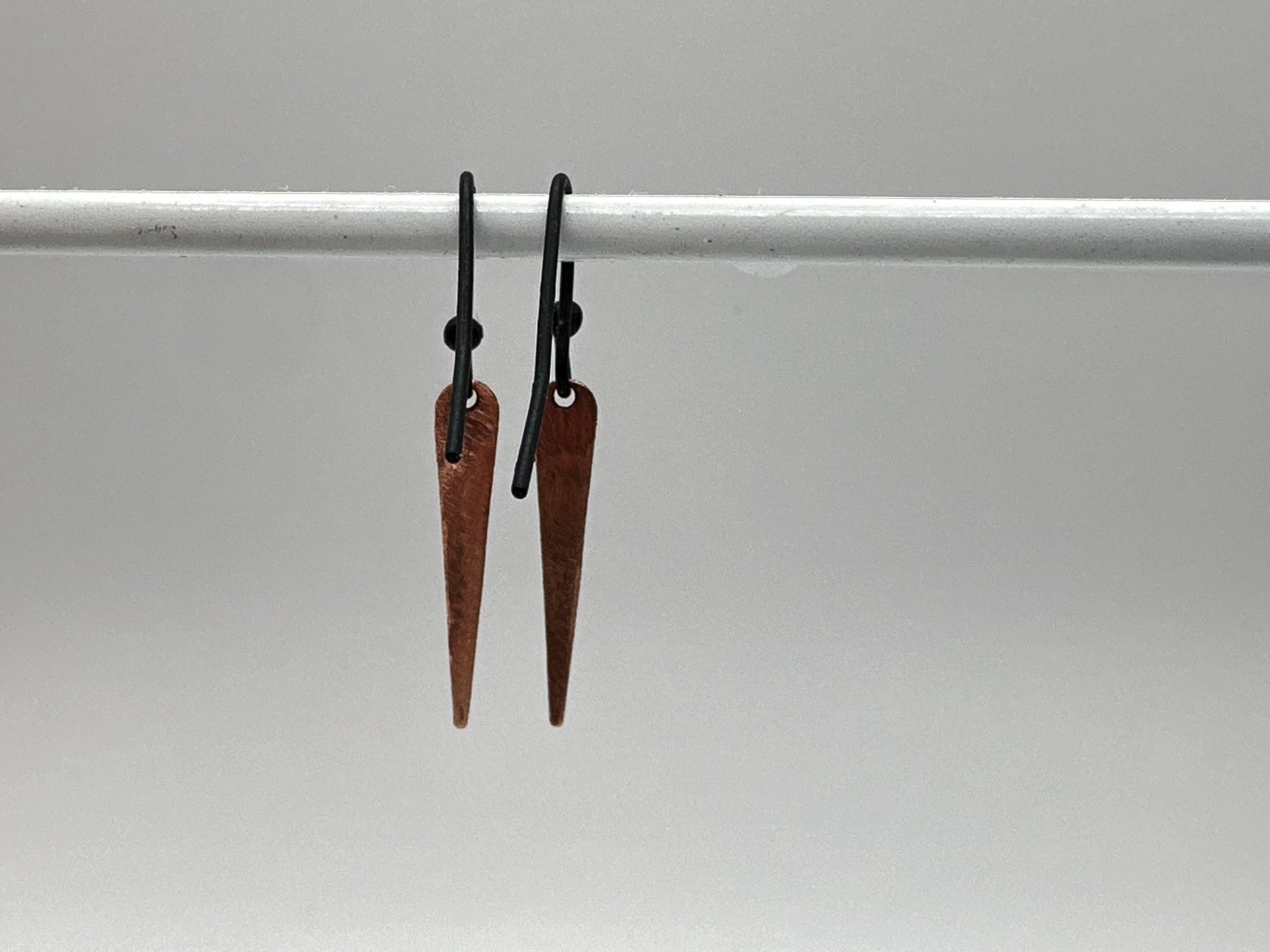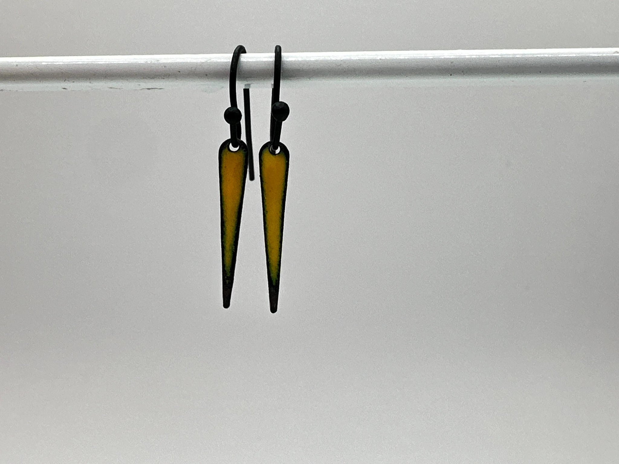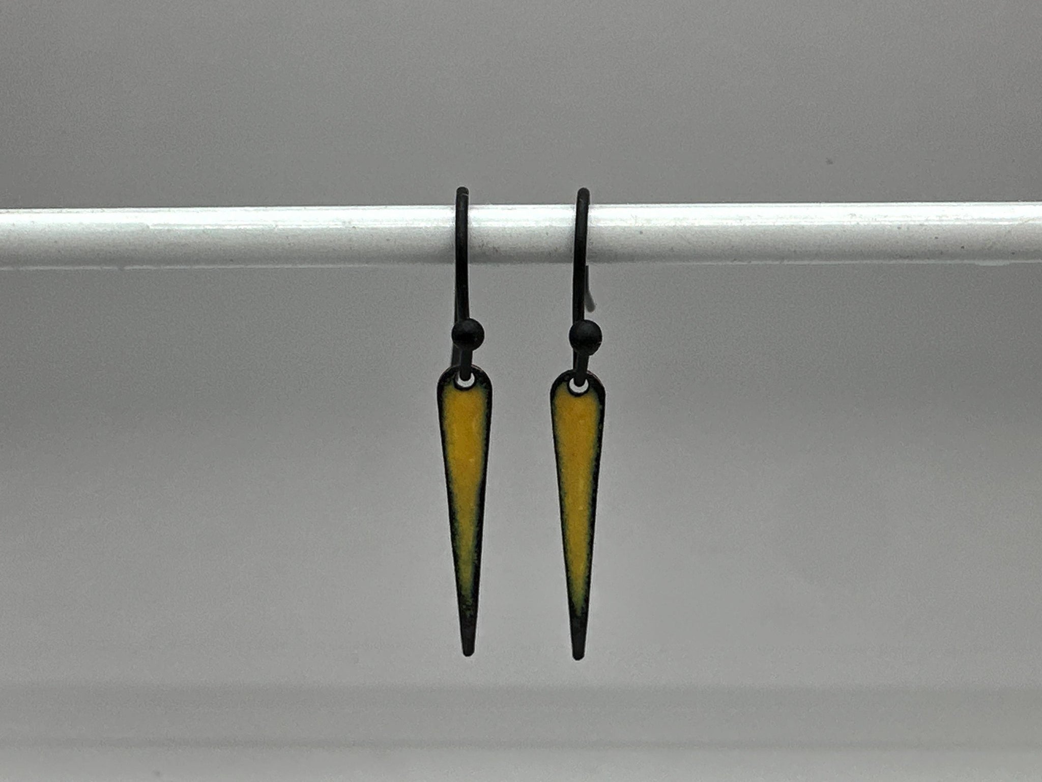 Yellow enamel on copper spike shaped drop earrings. Backs are unfinished copper. Ear wires are black finished brass.